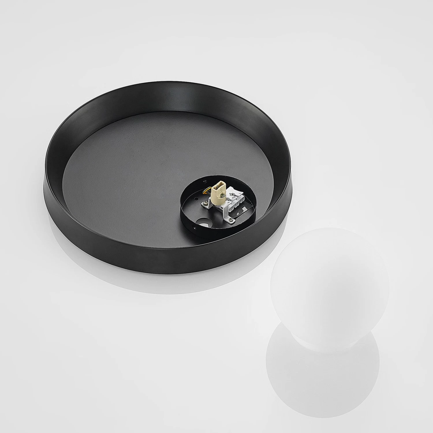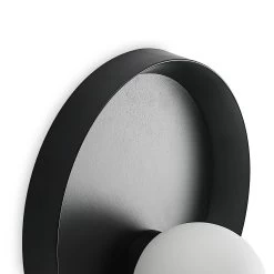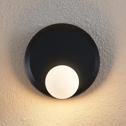 Runde Design-Wandleuchte Andelina mit schwarzer OberflĂ€che und weiĂer Glaskugel als ErgĂ€nzung im unteren Teil