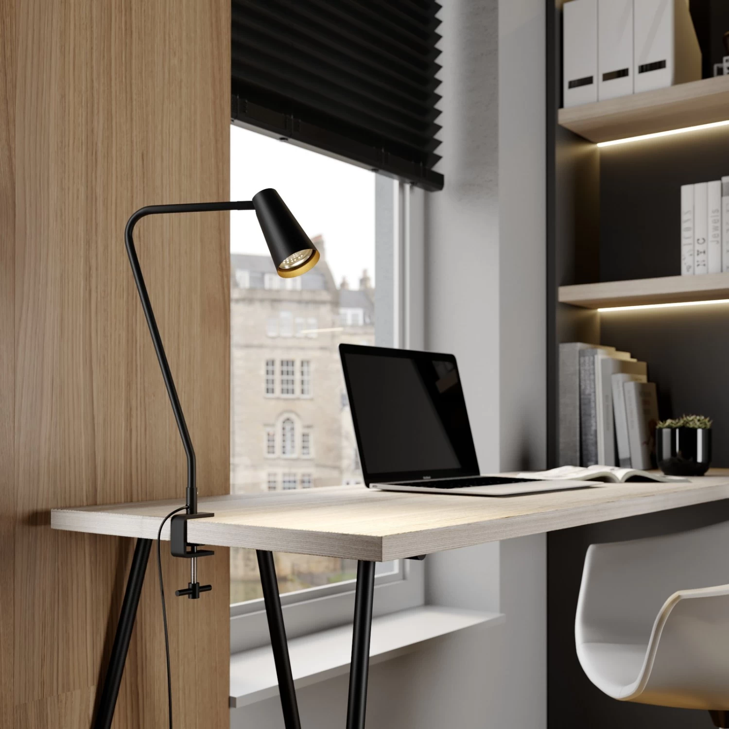 Angelina ist ein sehr eleganter Lichtspender, der zum Anklemmen an Tischkanten konzipiert worden ist und dadurch einen sicheren Halt erfĂ€hrt und sich auch dort anbringen lĂ€sst, wo nicht genug Platz fĂŒr einen herkömmlichen LeuchtenfuĂ ist. Das Gestell ist wie der Schirm aus Metall gefertigt, lediglich die Schirminnenseite hebt sich farblich ab, da sie golden schimmert und somit sowohl zu einer besonderen Optik beitrĂ€gt als auch die Lichtwirkung warmtönig beeinflusst. Der schmale, becherförmige Lampenschirm lĂ€sst sich schwenken, wodurch man ihn besser ausrichten kann, und ein Schalter befindet sich an der Leuchte, damit man Angelina schnell ein- und ausschalten kann.