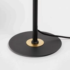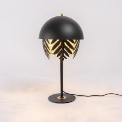Aparas ist eine Tischleuchte, die sehr dekorativ wirkt mit ihrem besonderen Design. Der ganze Leuchtenkörper besteht aus Eisen und besitzt ein schwarzes OberflĂ€chenfinish, das markant wirkt und die Leuchte zu einem Hingucker macht. Der Lampenschirm gleicht einer Halbkugel, die um dekorative FarnblĂ€tter ergĂ€nzt wurde, und die Innenseite ist golden, damit ein wirkungsvoller und doch harmonischer Kontrast entsteht, der Lichtbild und Optik gleichermaĂen beeinflusst. Der FuĂ ist rund und die Steckerzuleitung ist textilummantelt fĂŒr einen hochwertigen Look, der Schalter befindet sich darin.
