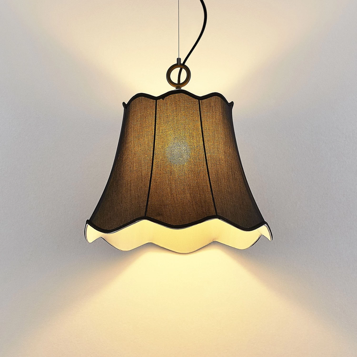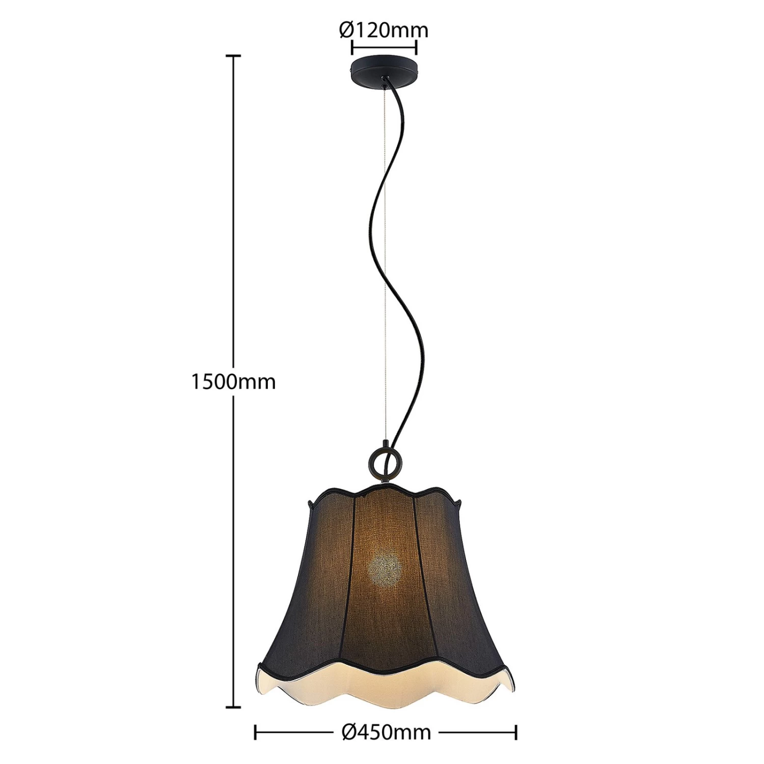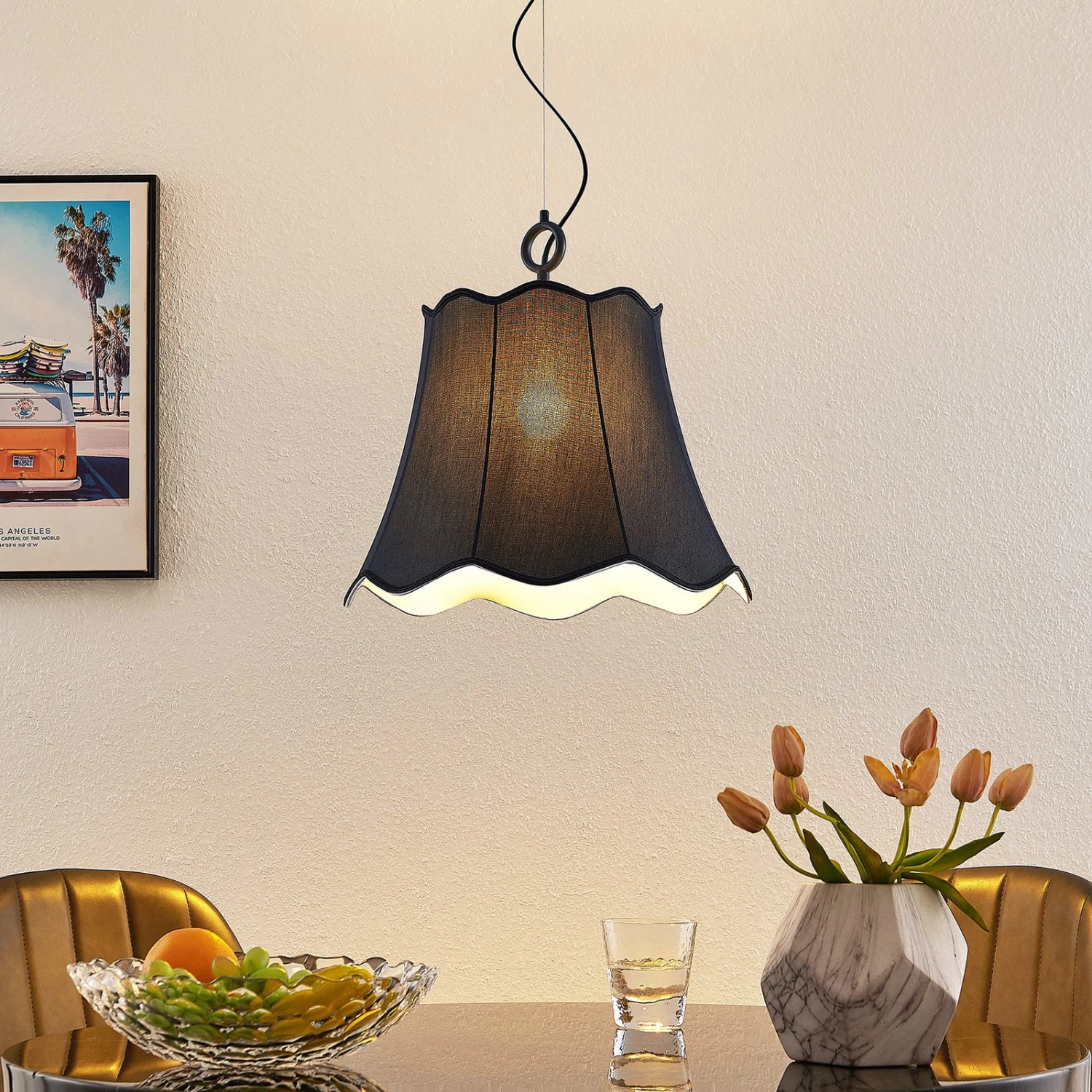 Traditionell wirkende HĂ€ngeleuchte Binta mit schwarzem Stofflampenschirm in Wellenoptik