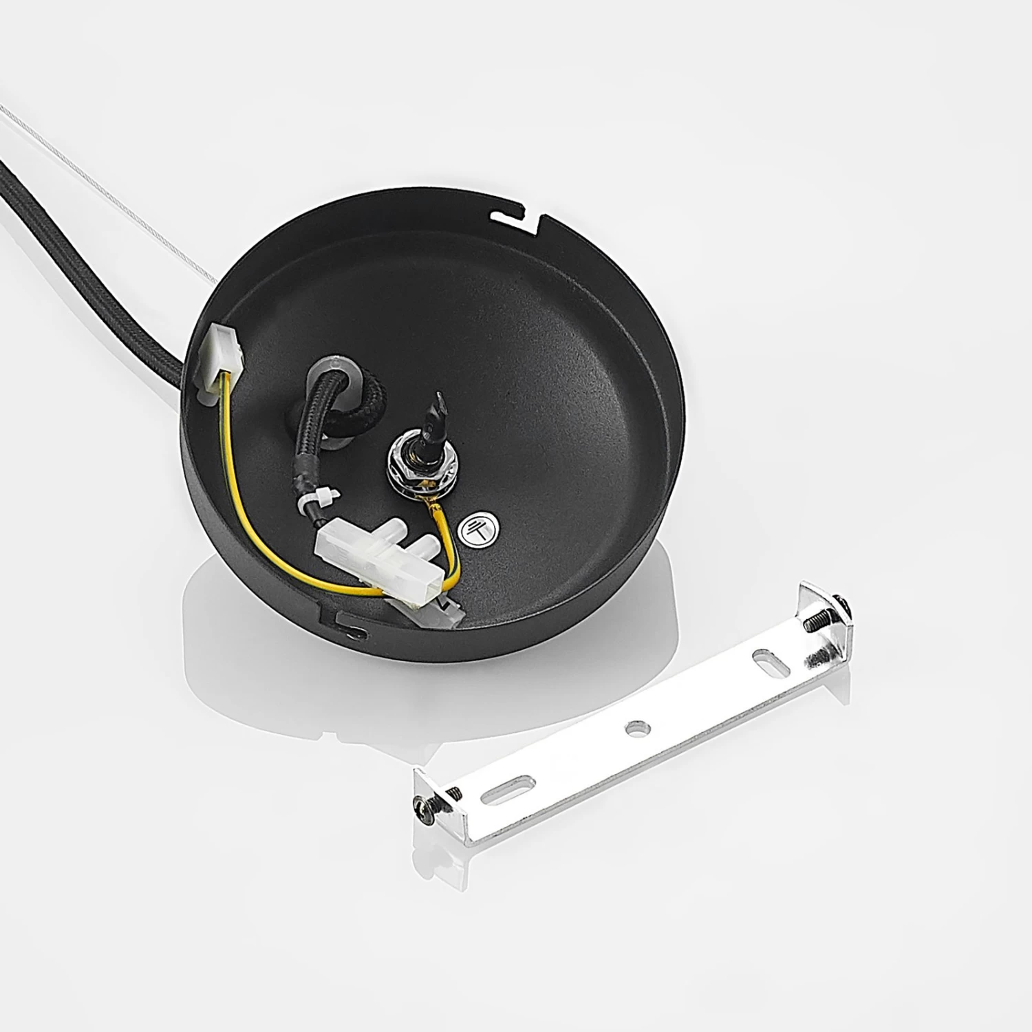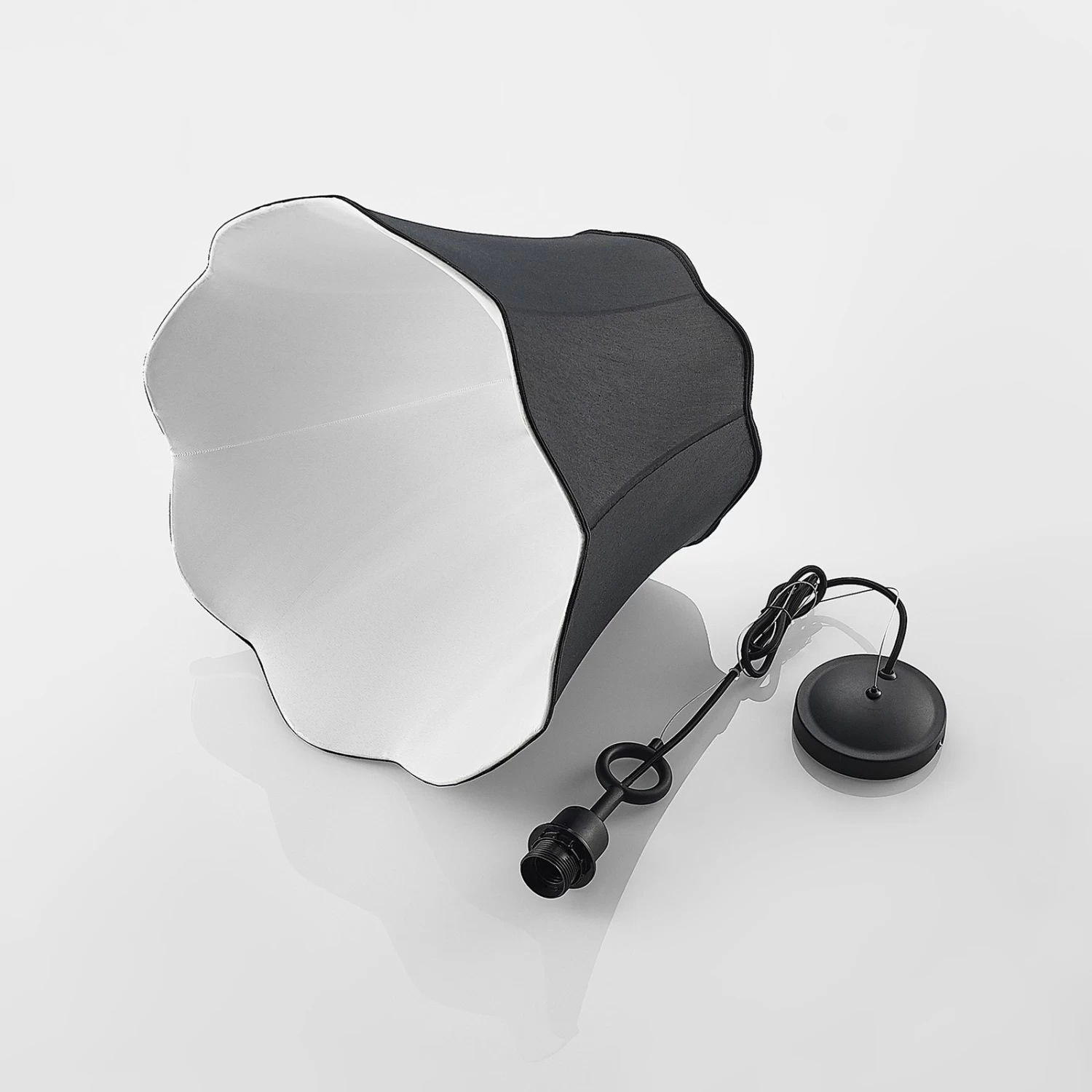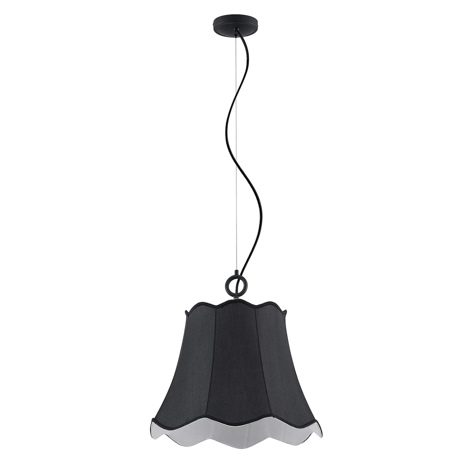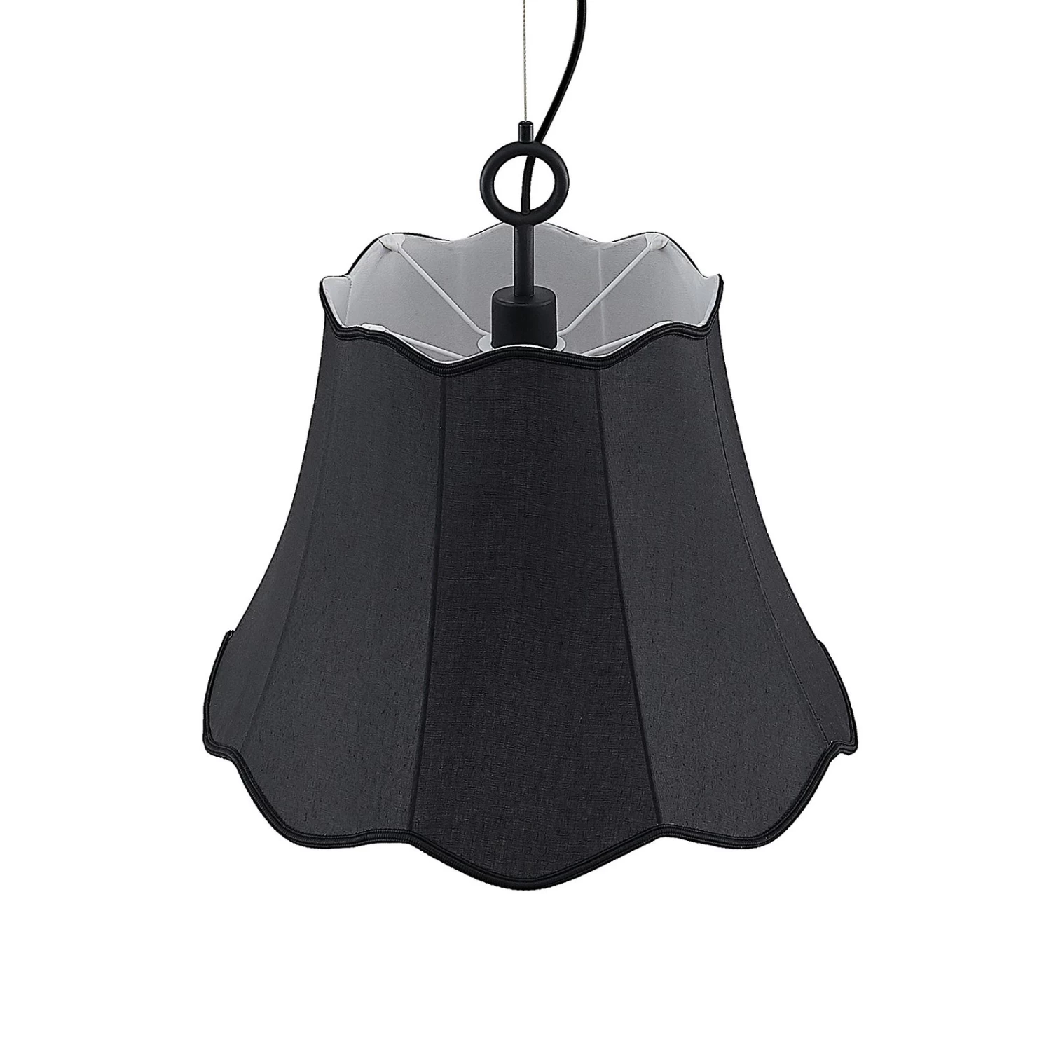Traditionell wirkende HĂ€ngeleuchte Binta mit schwarzem Stofflampenschirm in Wellenoptik
