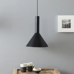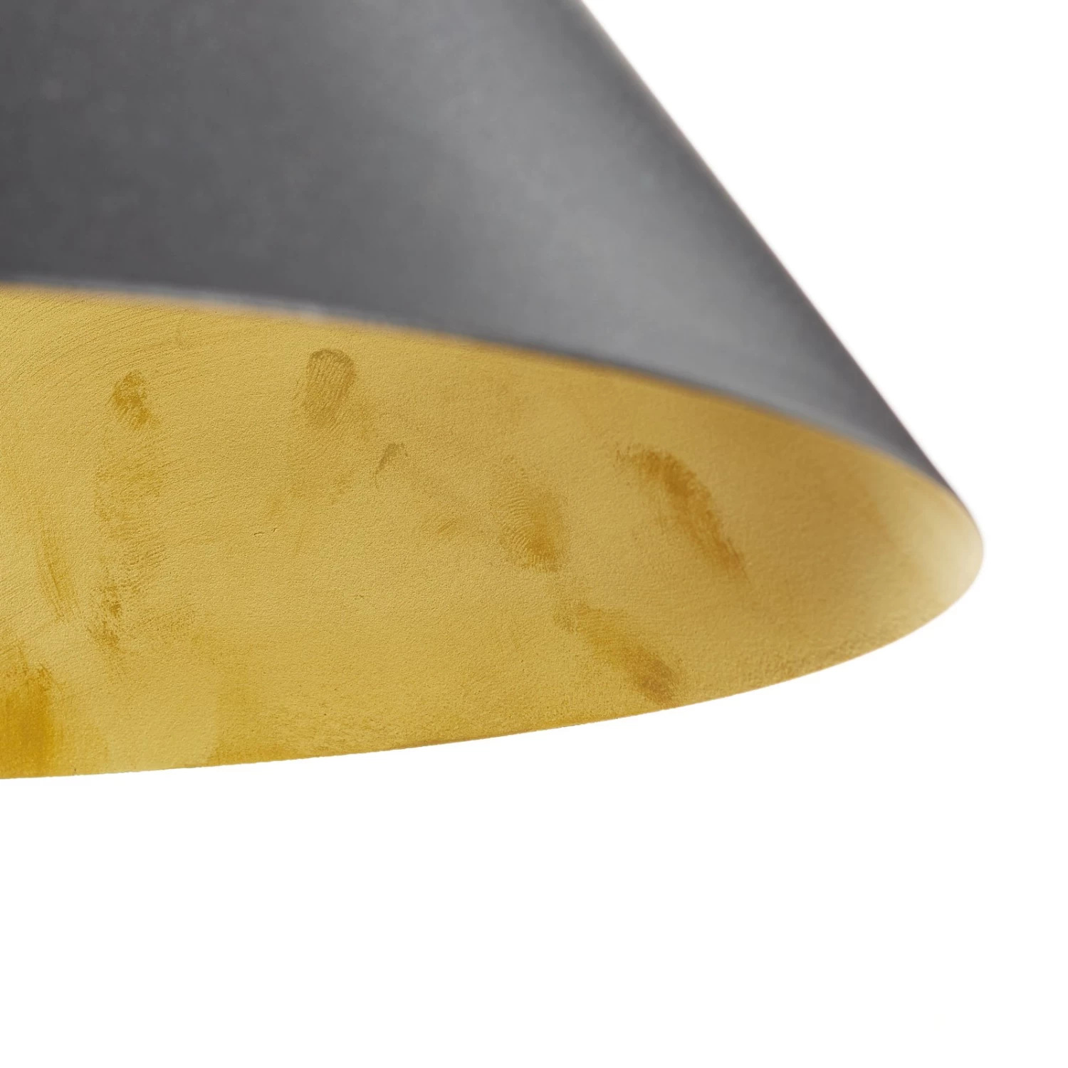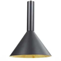 Industrieller Stil und schlichte Eleganz finden sich im Design der Pendelleuchte Caris wieder. Der Schirm ist aus Stahl gefertigt und weist eine klassische Trichterform auf. Die Außenseite des Schirmes ist matt-schwarz lackiert, während die Innenseite in auffälligem Gold gestaltet ist und einen warmen Kontrast zum kühlen Schwarz darstellt. Das Licht des Leuchtmittels wird durch die goldene Farbe reflektiert und es entsteht ein angenehmer Lichtschein, der beispielsweise im Esszimmer für eine behagliche Atmosphäre sorgt.