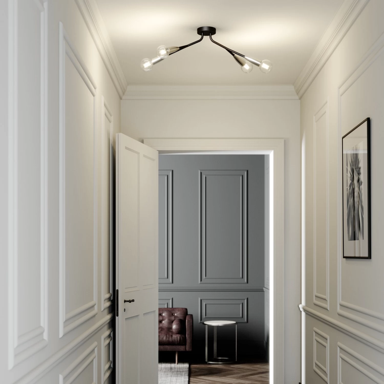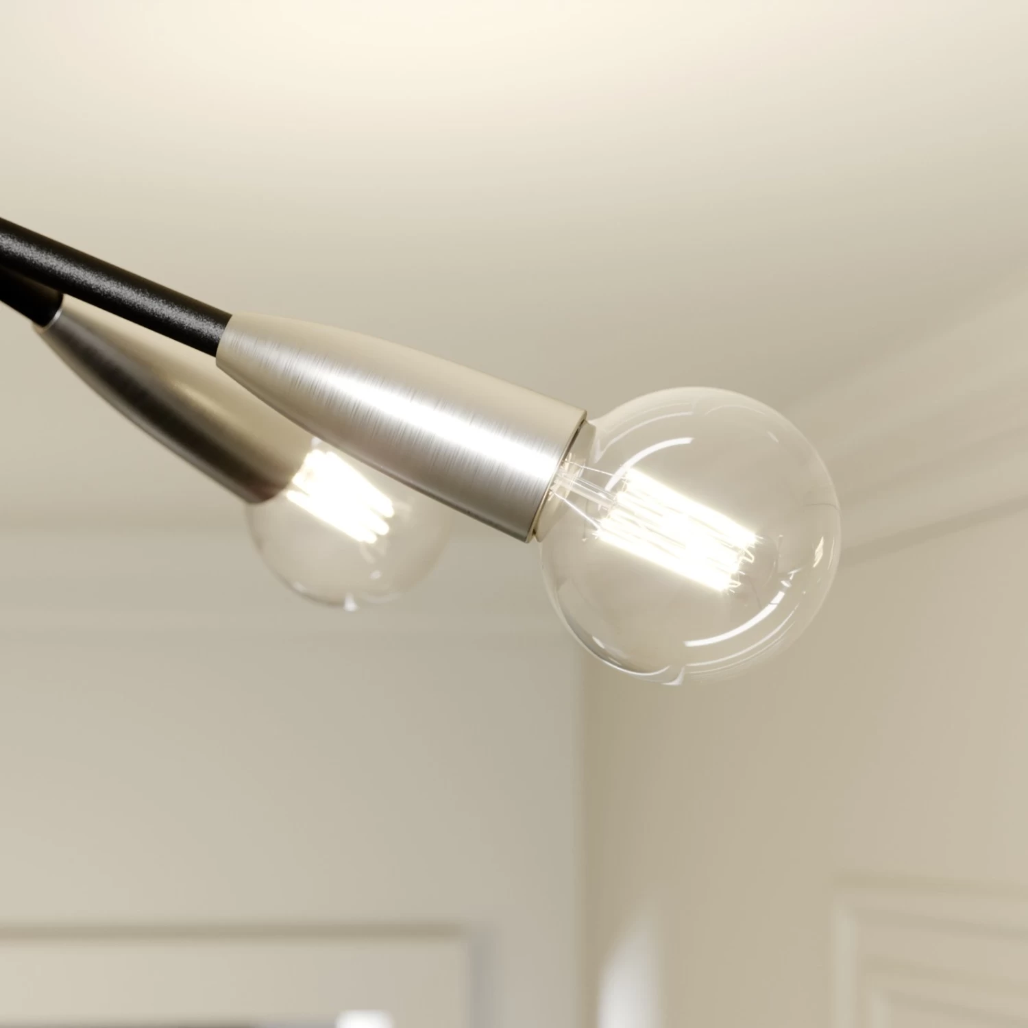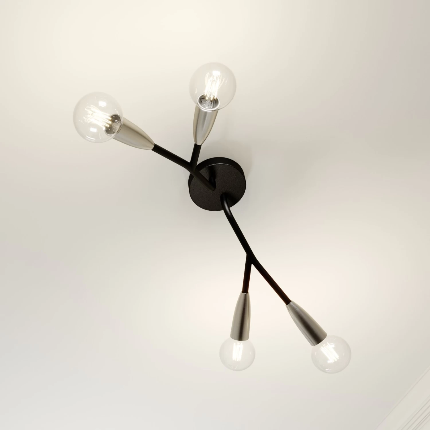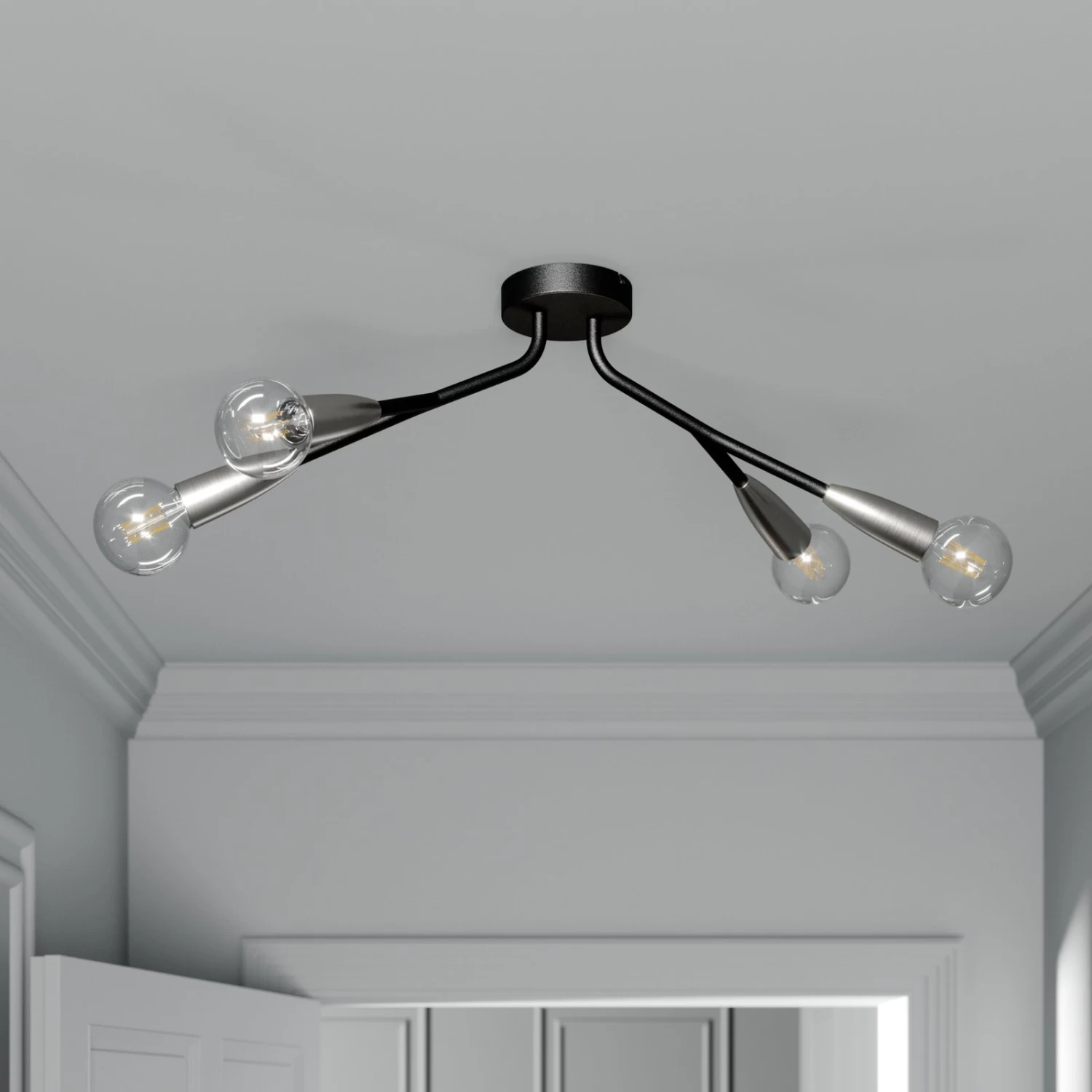 Carlea ist fĂŒr den Betrieb mit E27-Lampen gedacht und hat insgesamt vier Fassungen, die sich im Gegensatz zu dem Rest des Gestells, das in mattem Schwarz gehalten ist, durch eine nickelfarbene OberflĂ€che in einem silbrigen Farbton hervorheben. So entsteht ein ansprechener Kontrast mit moderner Wirkung. Als Deckenleuchte eignet sich Carlea fĂŒr den Betrieb in vielen modernen WohnrĂ€umen, es kann sich dabei um eine KĂŒche, einen Flur oder einen Wohnraum handeln. Als Leuchtmittel fĂŒr den Betrieb mit dieser Leuchte können Filamentlampen mit LED-Technologie ganz besonders empfohlen werden, weil sie mit einer schönen Optik punkten und gleichzeitig nur wenig Strom verbrauchen.