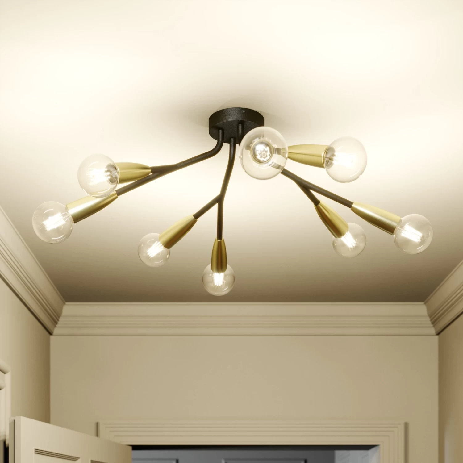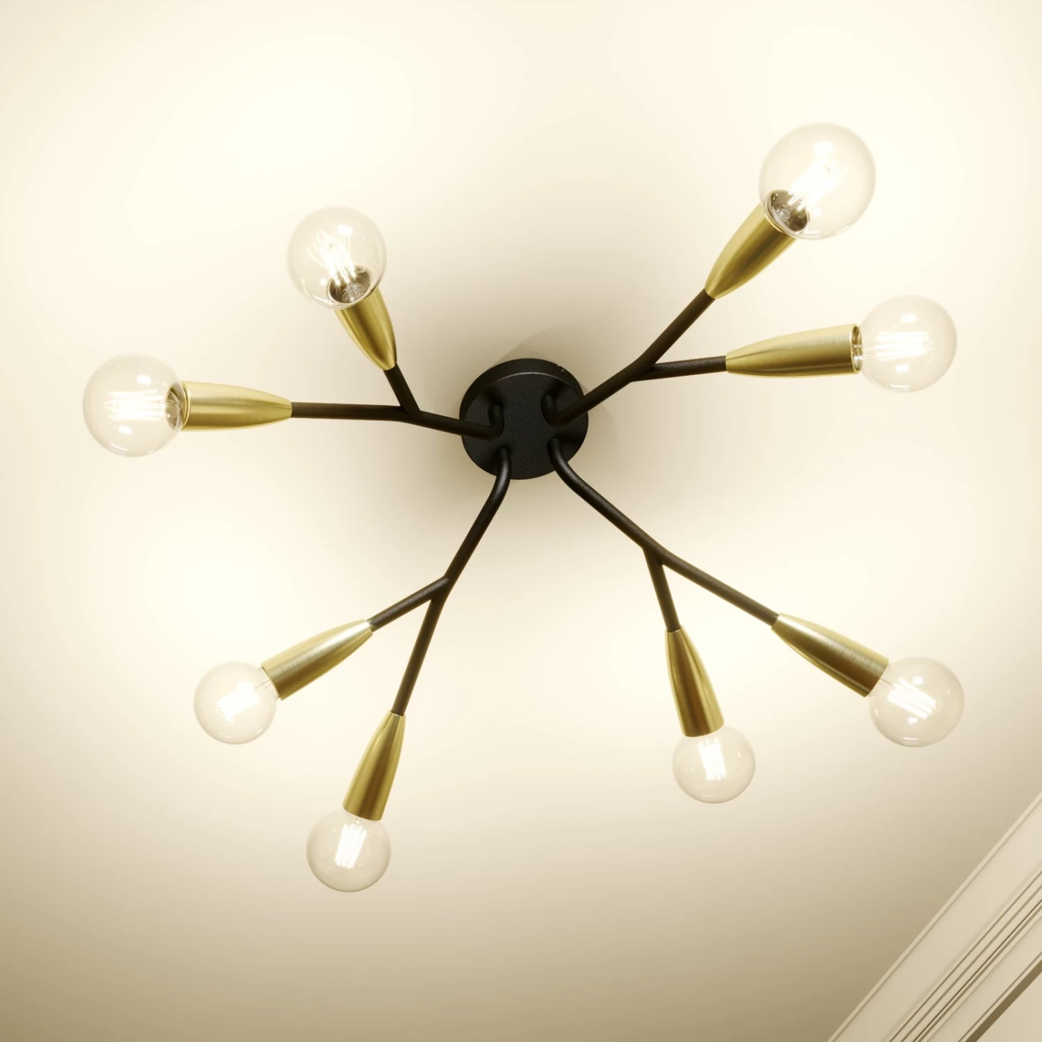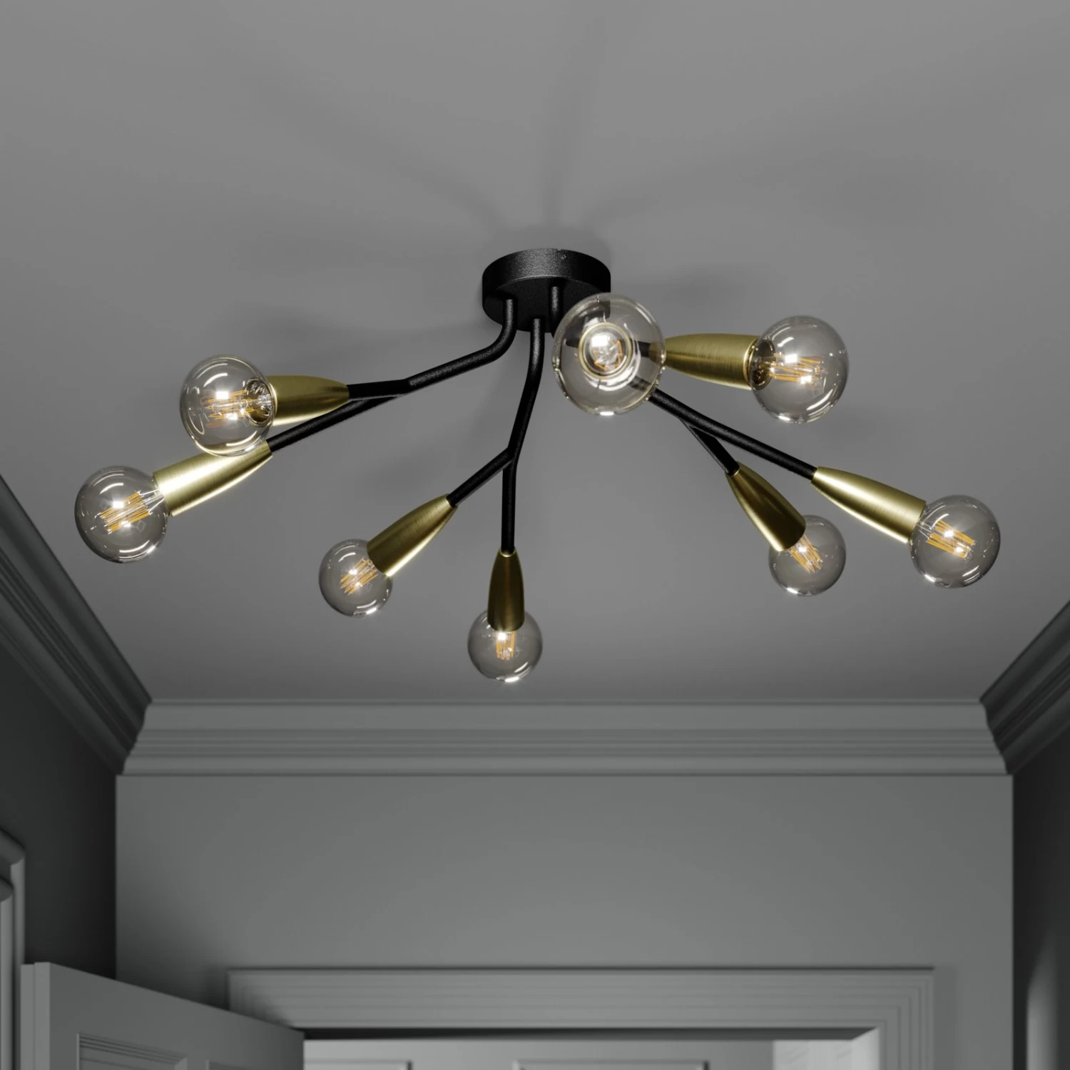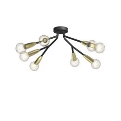 Achtflammige Deckenleuchte Carlea mit auffÀllig modernem Ausdruck, schwarz und messingfarben