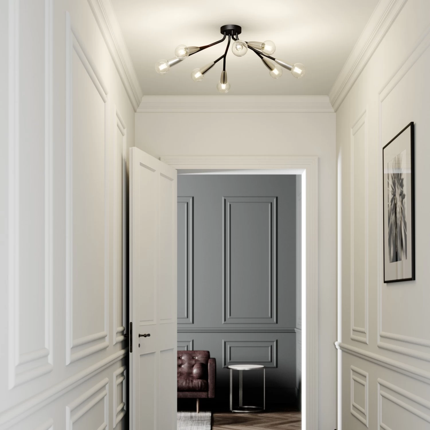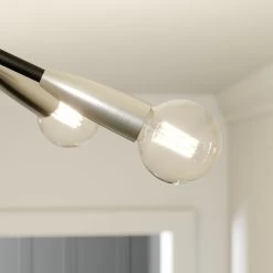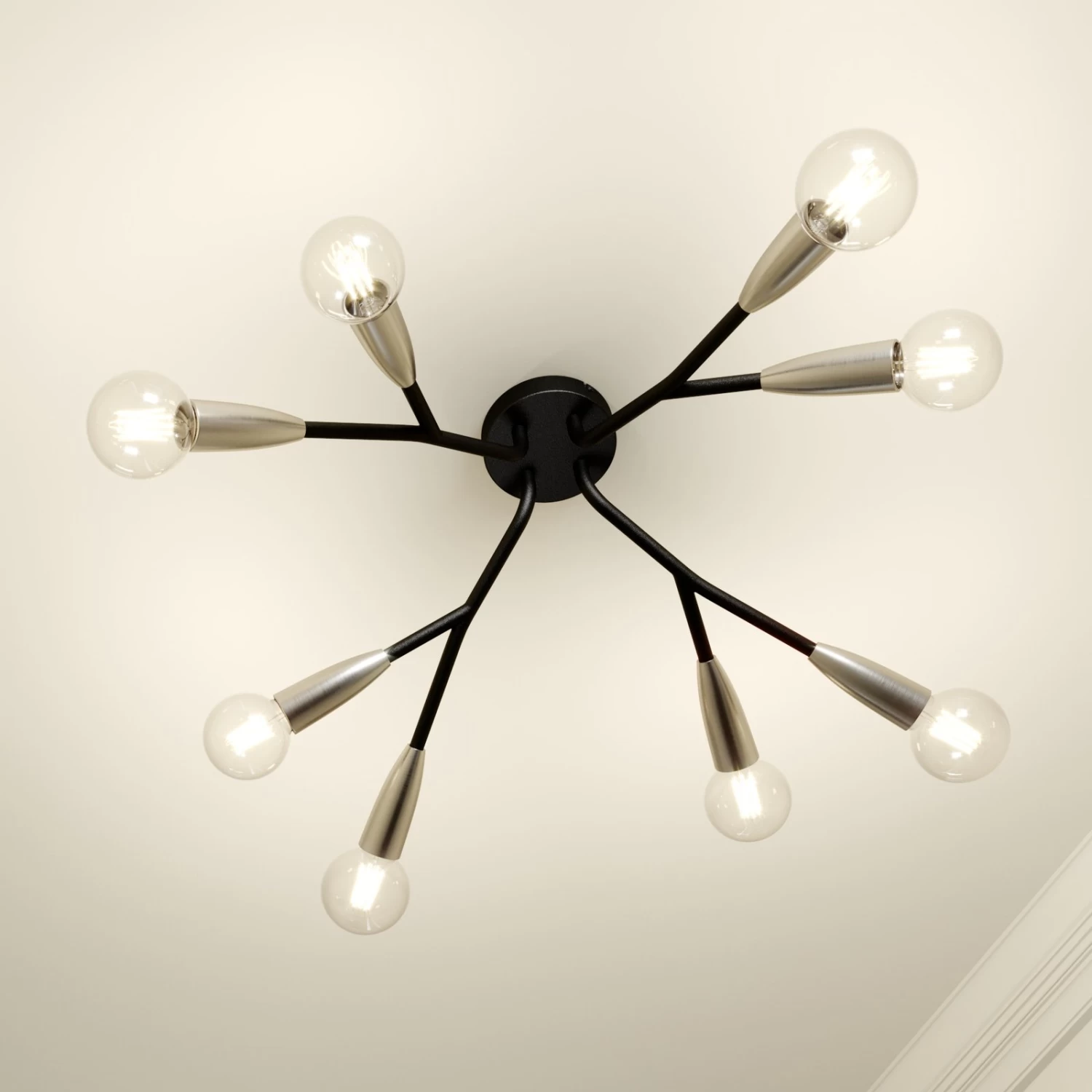 Auch fĂŒr gröĂere RĂ€ume kann die Deckenlampe Carlea gut als Grundbeleuchtung genutzt werden, denn sie ist dank der acht E27-Fassungen in der Lage, fĂŒr angemessen hellen Lichtschein zu sorgen. Das mittige Leuchtengestell und die verzweigten Arme sind schwarz, wĂ€hrend sie zum Ă€uĂeren Rand hin in nickelfarbene Fassungen ĂŒbergehen. So entsteht ein modern erscheinender Kontrast, der eine kĂŒhle Eleganz verbreitet und schön anzusehen ist. Geeignet fĂŒr E27-Lampen nach Wahl, gerne auch in ansprechener Filamentoptik, die gut zum Gesamtdesign passt. Sowohl in der KĂŒche, im Wohnzimmer als auch im Flur ist die Deckenlampe Carlea ein gutes Beleuchtungselement mit zeitgemĂ€Ăer Ausstrahlung und Designcharakter.