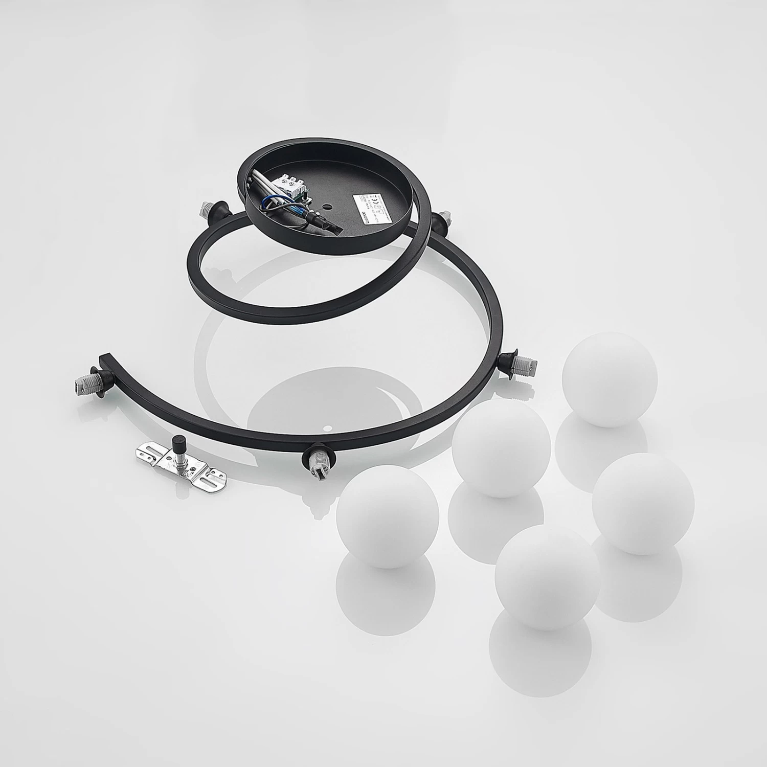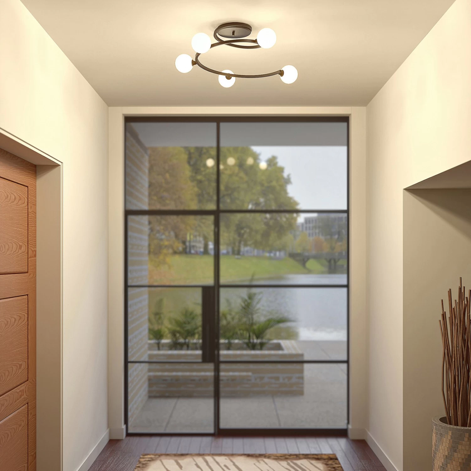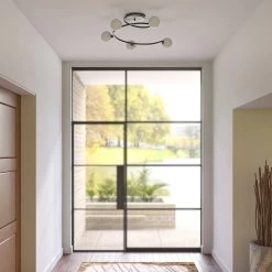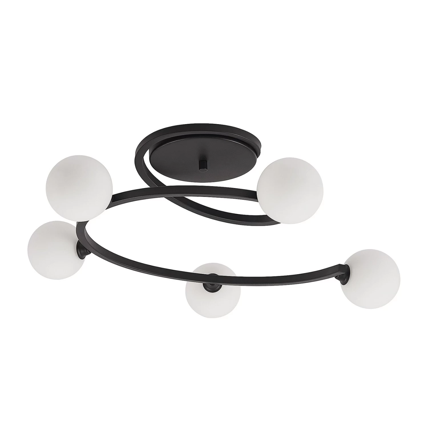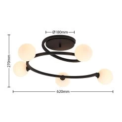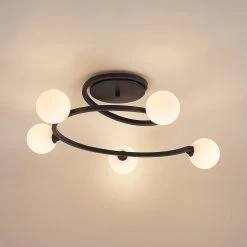 Chenoa ist eine besondere Deckenleuchte, die sich von der Deckenhalterung spiralförmig hinabwindet. Auf dem Leuchtenarm befinden sich insgesamt fĂŒnf Brennstellen, die von Leuchtenschirmen aus Glas ĂŒberdeckt werden. Des Gestell besteht aus Eisen, das mit einem schwarzen OberflĂ€chenfinish ĂŒberzogen wurde.