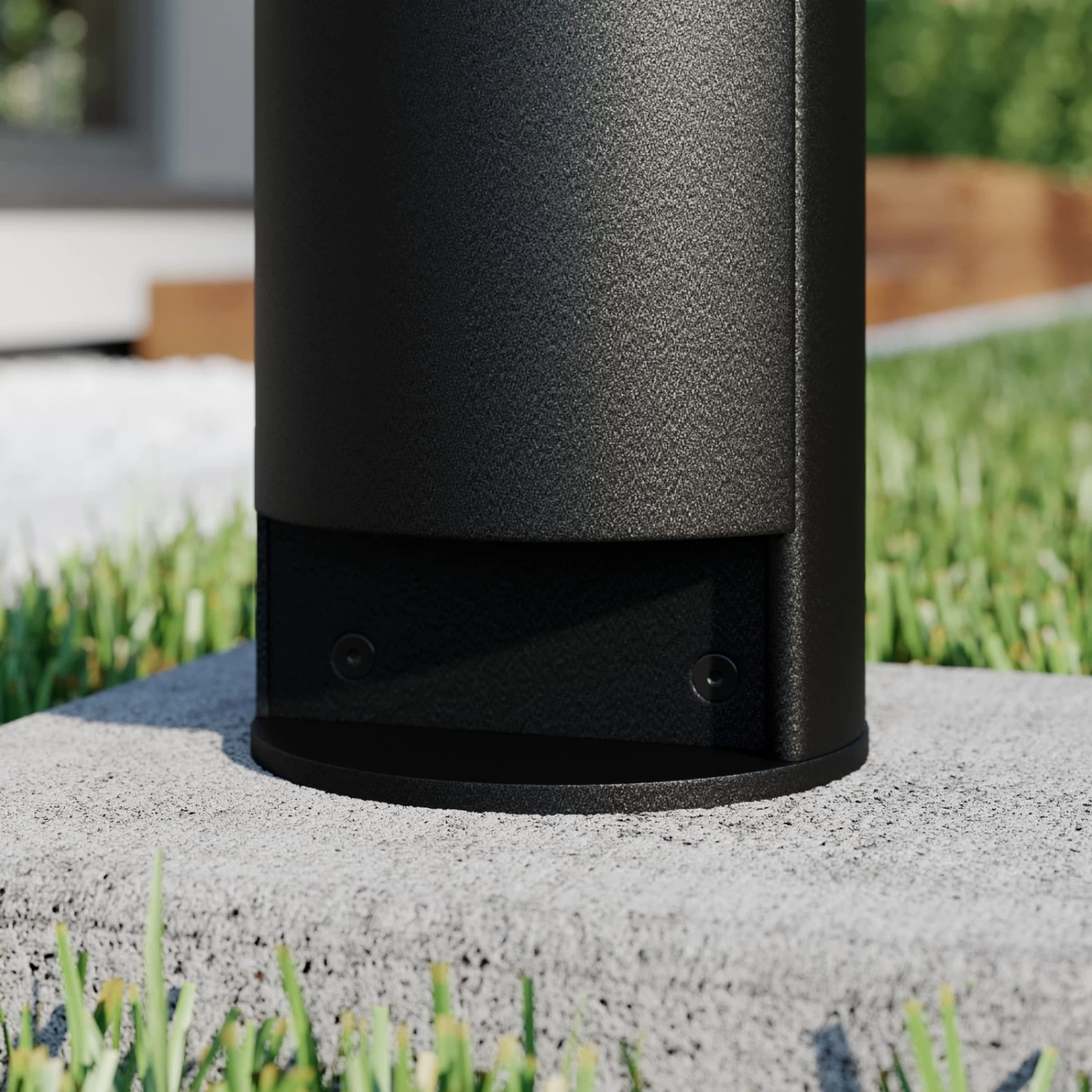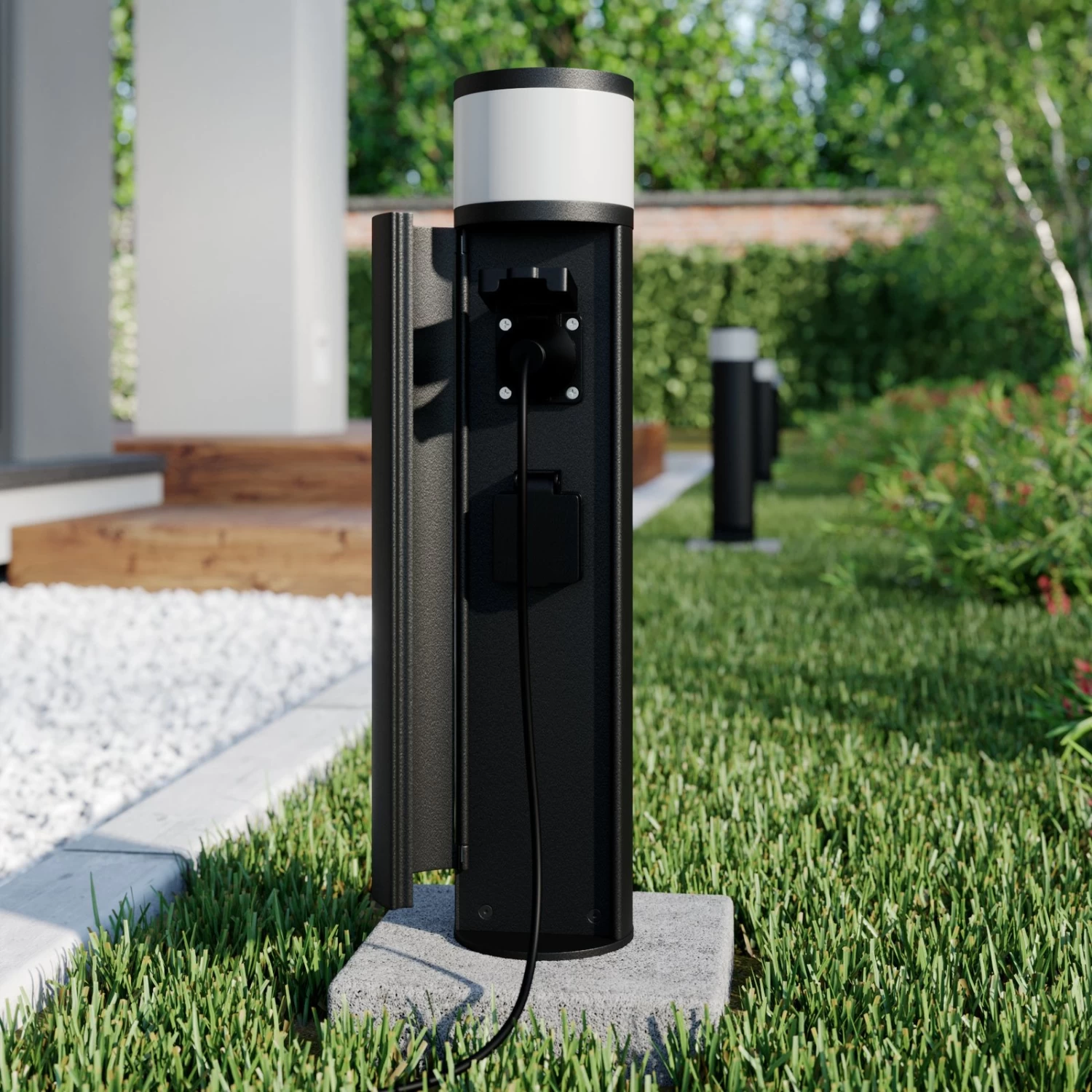 Die Sockelleuchte Corban bringt nicht nur Licht ins Dunkel, sondern stellt auch eine Stromversorgung im Außenbereich zur Verfügung. Die Leuchte hat einen schlanken Korpus aus Aluminium, in den zwei Steckdosen für eine maximale Gesamtleistung von 3.680 Watt eingebaut sind, die sich hinter einer Tür verbergen. Am oberen Ende der Leuchte ist ein weißer Diffusor eingelassen, der für eine gleichmäßige Lichtverteilung sorgt.