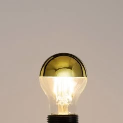 Diese Kopfspiegellampe ist in Filamentoptik gehalten, besitzt die klassische A60-Form und ist im oberen Teil golden verspiegelt, so dass ein sehr angenehmes und abgeblendetes Licht erschaffen wird, das sich auch mit der warmweiĂen Lichtfarbe gut fĂŒr Wohnbereich und offene Leuchten empfiehlt. Bei Bedarf kann das LED-Leuchtmittel extern gedimmt werden und der hohe CRI-Wert verspricht eine besonders gute Farbwiedergabe.