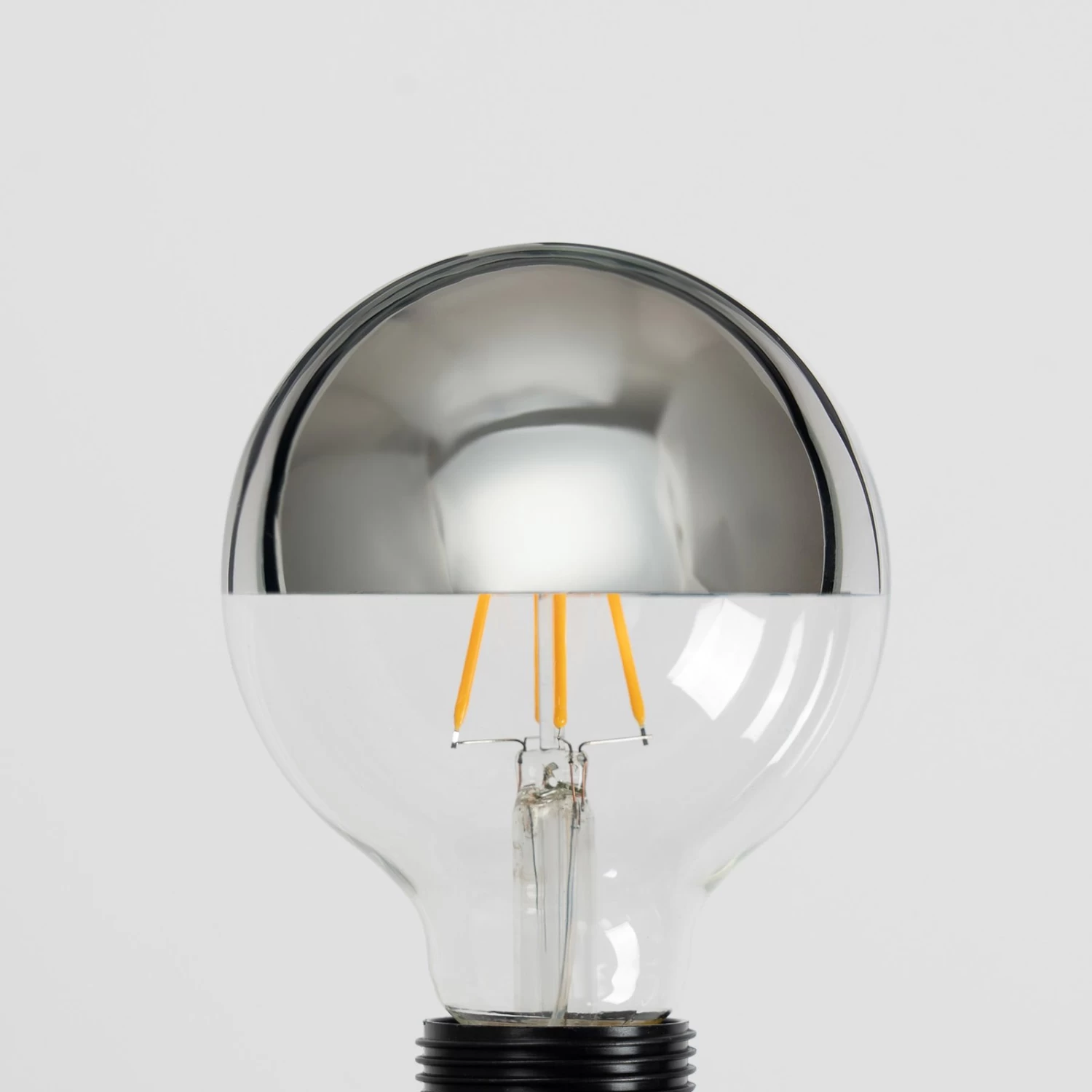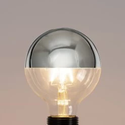 Diese silberne Kopfspiegellampe eignet sich sehr gut als dekoratives Leuchtmittel mit angenehmem Licht fĂŒr den Wohnbereich. Mit der Globeform besitzt sie gröĂere AbmaĂe als ein gewöhnliches Leuchtmittel und der obere Teil ist silbern verspiegelt, wĂ€hrend der Rest der Leuchte in Filamentoptik gestaltet ist. Das LED-Leuchtmittel kann gedimmt werden und eignet sich mit seinen Eigenschaften sehr gut fĂŒr offene Leuchten. Die Farbwiedergabe ist bei dieser LED-Lampe besonders gut.