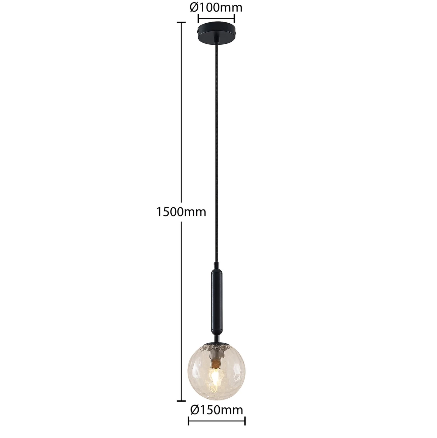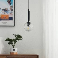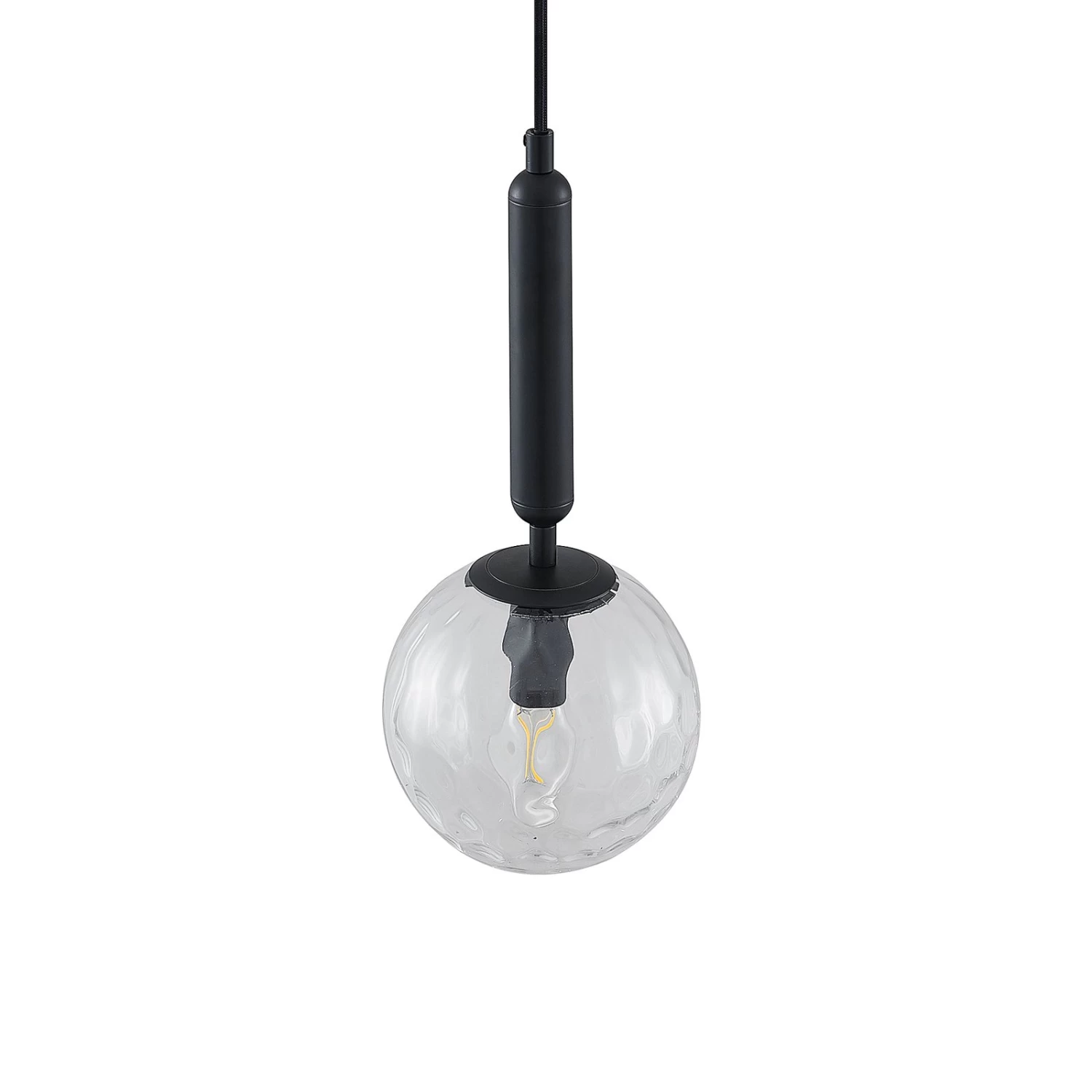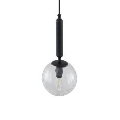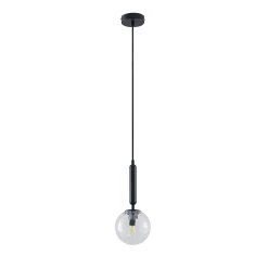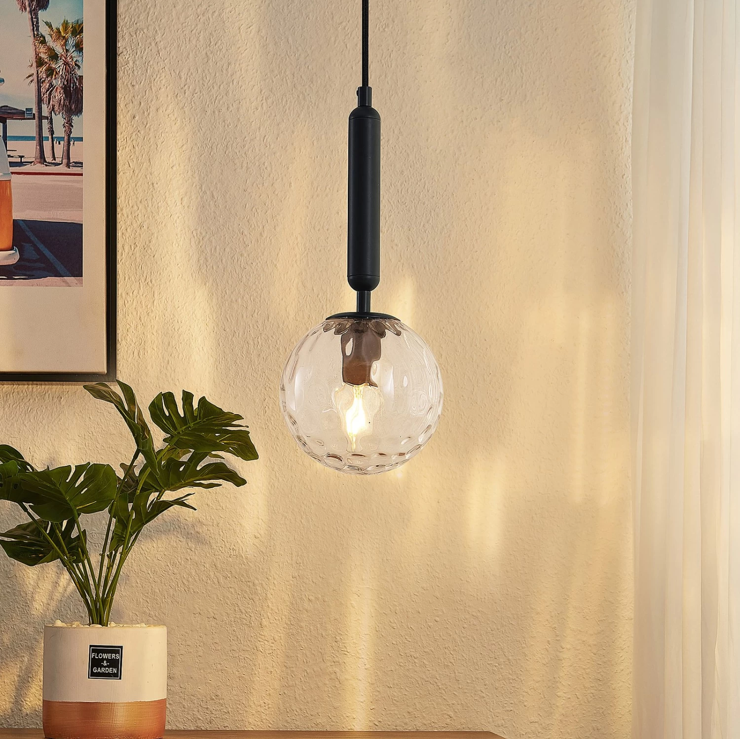 Die HÀngeleuchte Edami kommt in einem dunklen Look daher, der durch den transparenten Leuchtenschirm nicht zu schwer im Raum wirkt. Das GehÀuse aus Eisen wurde in Schwarz gestaltet. Der kugelförmige Leuchtenschirm besteht jedoch aus transparentem Glas und verleiht der Leuchte eine gewisse Leichtigkeit. Das Design wirkt ruhig und solide, weshalb die Leuchte auch im gewerblichen Bereich einen Platz findet. Da die Brennstelle von allen Seiten gut sichtbar ist, wÀre hier ein dekoratives LED-Leuchtmittel in Filament-Optik von Vorteil, um den Gesamteindruck der Leuchte zu unterstreichen.