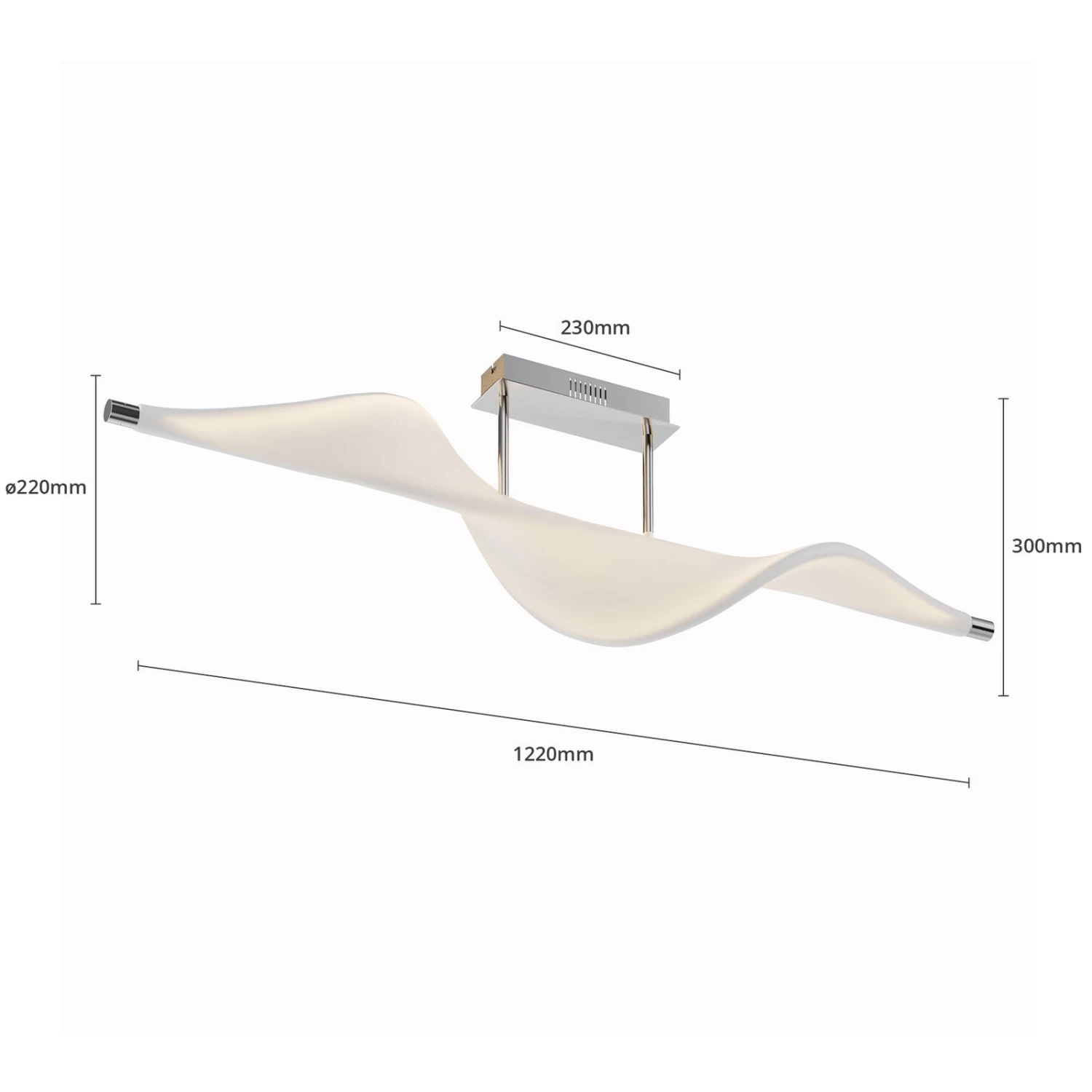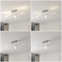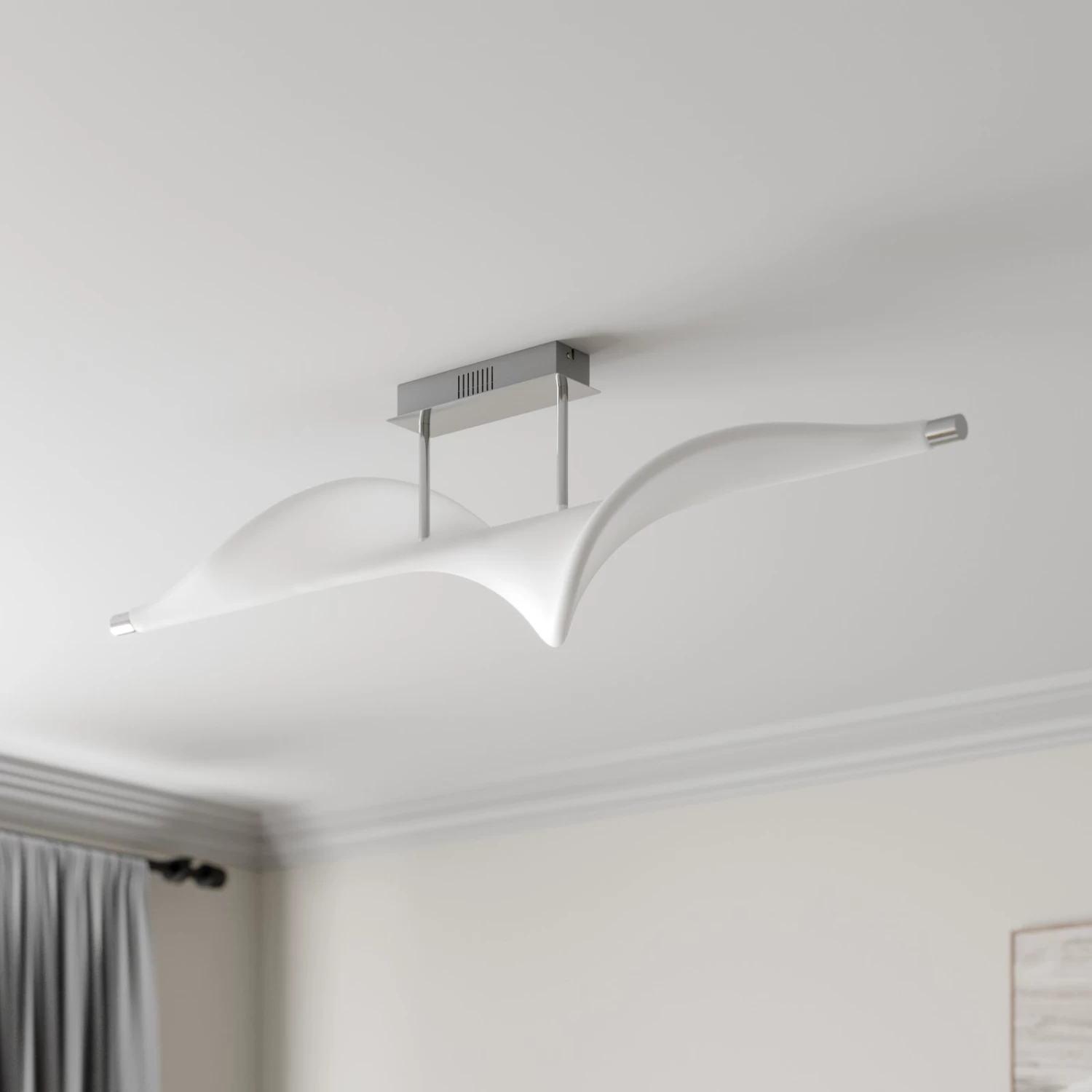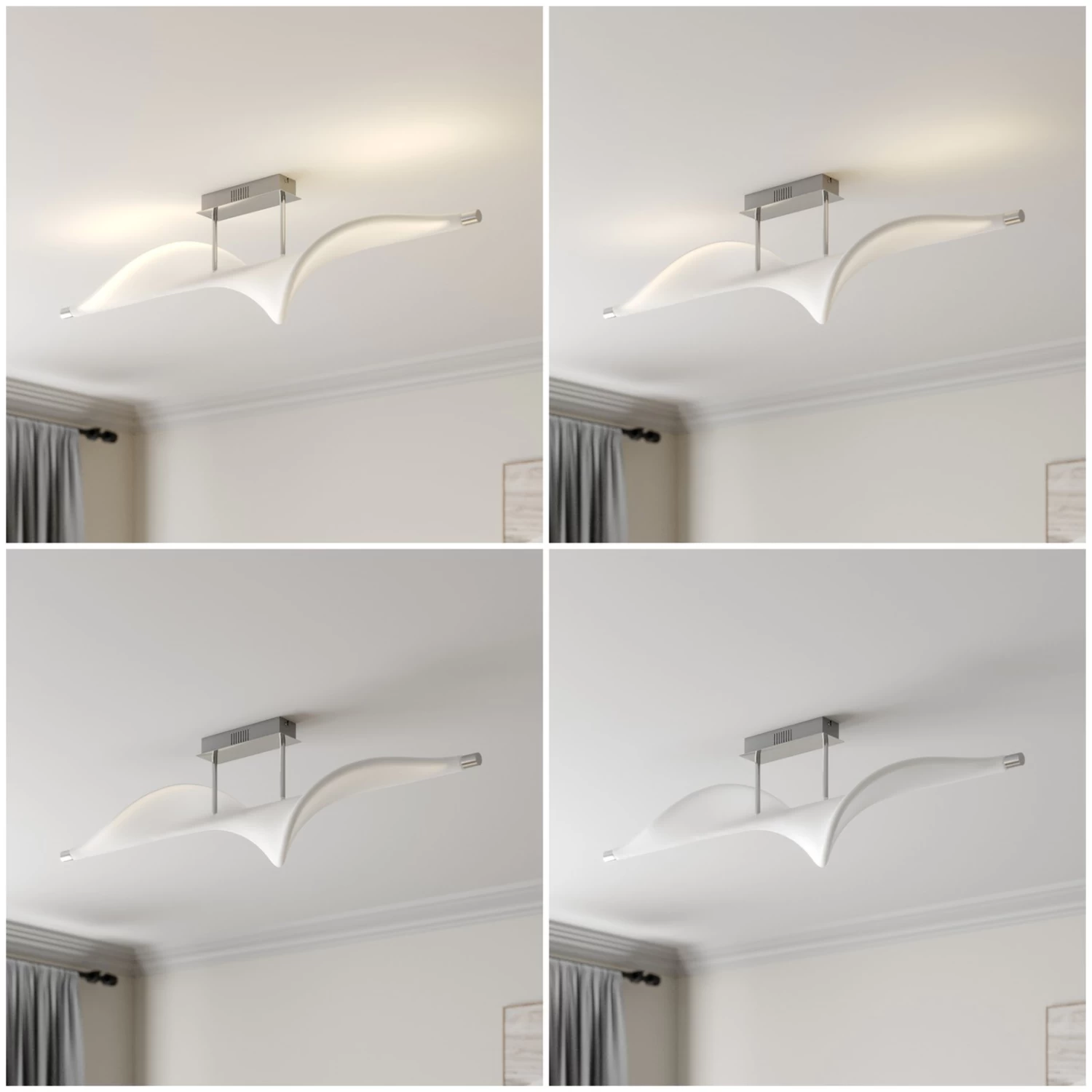 Wie ein Vogel, der im Wind mit weit ausgebreiteten FlĂŒgeln segelt, wirkt die Deckenleuchte Edano mit ihrem weiĂen Textilschirm, der in gewölbter Form gestaltet wurde und mit einem kleinen Abstand von der Deckenhalterung aus Aluminium abgehĂ€ngt wurde. Die modern gestaltete LED-Deckenleuchte beeindruckt durch ein auĂergewöhnliches Design und durch ihre GröĂe und eignet sich deshalb hervorragend fĂŒr ein groĂes Wohnzimmer oder Schlafzimmer.