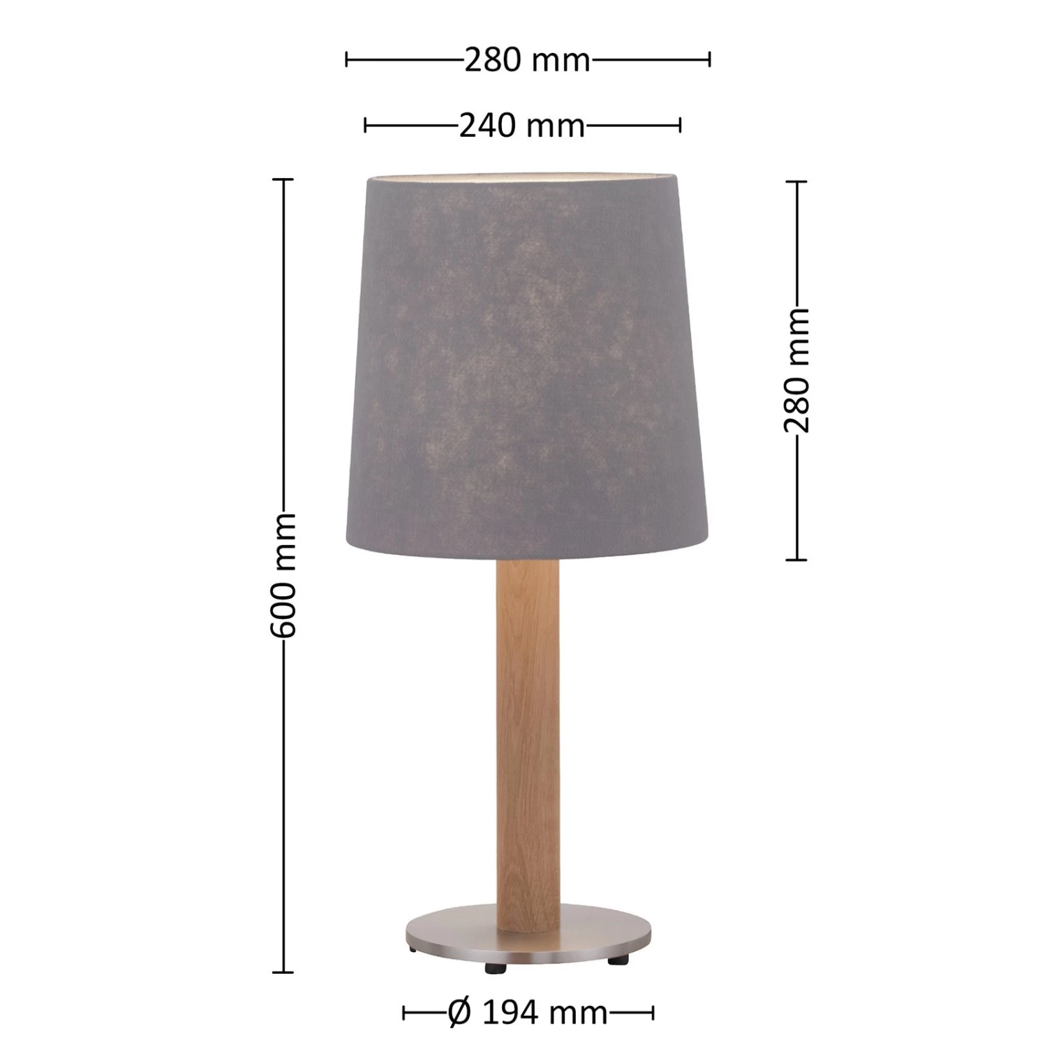 Das Holz ist aus naturbelassener Eiche und wurde per Hand zu einer formschönen SĂ€ule bearbeitet. Direkt oben befindet sich die E27-Fassung der Leuchte, die praktischerweise mit einem Kippschalter fĂŒr das Ein- und Ausschalten der Tischlampe ausgestattet ist. Das Licht der einzusetzenden Lampe strahlt dann ganz sanft nach oben und unten sowie leicht durch den Schirm hindurch.