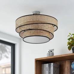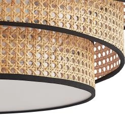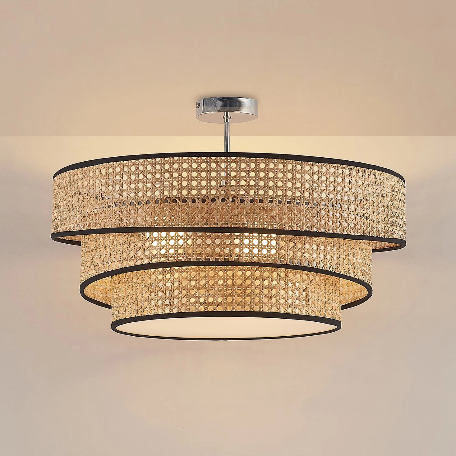 Elowen verbreitet ein gemĂŒtliches Ambiente innerhalb der Inneneinrichtung. Die Deckenleuchte besteht aus drei Leuchtenschirmen aus Rattangeflecht, welche sich gegenseitig umgeben und auf unterschiedlichen Höhen angebracht sind. Dies generiert eine interessante Form und verleiht der Leuchte ihr besonderes Design. Dabei bestehen die einzelnen Schirme aus Wiener Geflecht, das man nicht zuletzt von der Kaffeehauskultur kennt, so dass es eine lange Tradition besitzt, und das auch in unserer Zeit einem schönen Trend entspricht. Im Inneren sitzen drei Fassungen, welche mit E27-Leuchtmitteln bestĂŒckt werden können. Das helle Holz besitzt viele kleine Ăffnungen, durch die das erzeugte Licht gebrochen wird und ein attraktives Lichtspiel generiert. Die Deckenleuchte Elowen findet in einem Wohnzimmer oder in einem Flur ihren perfekten Platz und setzt auffĂ€llige Akzente an Wohnungsdecken.