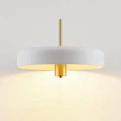 Die zeitlose Oberfläche in Mattweiß wirkt ausgewogen und wird ergänzt von kleineren Details in gebürstetem Messing, wobei auch das stoffummantelte Kabel in dieser warmtönigen Farbe gehalten ist. Dies alles beweist einen Sinn für ausgesuchte Details, die bei dieser Design-Pendelleuchte harmonisch aufeinander abgestimmt sind.