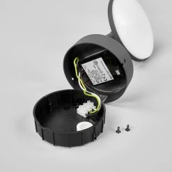 Der Leuchtenkörper von Finny ist aus Aluminium gefertigt worden, das nicht naturbelassen, sondern dunkelgrau lackiert worden ist. An der runden Wandhalterung sitzt ein integrierter Bewegungsmelder, der das erfasst, was in einem Winkel von 90° vor sich geht. Sobald eine Bewegung registriert wird, leuchten die LEDs auf und man kann die Leuchtdauer frei variieren, denn diese ist verstellbar im Bereich von 5 Sekunden bis 8 Minuten. Die maximale Reichweite des Sensors liegt zwischen 6 und 10 Metern.