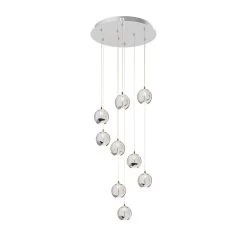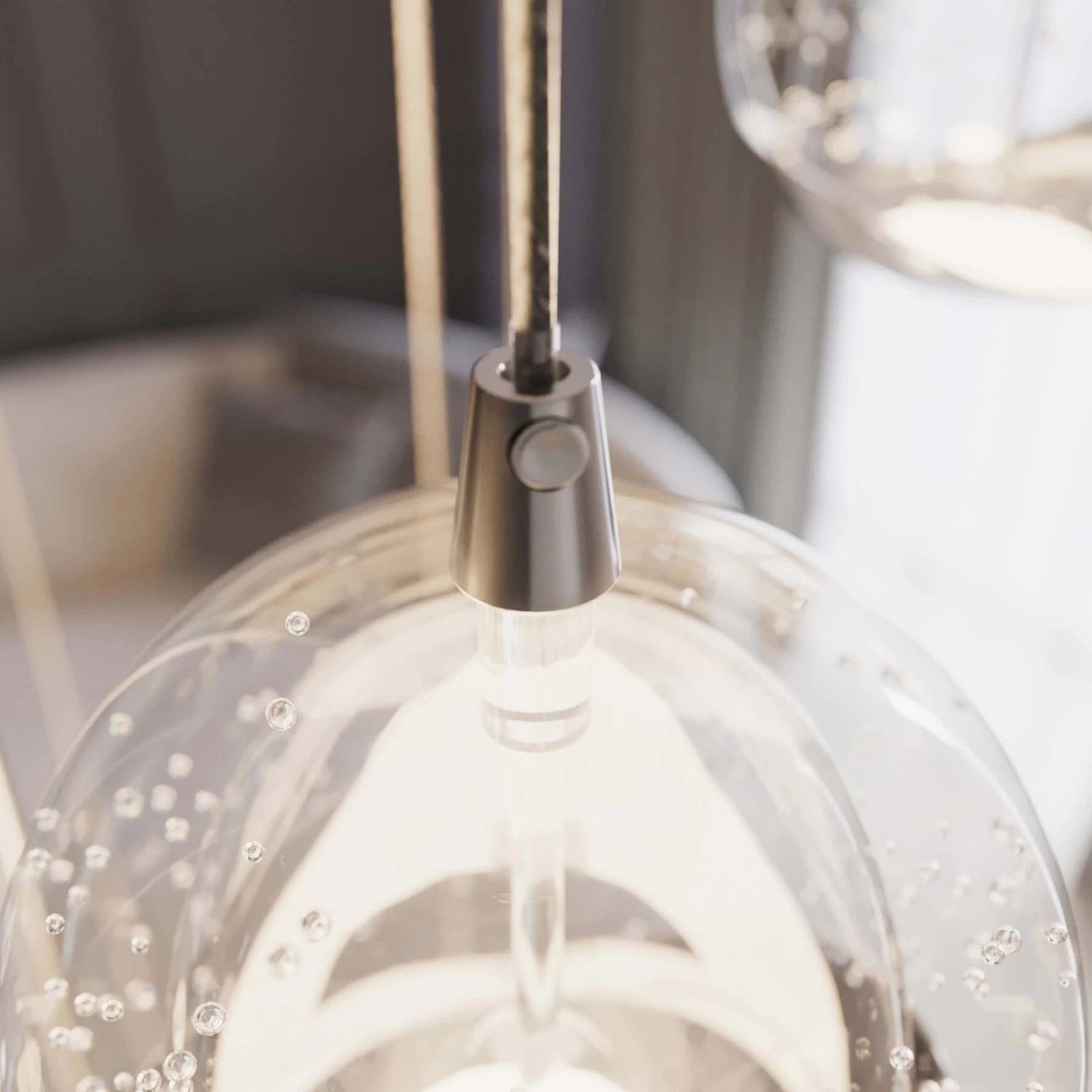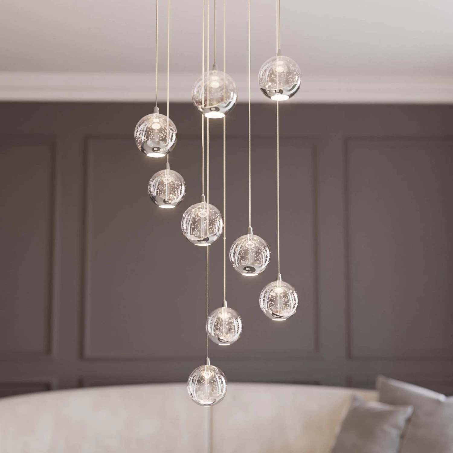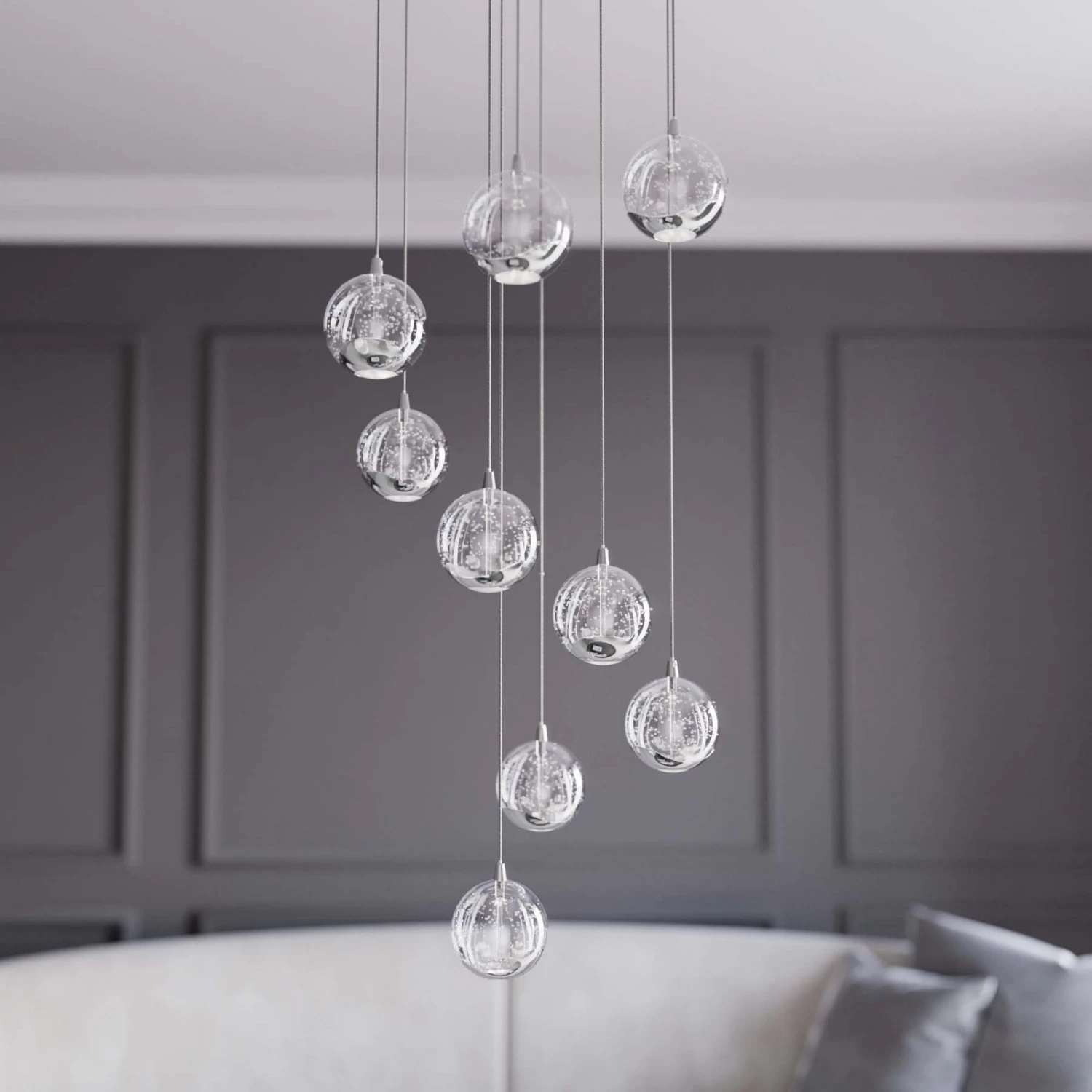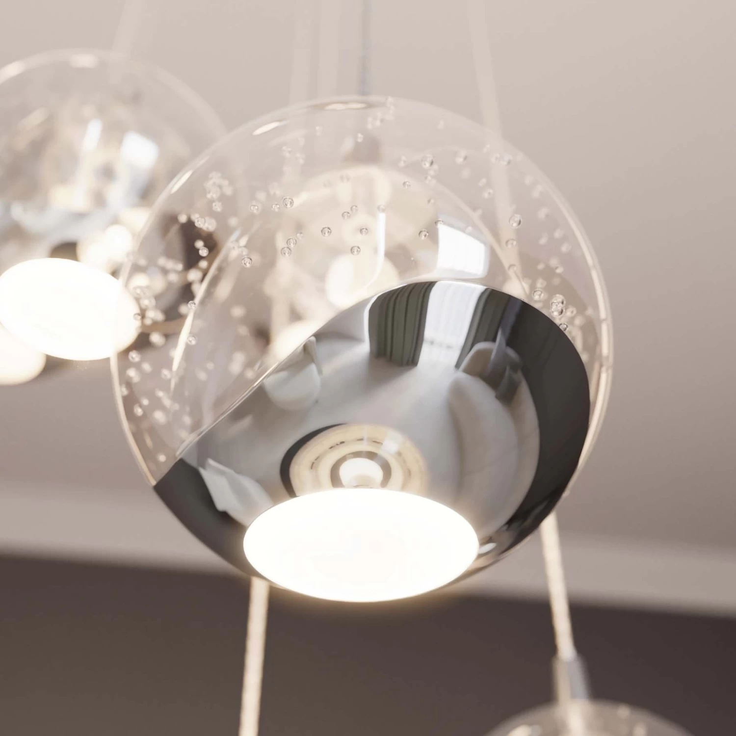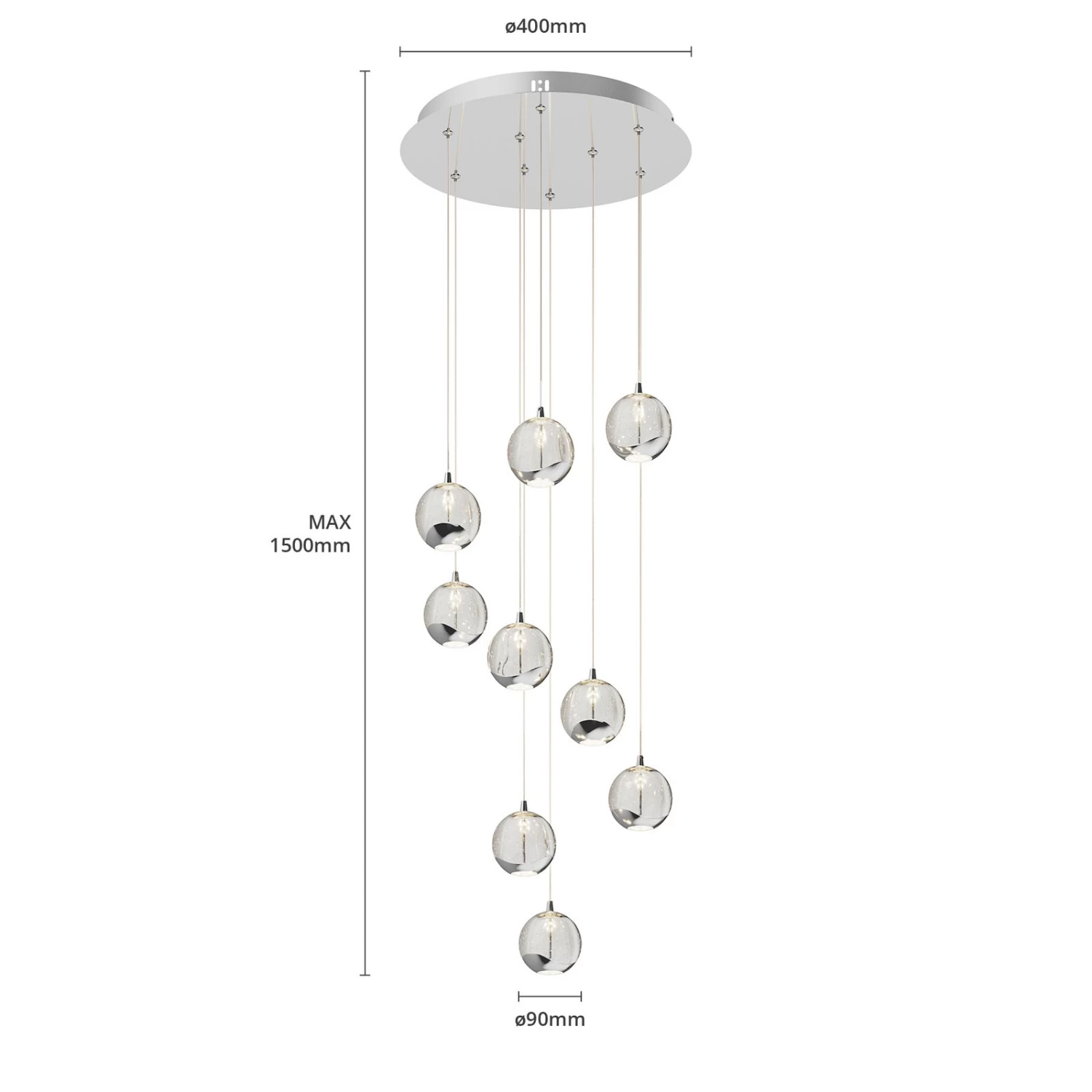 Die neun Glaskugeln wurden von innen mit dekorativen Luftblasen versehen, wobei ihre Unterseite jeweils von einem Metallelement umschlungen wird. Die moderne Chrom-Optik, in der auch der runde Baldachin der Leuchte verarbeitet wurde, unterstreicht ihren gehobenen Charakter und macht sie somit zu einer unverwechselbaren Lichtquelle. Dieses ausgeklĂŒgelte Design macht die Leuchte auch im ausgeschalteten Zustand zu einem extravaganten Wohnaccessoire.
