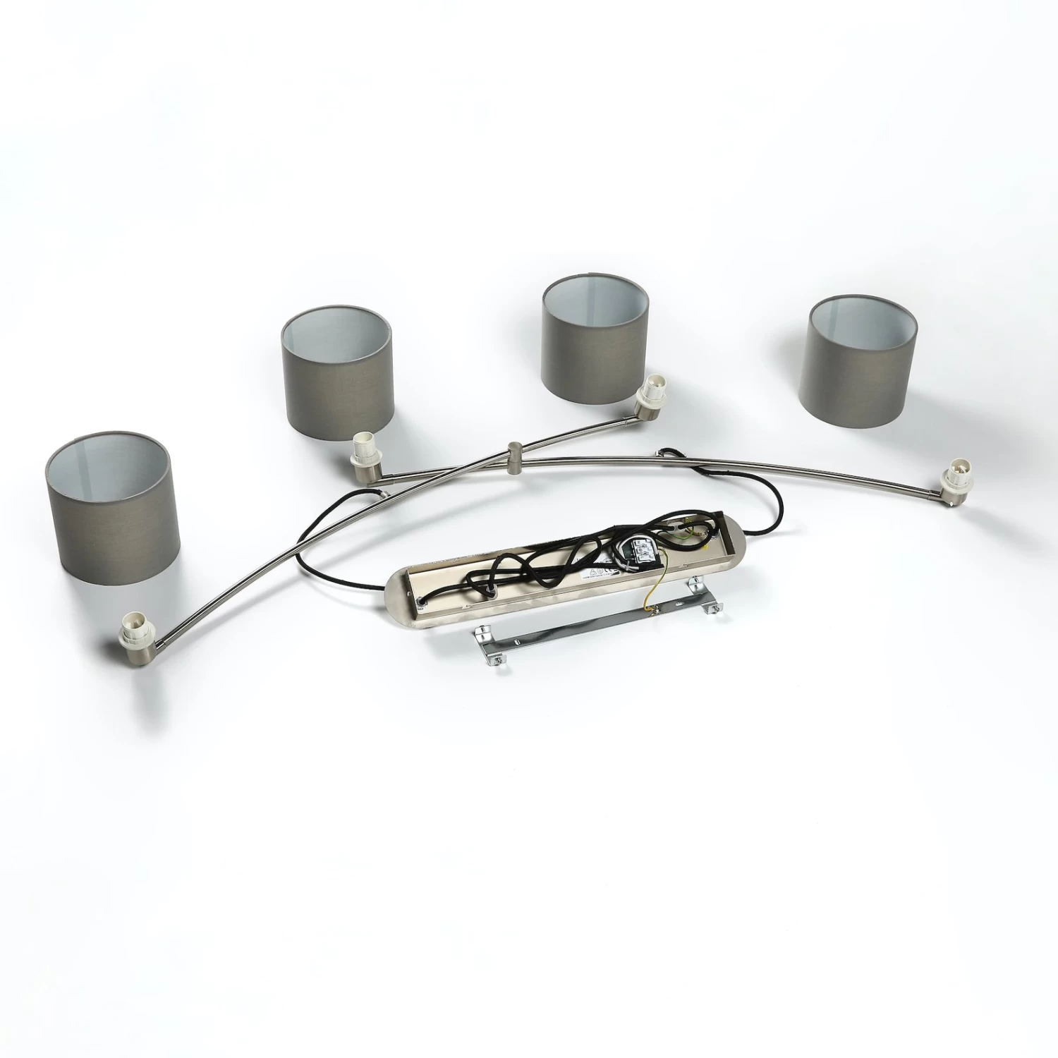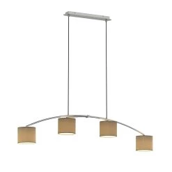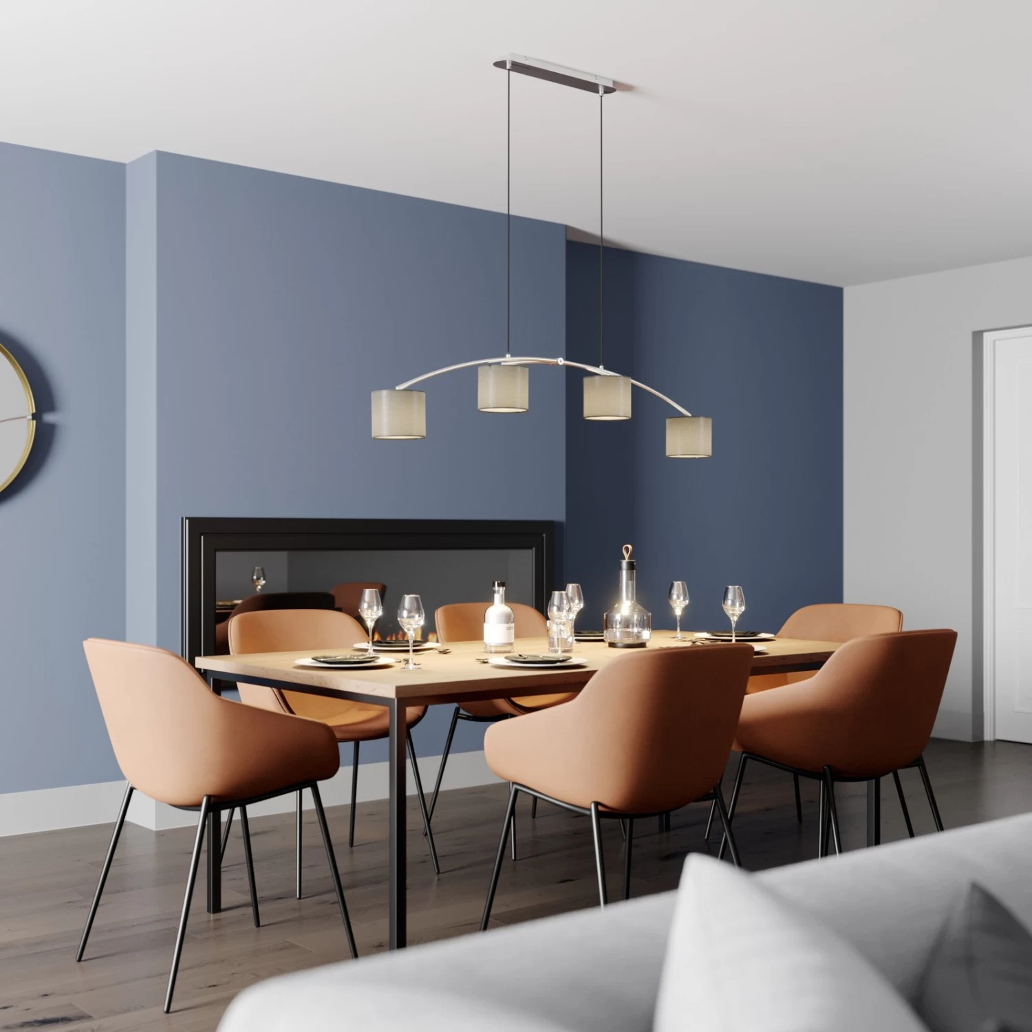 Diese Pendelleuchte folgt in ihrer Gestaltung designorientierten MaĂstĂ€ben, dennoch mutet die Optik der Leuchte recht zeitlos an. Vier taupefarbene Lampenschirme aus feinem Stoff sind an den beiden gebogenen BĂŒgeln angebracht und es sind besonders feine, geschwungene Linien, die das Design dieser eleganten Leuchtenserie prĂ€gen. Die Textilschirme der Pendellampe entsprechen einem wohnlichen Look und sie sorgen fĂŒr eine gemĂŒtliche Lichtabstrahlung voller Behaglichkeit. Die Metallelemente sind in satiniertem Nickel gehalten und passen sehr gut zu dem Stoffdesign, das die Leuchten ansonsten kennzeichnet. In der vierflammigen AusfĂŒhrung eignet sich Juljana als Pendellampe hervorragend fĂŒr den Einsatz ĂŒber einem Esstisch, der schön und angenehm beleuchtet wird.