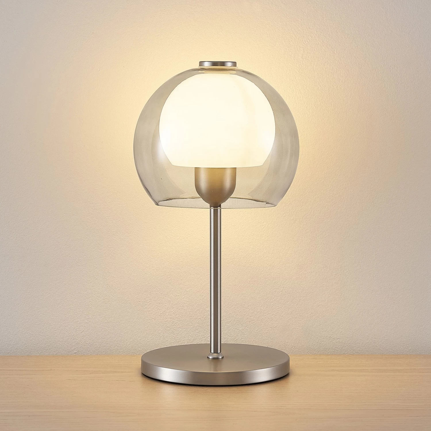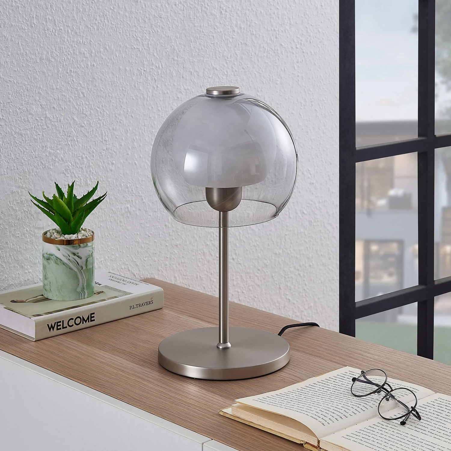 Nickelfarbene Tischleuchte Kaiya aus Eisen und Glas in Nickelfarben