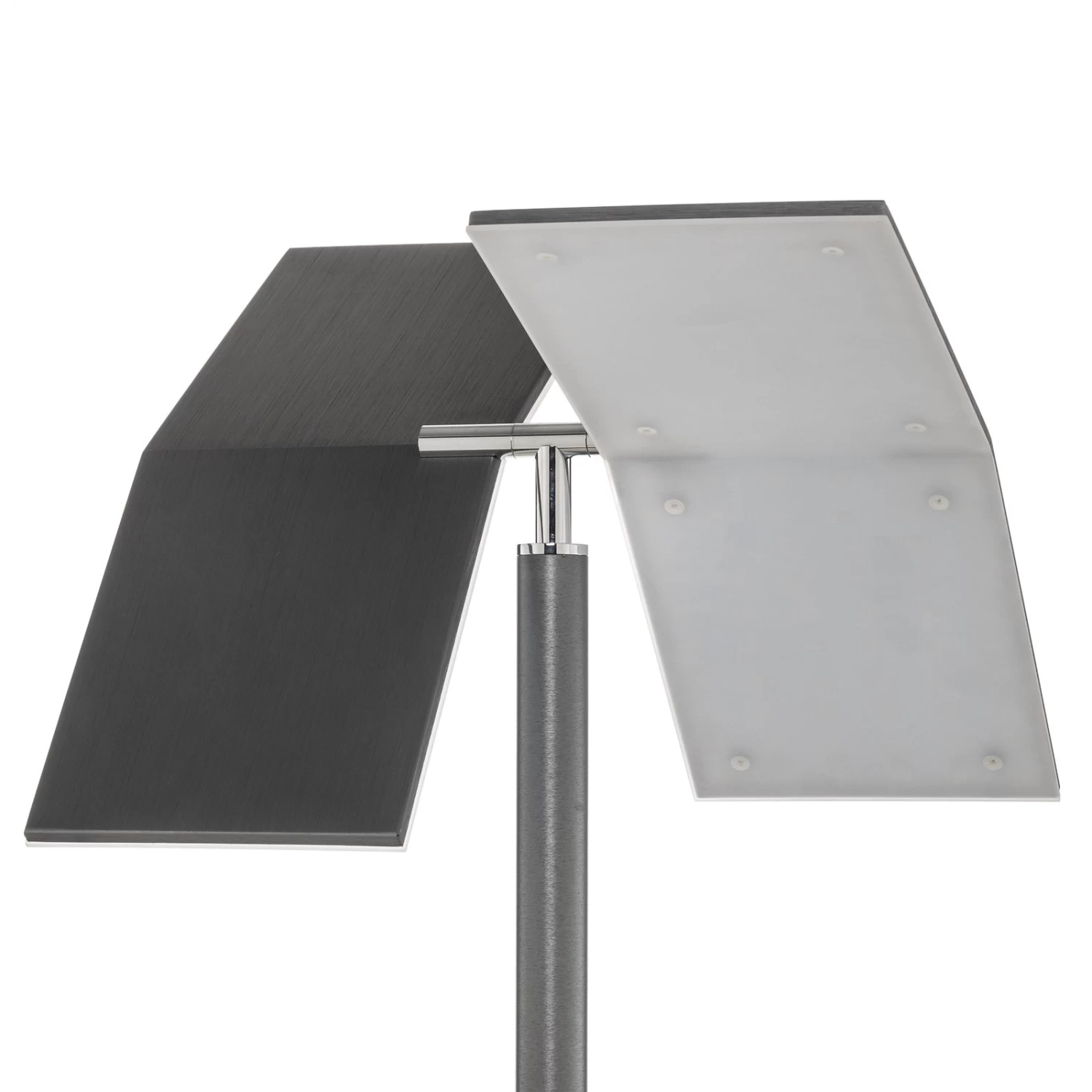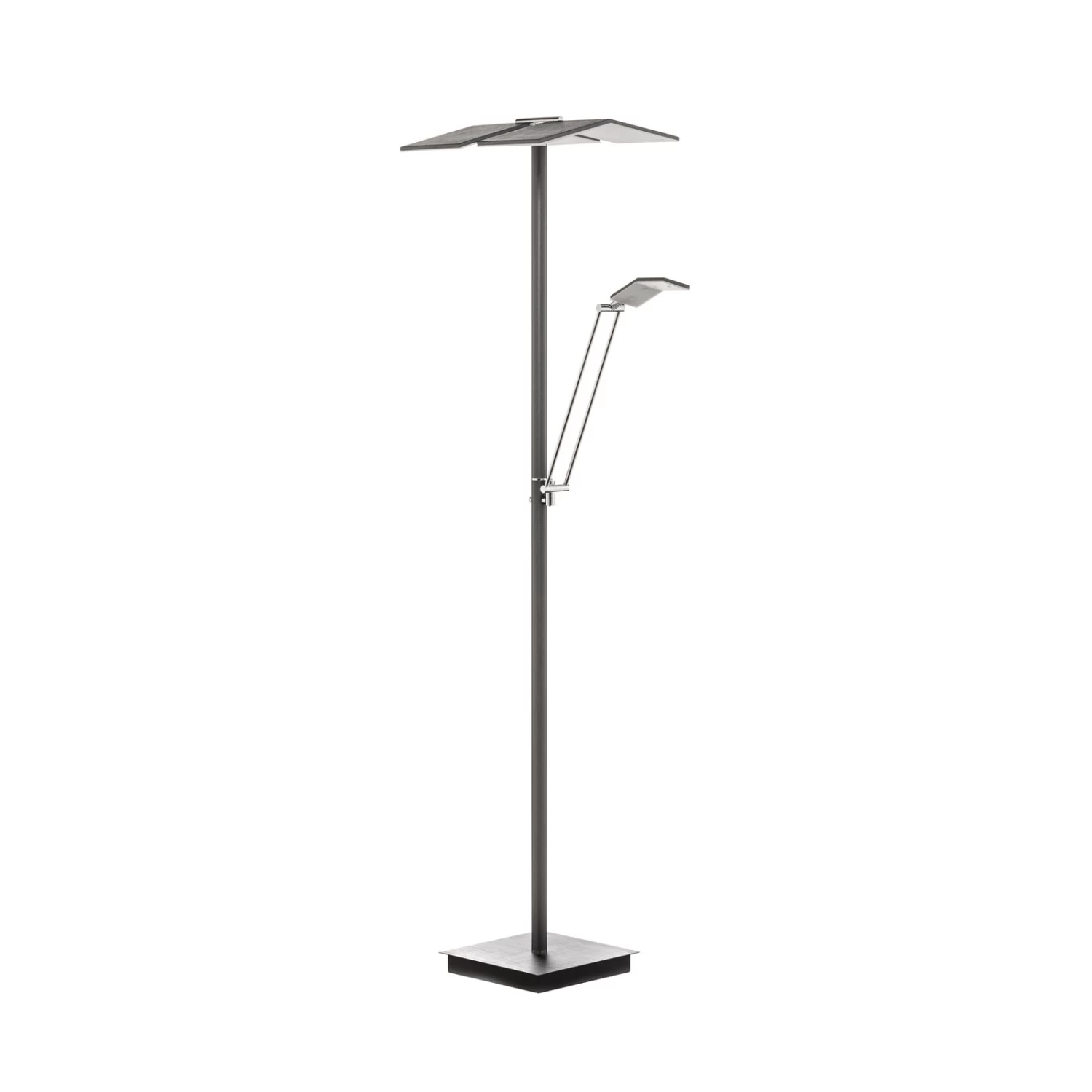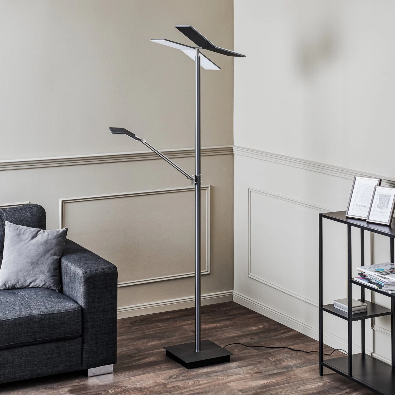 Anthrazitfarbene LED-Stehleuchte Kamari in modernem Design mit Dimm- und CCT-Funktion Wer auf der Suche nach einer LED-Stehlampe ist, die ein besonderes Aussehen besitzt und über praktische Funktionen verfügt, wird durch Kamari nicht enttäuscht. Sie ist aus Eisen und Kunststoff hergestellt und präsentiert sich in einem dezenten Anthrazit. Ihre Leuchtenschirme sind das Besondere an ihr. Diese bestehen aus rechteckigen, schlanken Elementen, die beweglich sind und somit eine flexible Ausrichtung möglich machen. Darüber hinaus verfügt sie über eine kompakte Leselampe, die das abendliche Bücherlesen mit der richtigen Beleuchtung begleitet. Die LED-Stehleuchte Kamari kann außerdem mit Hilfe eines Schalters an ihrer Stange gedimmt werden und ihre Lichtfarbe von warmweiß zu tageslicht ändern.