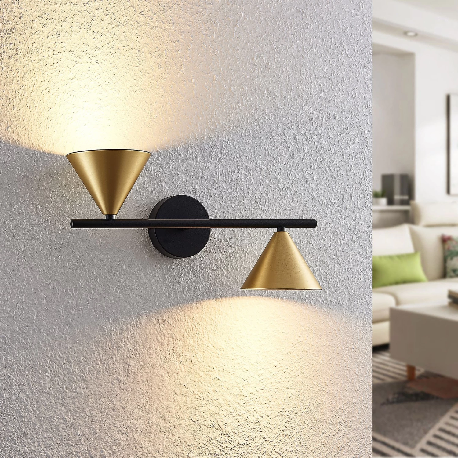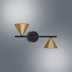 Das Gestell besteht aus einer runden Montageplatte, an der ein horizontaler Metallstab befestigt ist. An den Enden des Stabes sind die beiden Leuchtenschirme montiert. Die geometrische Form eines Kegels bewirkt, dass die Leuchtenschirme das Licht gezielt in eine Richtung abstrahlen, sodass die Leuchte sowohl nach oben als auch nach unten entlang der Wand stilvolle Lichtakzente setzen kann.