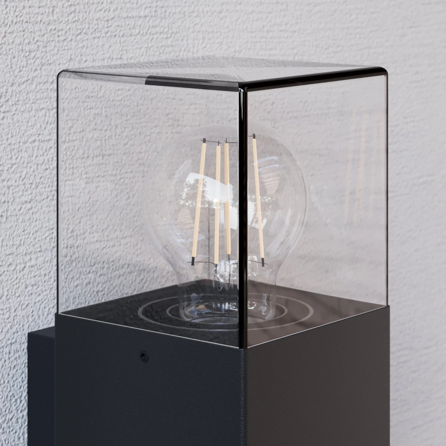 Das moderne wie eckig gestaltete GehĂ€use der AuĂenwandleuchte Keke ist aus Aluminium gefertigt und ist zusammen mit dem transparenten, rauchgrauem Kunststoffschirm robust und widerstandsfĂ€hig, sodass Wind und Wetter der Leuchte wenig anhaben können.
