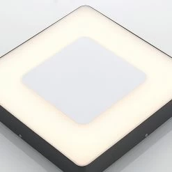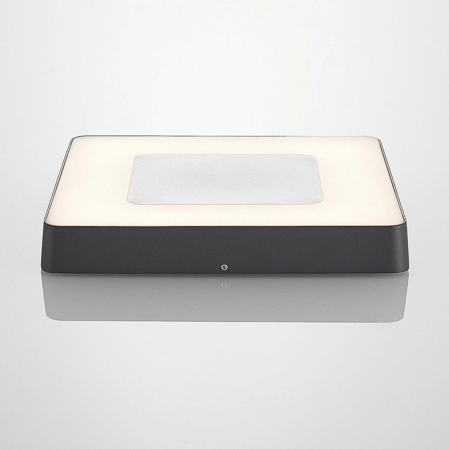 Die LED-Außendeckenleuchte Sora ist rechteckig geformt, wobei die Ecken leicht abgerundet sind. Eine Außenseite aus dunkelgrauem Aluminiumdruckguss umschließt die in Weiß gehaltene Lampe aus Kunststoff. So ist die Leuchte gut für den Einsatz im außenliegenden Hausumfeld geeignet. Außerdem ist sie mit einem Bewegungsmelder ausgestattet, dessen Einstellungen individuell angepasst werden können.