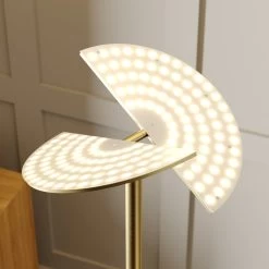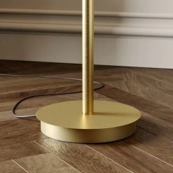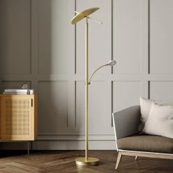 Dieser LED-Deckenfluter mutet zum einen aufgrund seiner Formensprache sehr modern an, auf der anderen Seite ist das messingfarbene Finish auch etwas, das eine klassischere Wirkung versprĂŒht. So ergibt sich eine individuelle Kombination, die sich zu einem eleganten Lichtspender fĂŒr den Wohnbereich verbindet.
