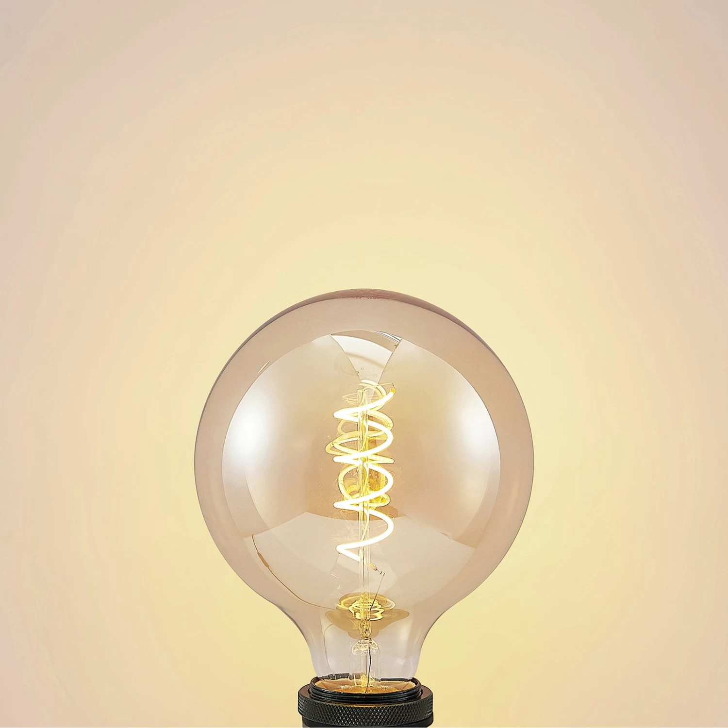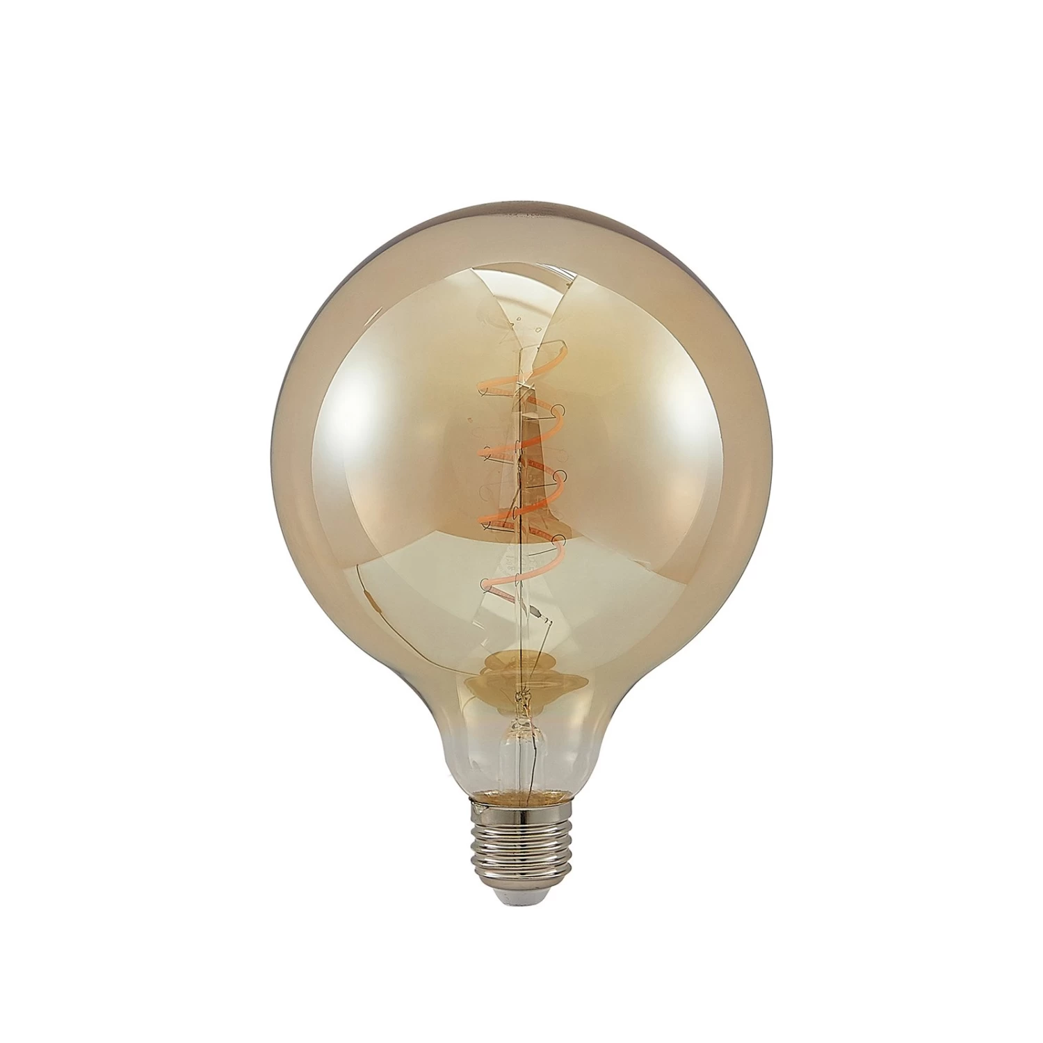 Mit ihrer stromsparenden Leistung von 4 Watt kann diese E27-LED-Globelampe eine gewöhnliche GlĂŒhbirne von bis zu 18 Watt ersetzen. Mit ihrer amberfarbenen OberflĂ€che wirkt sie sehr dekorativ. Der Filamentstab schwingt sich spiralförmig nach oben und verleiht der Lampe einen besonderen Look, der sich vor allem in Beleuchtungsobjekten mit einem offenen Leuchtenschirm sehen lassen kann. Bei Bedarf lĂ€sst sich die Lampe dimmen, sodass die RaumatmosphĂ€re individuell angepasst werden kann. Die Farbwiedergabe ist mit dem hohen CRI von ĂŒber 90 besonders gut.