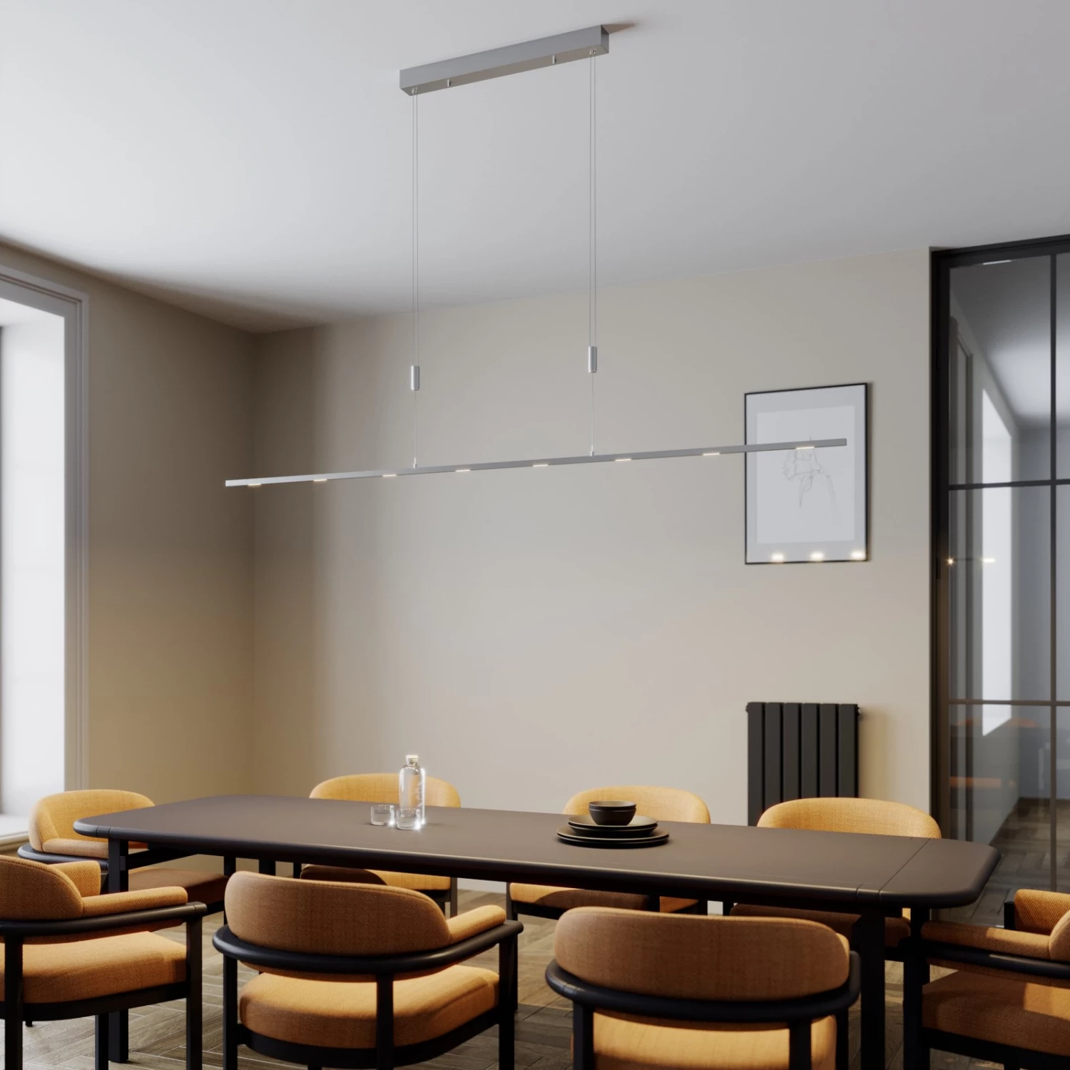 Arnik hat eine lange Grundform und ist daher sehr gut für eine großflächigere Ausleuchtung von Tischflächen geeignet. Dank des puristischen Designs kann man die Balkenpendellampe sowohl über Esstischen als auch in einem Homeoffice verwenden. In beiden Fällen ist es von Vorteil, dass man die Höhe über den Seilzugmechanismus beliebig einstellen kann, von 110 cm bis 210 cm. Darüber hinaus ist die Pendelleuchte mit einem dimmbaren Treiber ausgestattet, der eine dreistufige Helligkeitseinstellung über den Wandschalter erlaubt.