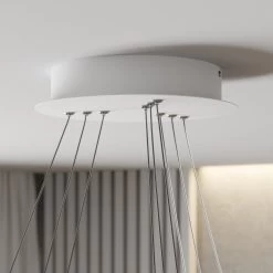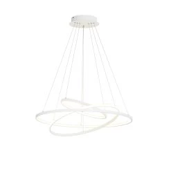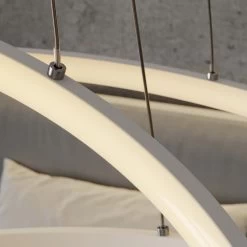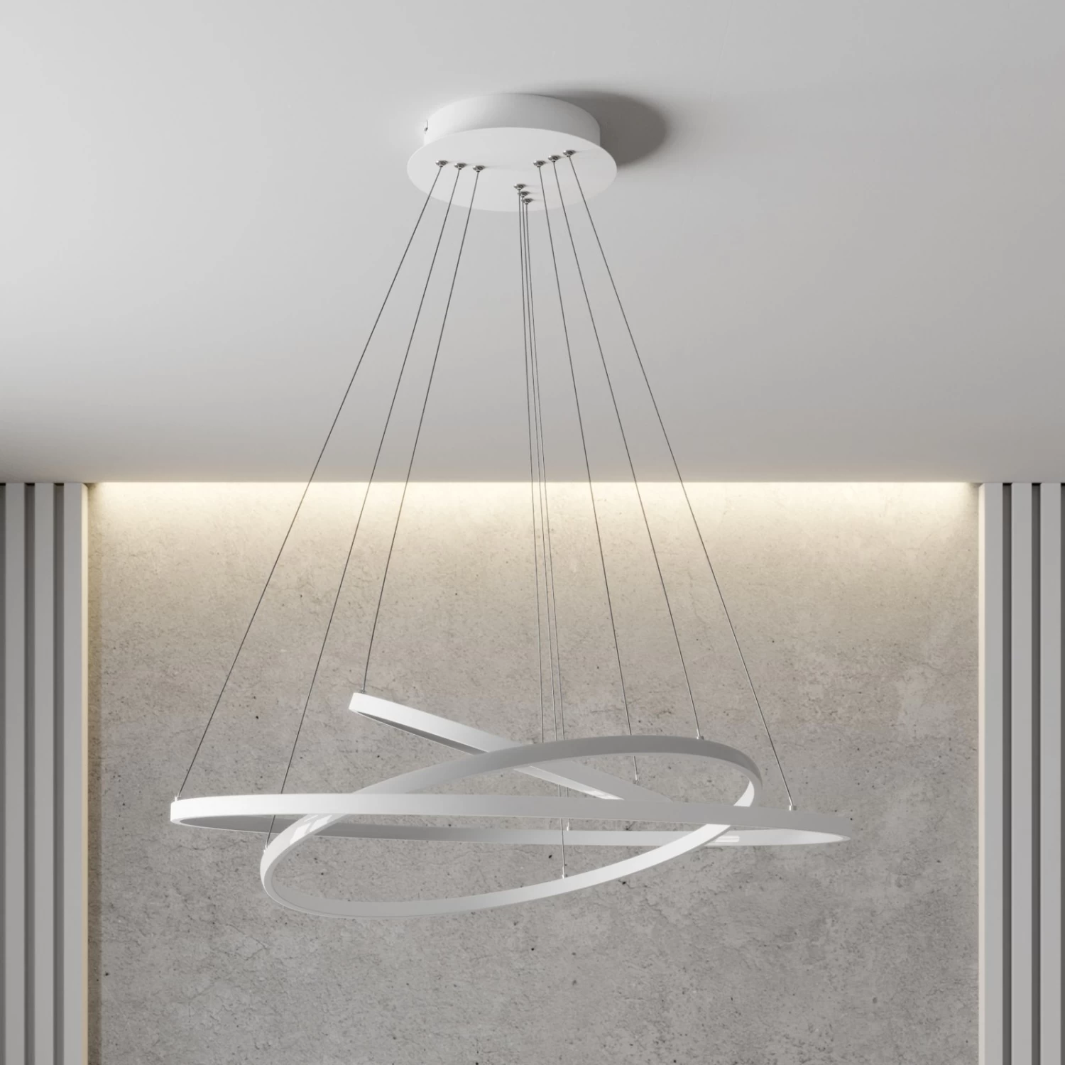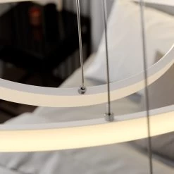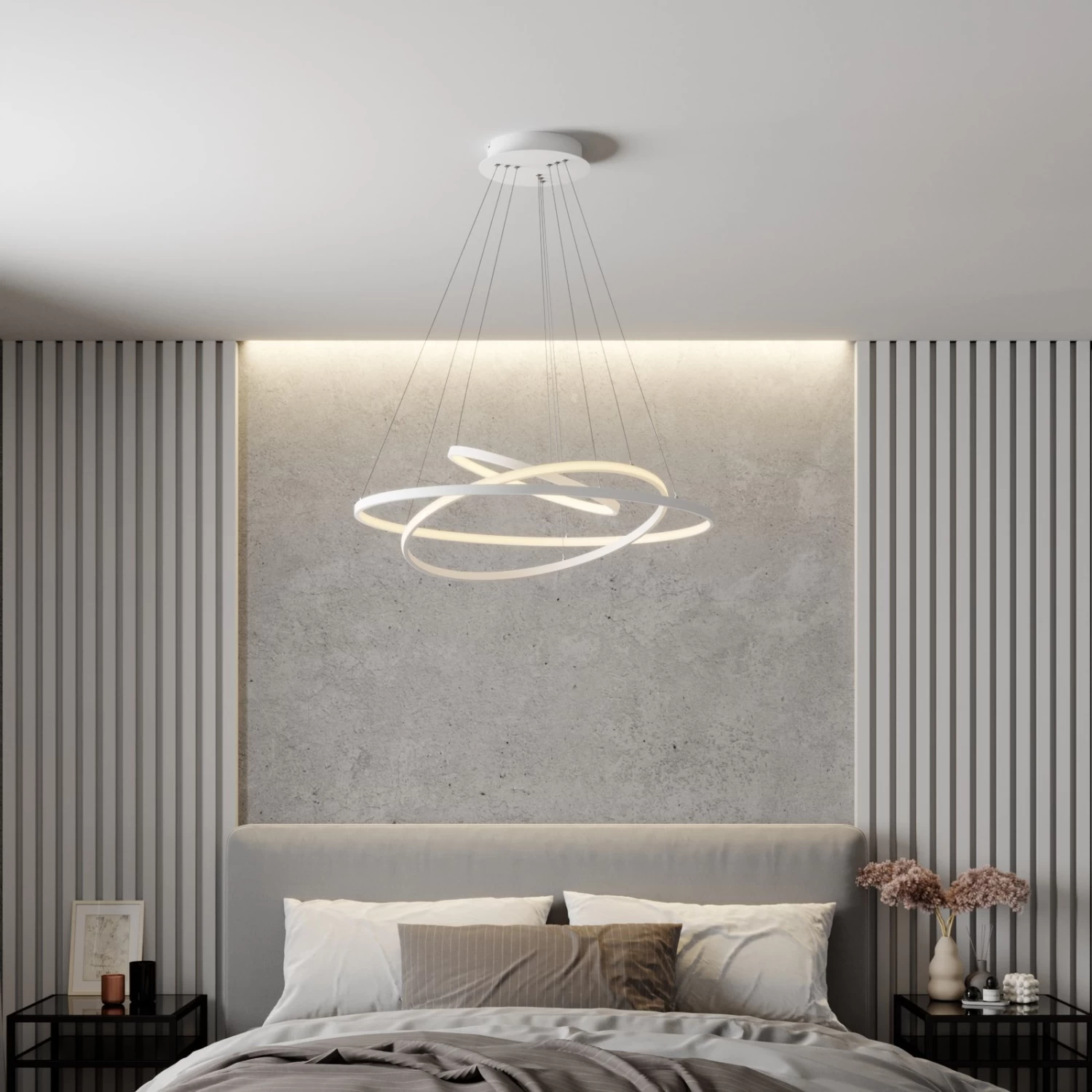 Die Aufhängevorrichtung der Pendelleuchte ist ganz in Weiß gehalten und kombiniert Metall- und Kunststoffelemente zu einem stimmigen Gesamtbild. Dadurch lässt sich die Lampe elegant in moderne Einrichtungsstile integrieren. An den Pendelstreben sind drei Leuchtringe befestigt, die sich wie Planetenringe ineinanderfügen. Diese sorgen für ein dezentes Licht- und Schattenspiel, das sich mit der Switch-Dim-Funktion einfach über den Wandschalter in vier Stufen dimmen lässt.