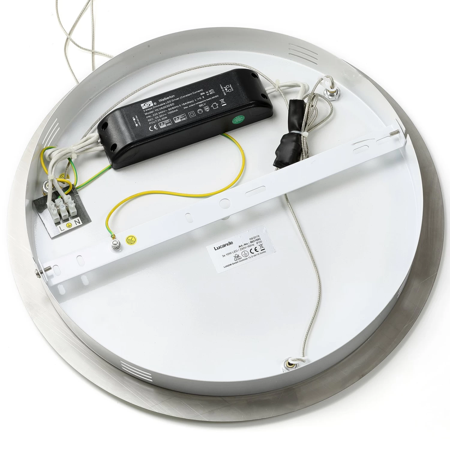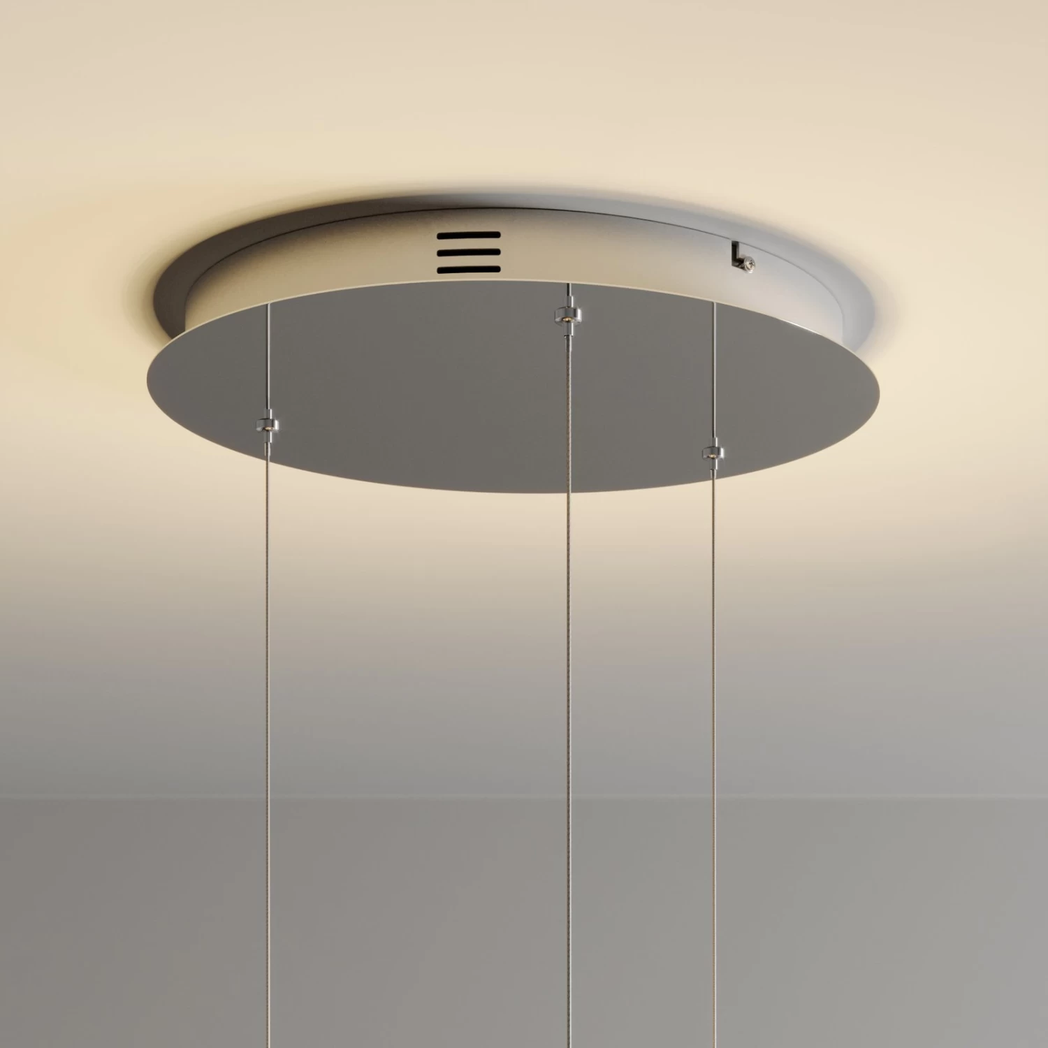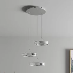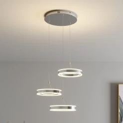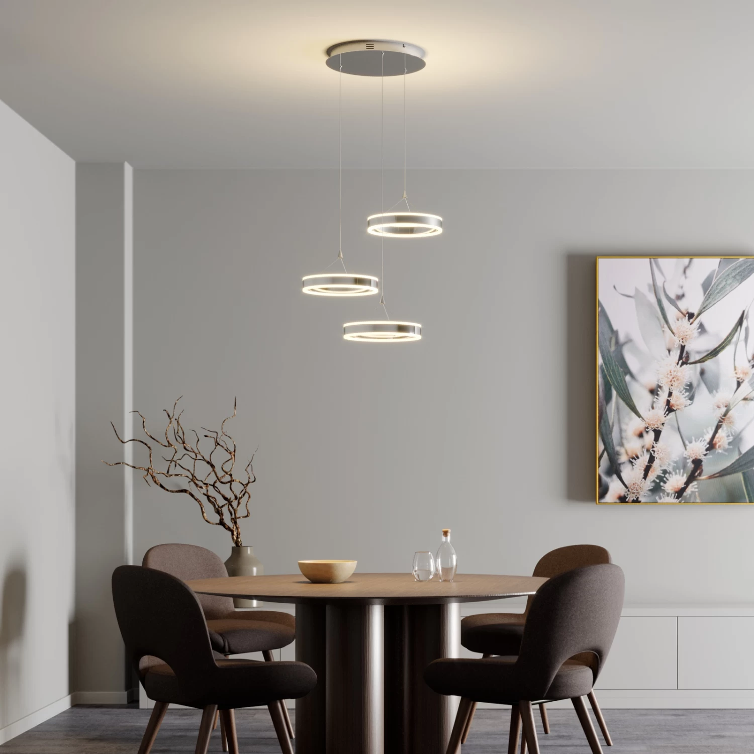 Bei der LED-Pendelleuchte Lyani hĂ€ngen drei Metallringe an filigranen Stahlseilen in unterschiedlicher Höhe von der Decke. Das wirkt verspielt und insgesamt ist die modern aussehenden Pendellampe eine hervorragende ErgĂ€nzung zur Beleuchtung von Essbereichen in KĂŒche oder Wohnraum. Zum Dimmen der Leuchte benötigt es lediglich den normalen Schalter. Wird die Leuchte schnell aus- und gleich wieder eingeschaltet, hat man ĂŒber diesen Vorgang die Möglichkeit, die Leuchtkraft dreistufig zu verĂ€ndern.