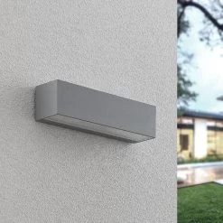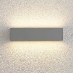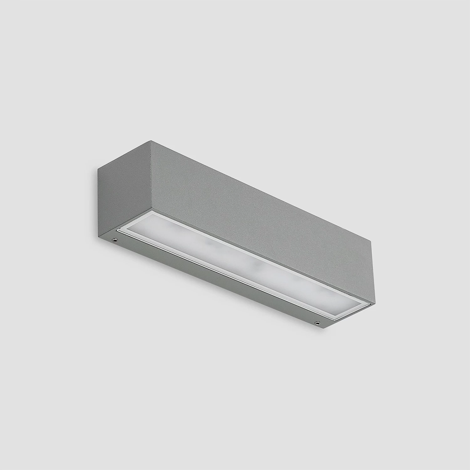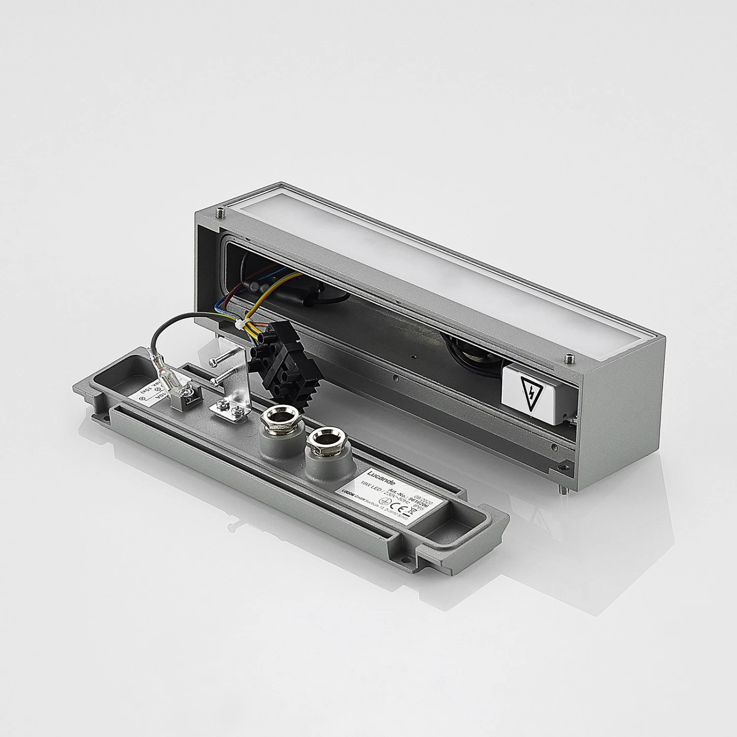 Das GehĂ€use der LED-AuĂenwandleuchte Lengo besteht aus robustem Aluminiumdruckguss, wobei die OberflĂ€che mit einem silbernen Finish verarbeitet wurde. Ihre rechteckige Bauform und das schlichte Design lassen sich optisch gut in jeden AuĂenbereich integrieren.