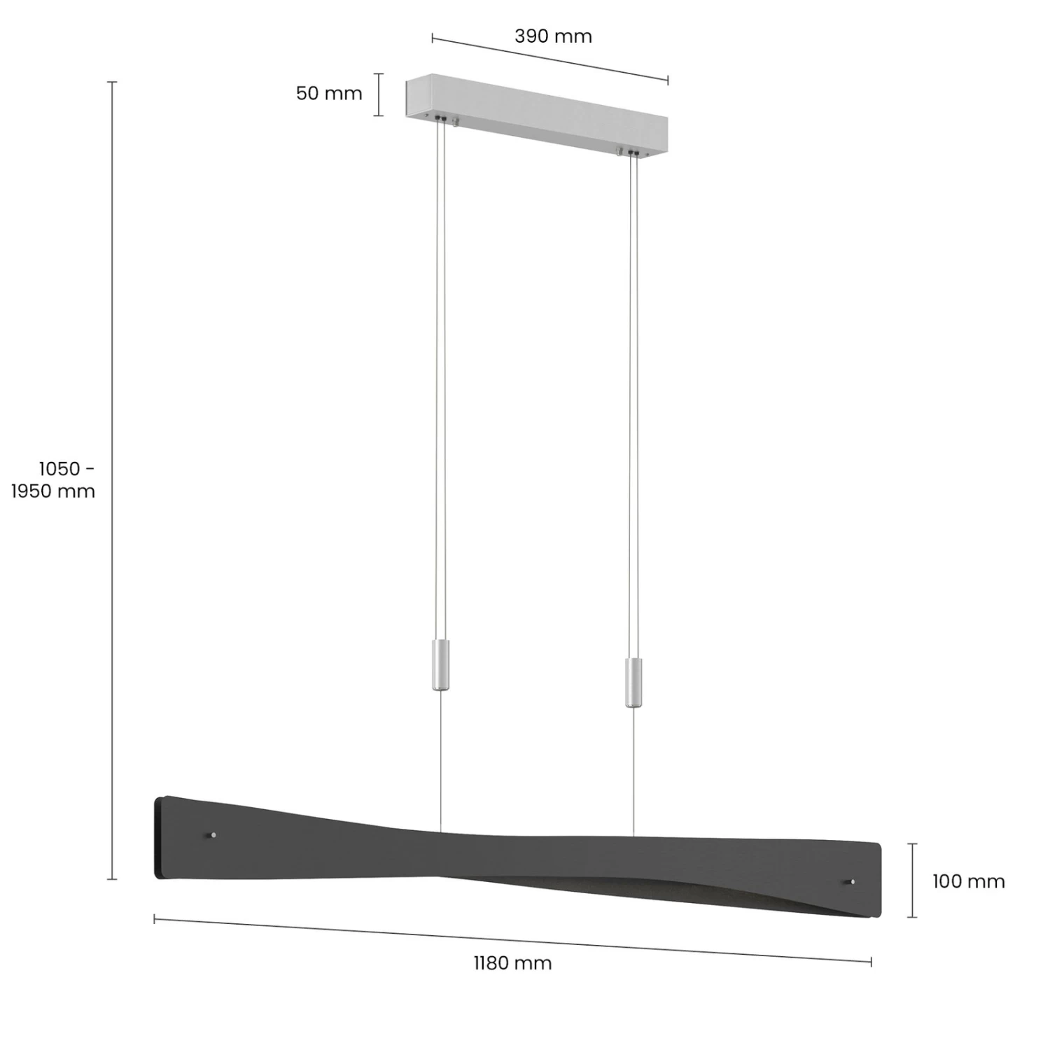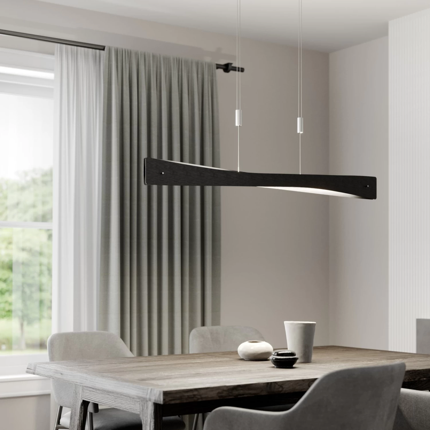Die LED-HĂ€ngeleuchte Lian besitzt eine lĂ€ngliche Form, wobei die Blenden schön geschwungen sind, und kann gut als Esstischbeleuchtung eingesetzt werden. DafĂŒr spricht auch die Höhenverstellbarkeit, denn Lian kann im Betrieb jederzeit von 105 cm bis 195 cm in der Höhe verstellt werden und bietet damit eine erhöhte FlexibilitĂ€t. Die Leuchte ist nach höchsten QualitĂ€tsvorgaben in Deutschland gefertigt worden und hat ein OberflĂ€chenfinish in Schwarz, das in aufwendiger Handarbeit entstanden ist. Die Deckenhalterung stellt einen schönen Kontrast dar, denn sie ist farblich in einem matten Alu-Farbton gehalten und dient als auffĂ€llige ErgĂ€nzung des Gesamtdesigns.