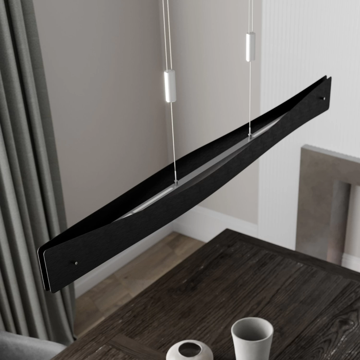 Schwarze, höhenverstellbare LED-HÀngeleuchte Lian mit zwei gebogenen Blenden, in Deutschland gefertigt