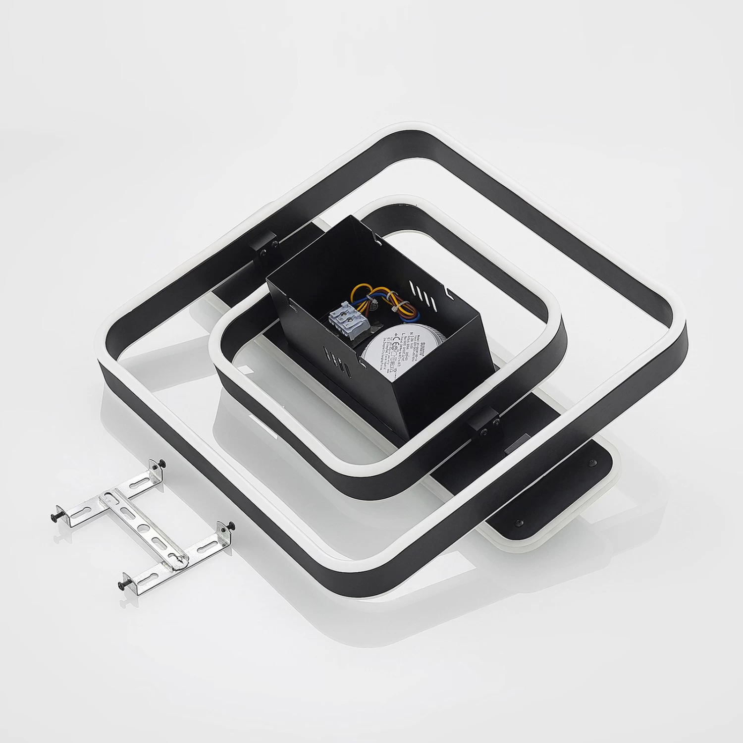 Die LED-Deckenleuchte Linetti ist mit zahlreichen LEDs bestĂŒckt, die unter einer satinierten Schutzschicht aus Silikon sitzen. Gestell und Rahmen der Lampe sind aus Metall gefertigt und in Schwarz gehalten. Bestehend aus zwei unterschiedlich groĂen Leuchtquadraten und einem zentralen Rechteck, das ĂŒber der Kabelabdeckung sitzt, besticht Linetti durch ihre besondere Form.