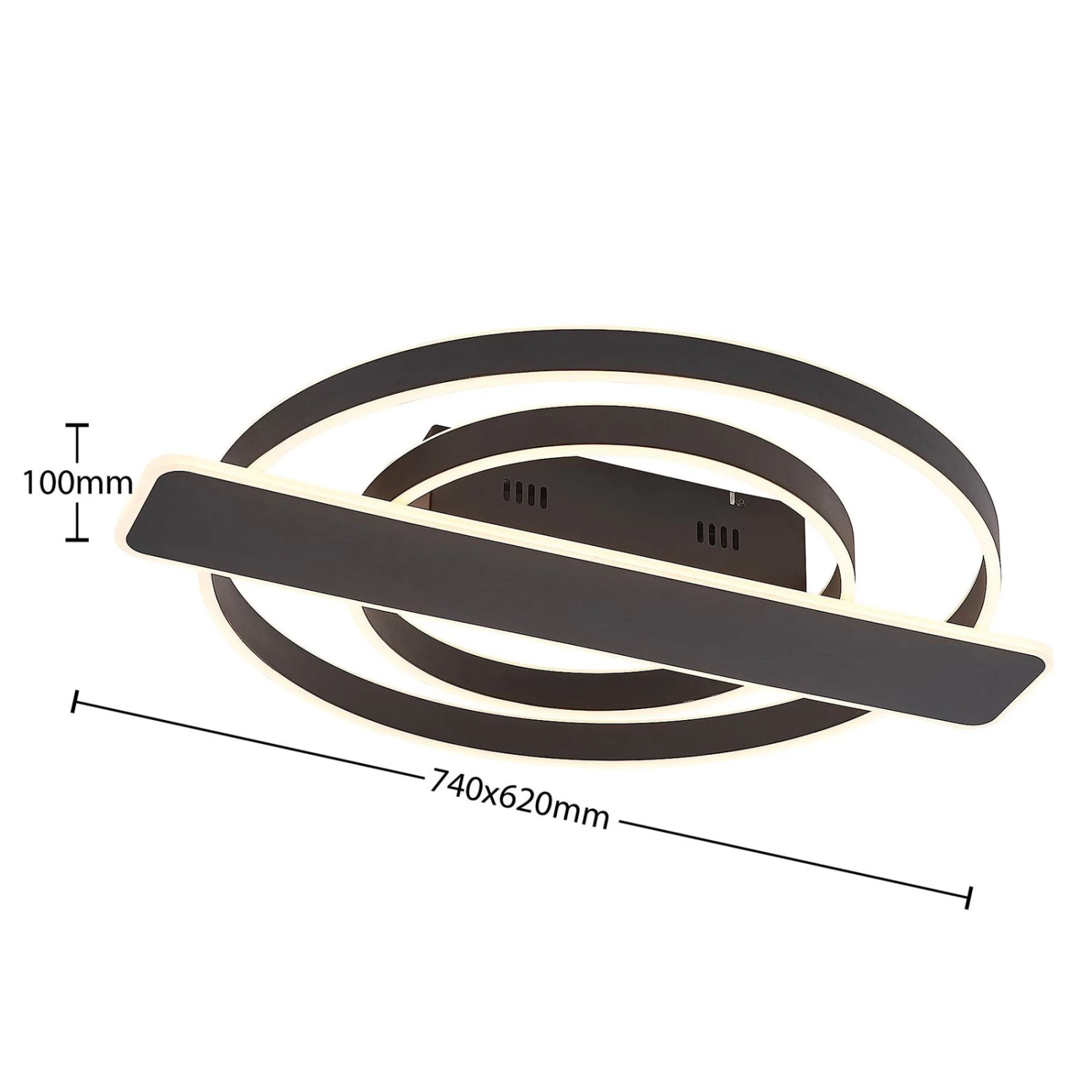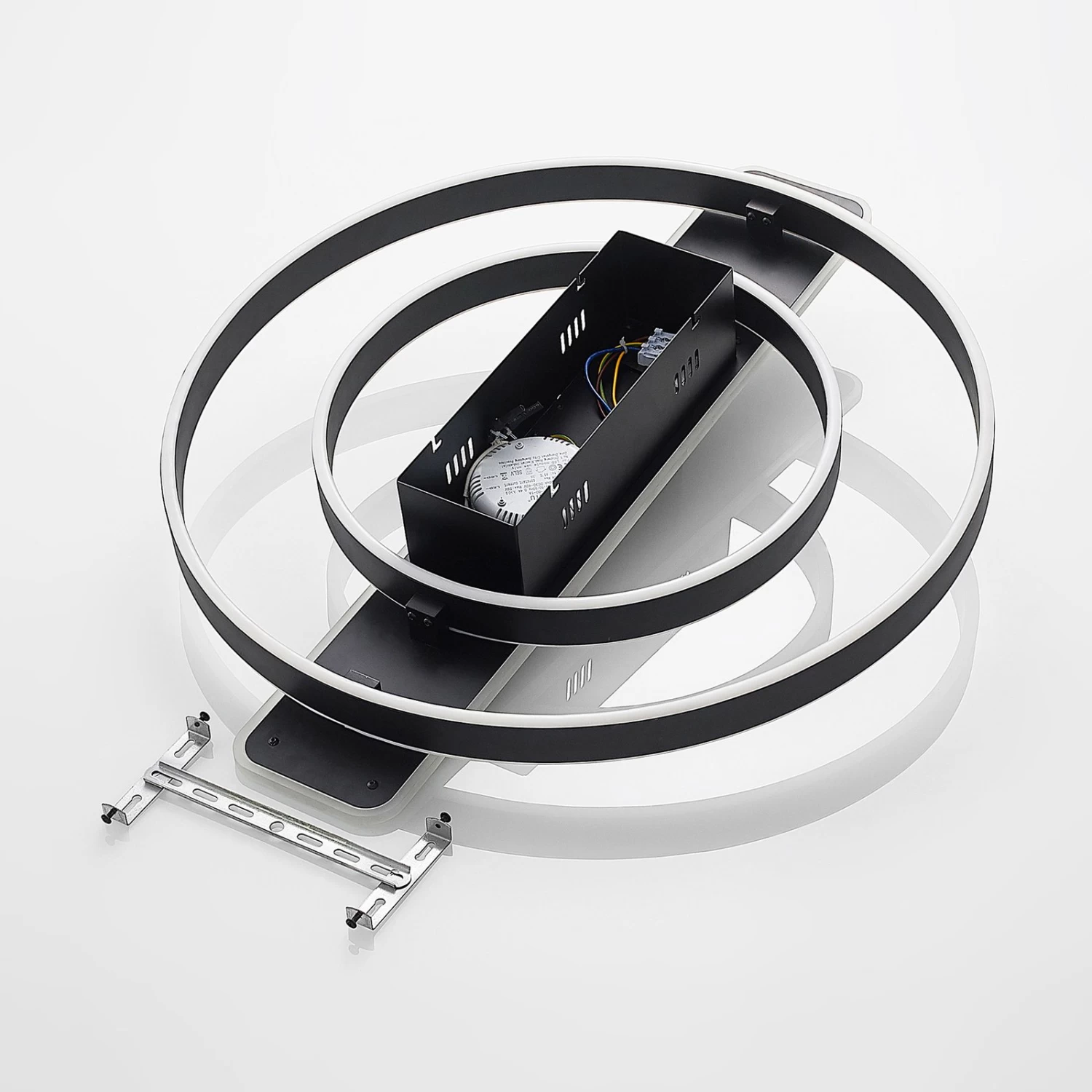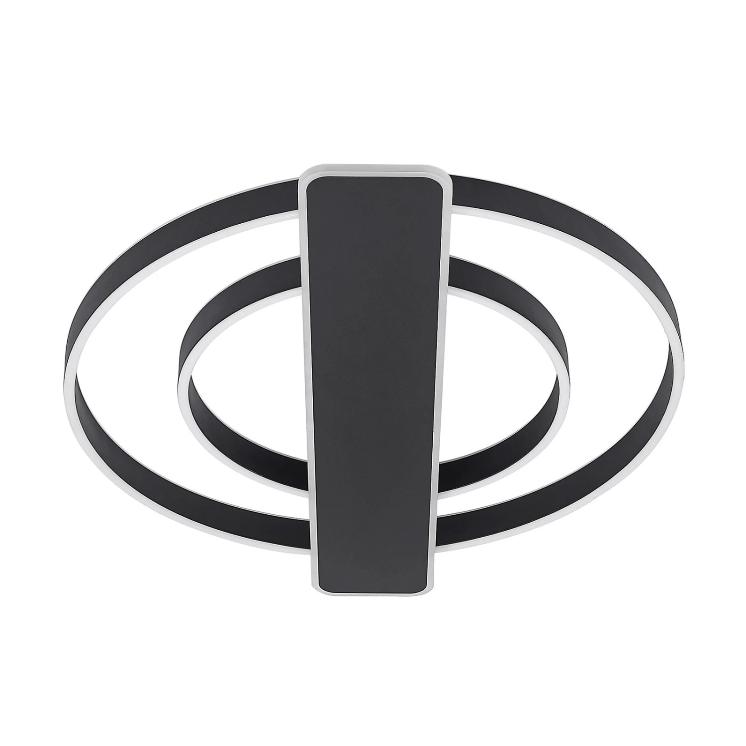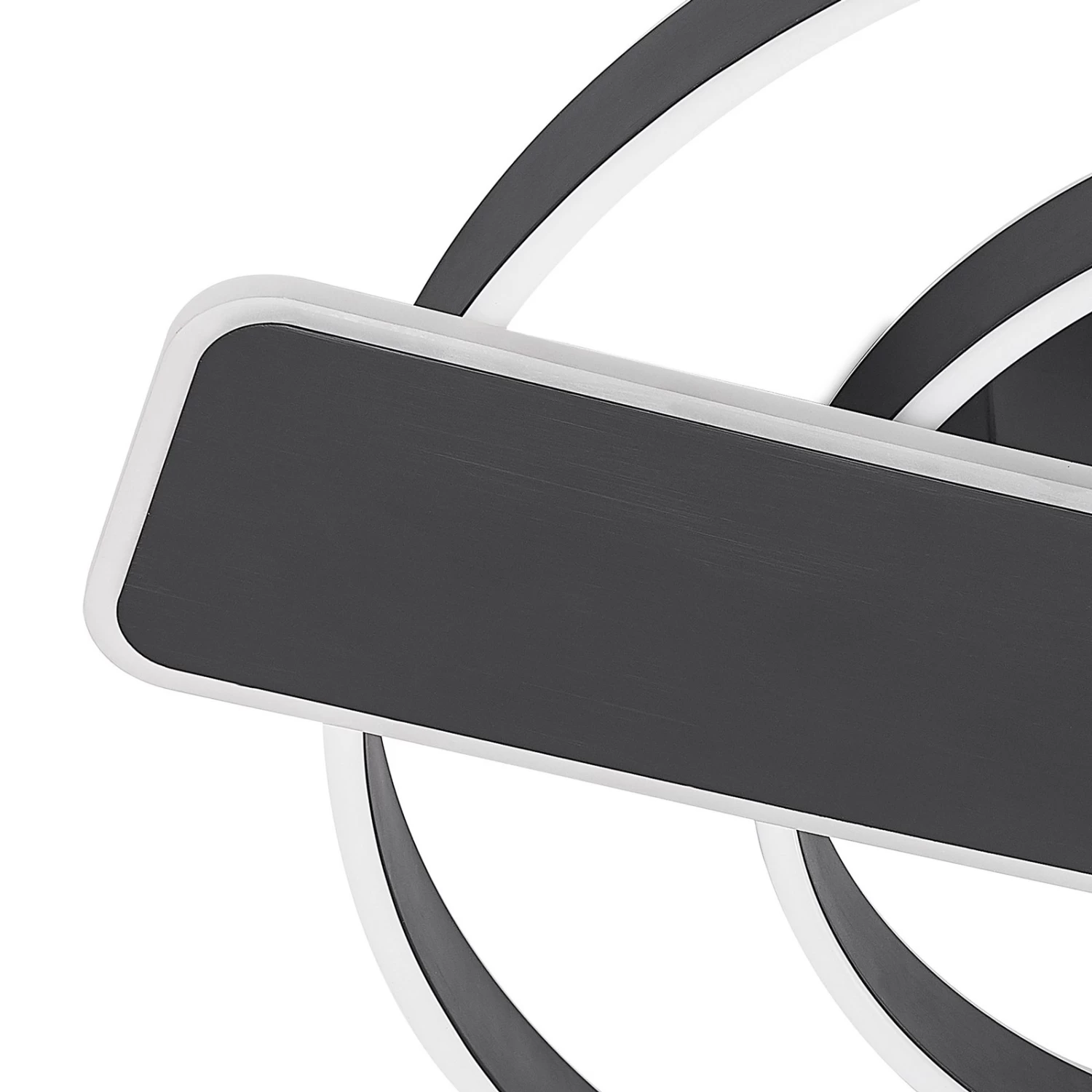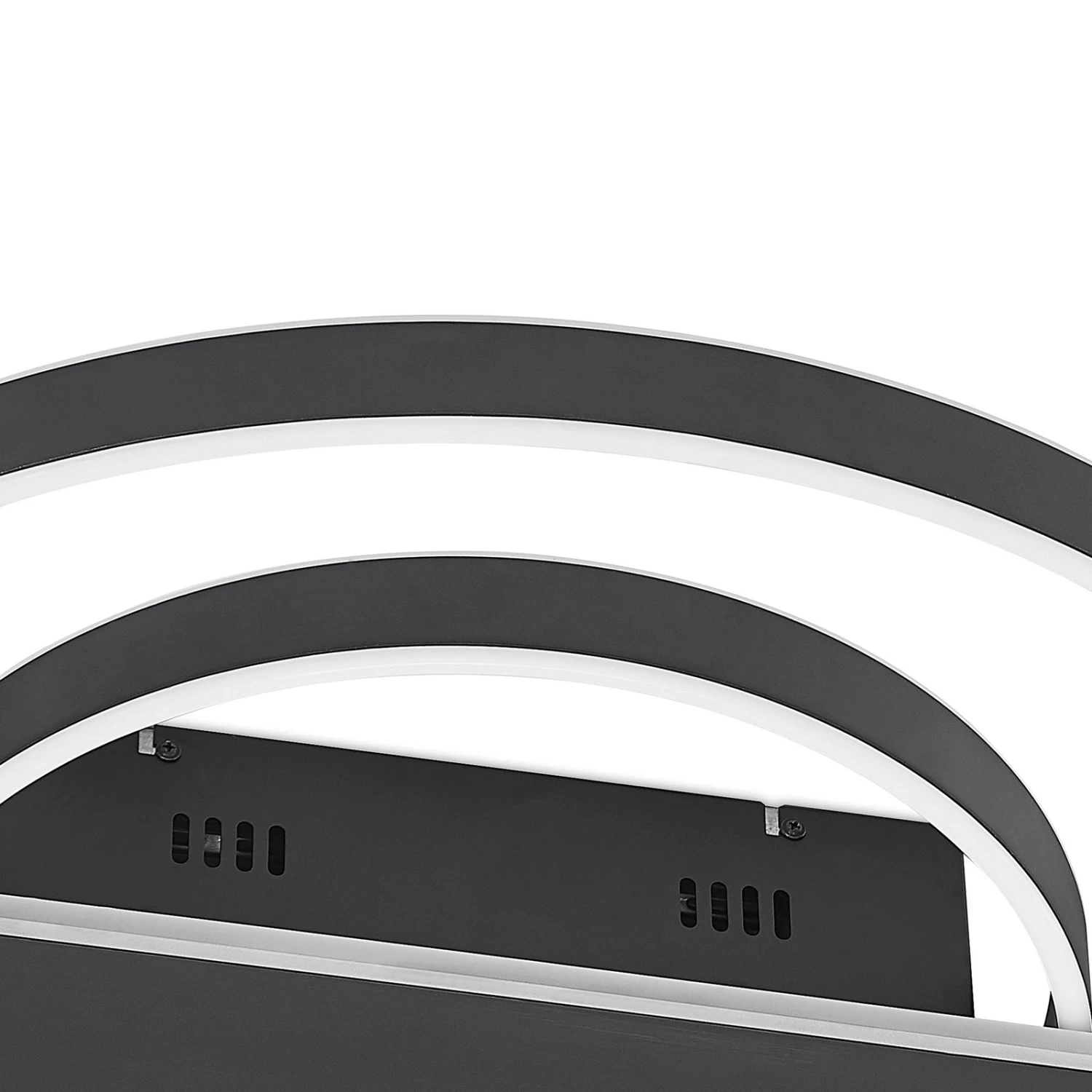 Runde LED-Deckenleuchte Linetti in Schwarz Das MetallgehĂ€use der LED-Deckenlampe Linetti ist ganz in Schwarz gehalten. Die Leuchte setzt sich zusammen aus zwei unterschiedlich groĂen Leuchtkreisen und einem ebenfalls von LEDs umfassten Rechteck, das mittig ĂŒber der Kabelabdeckung sitzt. Durch einen Wandschalter ist es möglich, die Leuchte wie gewohnt ein- und auszuschalten. Durch die 3-Stufen-Dimmtechnik mit integrierter Off-Funktion lĂ€sst sie sich zudem durch mehrmaliges BetĂ€tigen des Schalters in drei unterschiedlichen Stufen ihrer Helligkeit dimmen: 100 %, 50 % und 10 %.