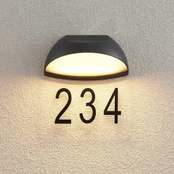 Die moderne LED-Hausnummernleuchte Loena besteht aus einer nach unten strahlenden AuĂenwandleuchte, die ein transparentes Schild auf der Unterseite besitzt, auf das die jeweilige Hausnummer angebracht werden kann. Dazu sind passende Buchstaben und Zahlen im Lieferumfang enthalten, die dann individuell bei Montage auf das Schild angebracht werden mĂŒssen. Das Licht der warmweiĂen LEDs strahlt bei Dunkelheit direkt die Hausnummer und den darunter liegenden Bereich an, sodass auch bei Dunkelheit alles richtig zu erkennen ist.