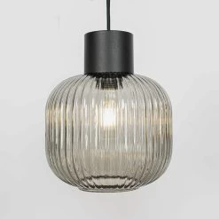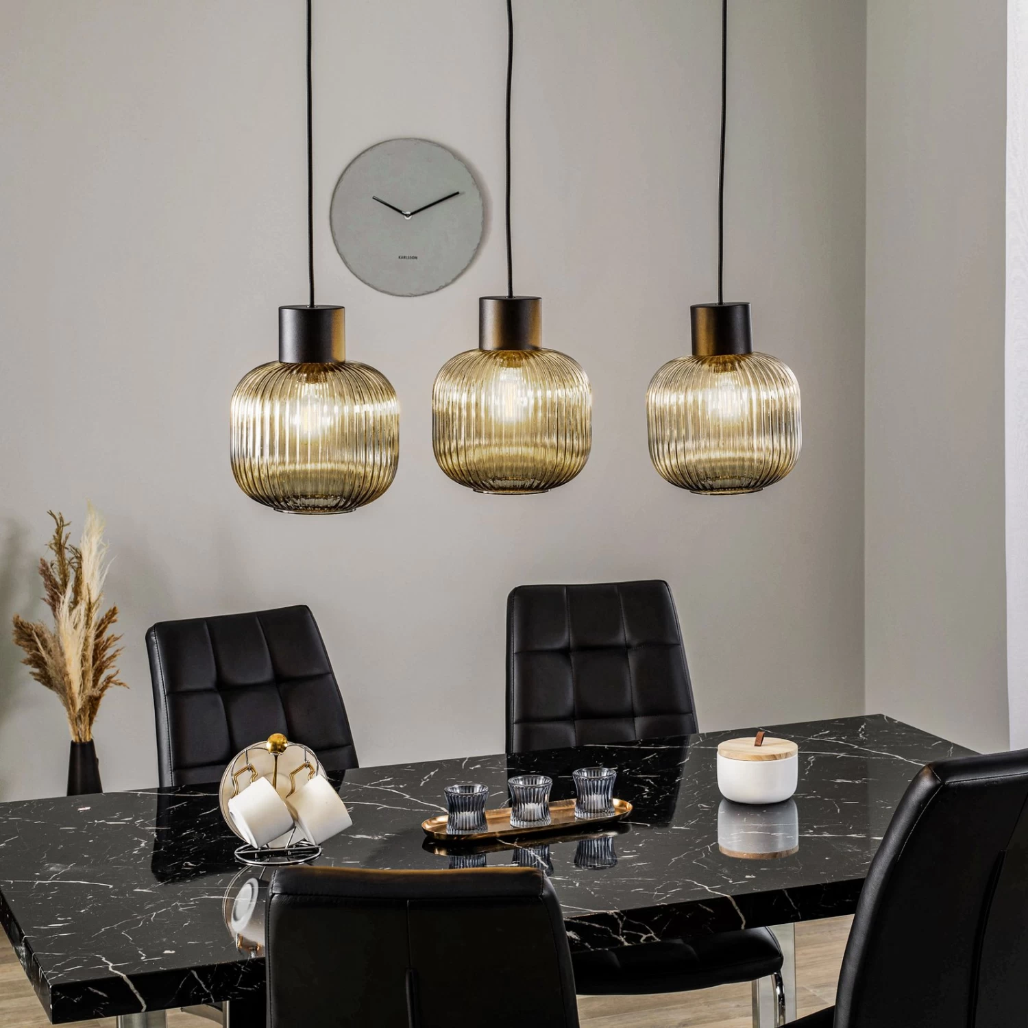 Lomeris ist ein Lichtspender mit drei extravagant aussehenden Rauchglasschirmen, die bauchig sind und eine rillenförmige OberflĂ€chenstruktur besitzen. Sowohl die rauchgraue Tönung als auch die Rillen wirken sich nicht nur auf die Optik auch, sondern sie bestimmen auch maĂgeblich die Lichtwirkung mit, die grundsĂ€tzlich sehr warm und gemĂŒtlich erscheint und von dem besonderen Etwas geprĂ€gt ist. Mit der lĂ€nglichen Form wird ĂŒber dem Esstisch eine gute Ausleuchtung erzielt und die Leuchtmittel sind durch das klare, aber getönte und geriffelte Glas noch relativ gut zu sehen, so dass man bei der Leuchtmittelauswahl darauf achten sollte, dass die Lampen besonders dekorativ aussehen. Das schwarze Gestell wirkt passend zur RauchglasoberflĂ€che und auch die dunklen Textilkabel, die von den Schirmen zum Deckengestell fĂŒhren, werten das Erscheinungsbild auf.