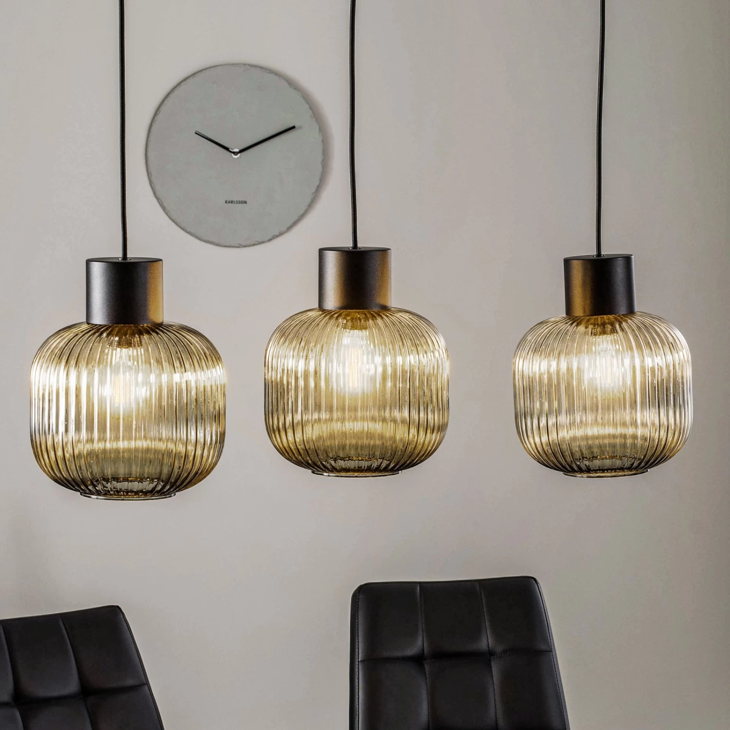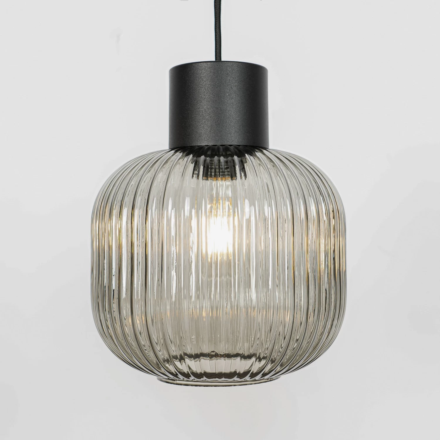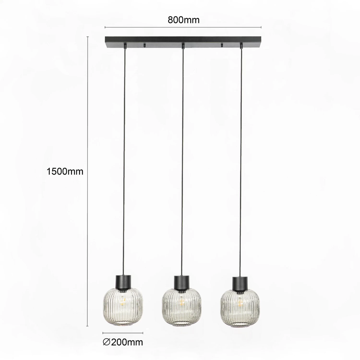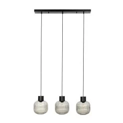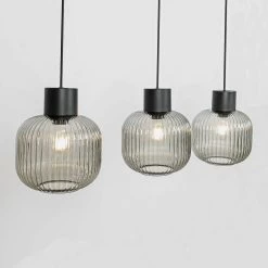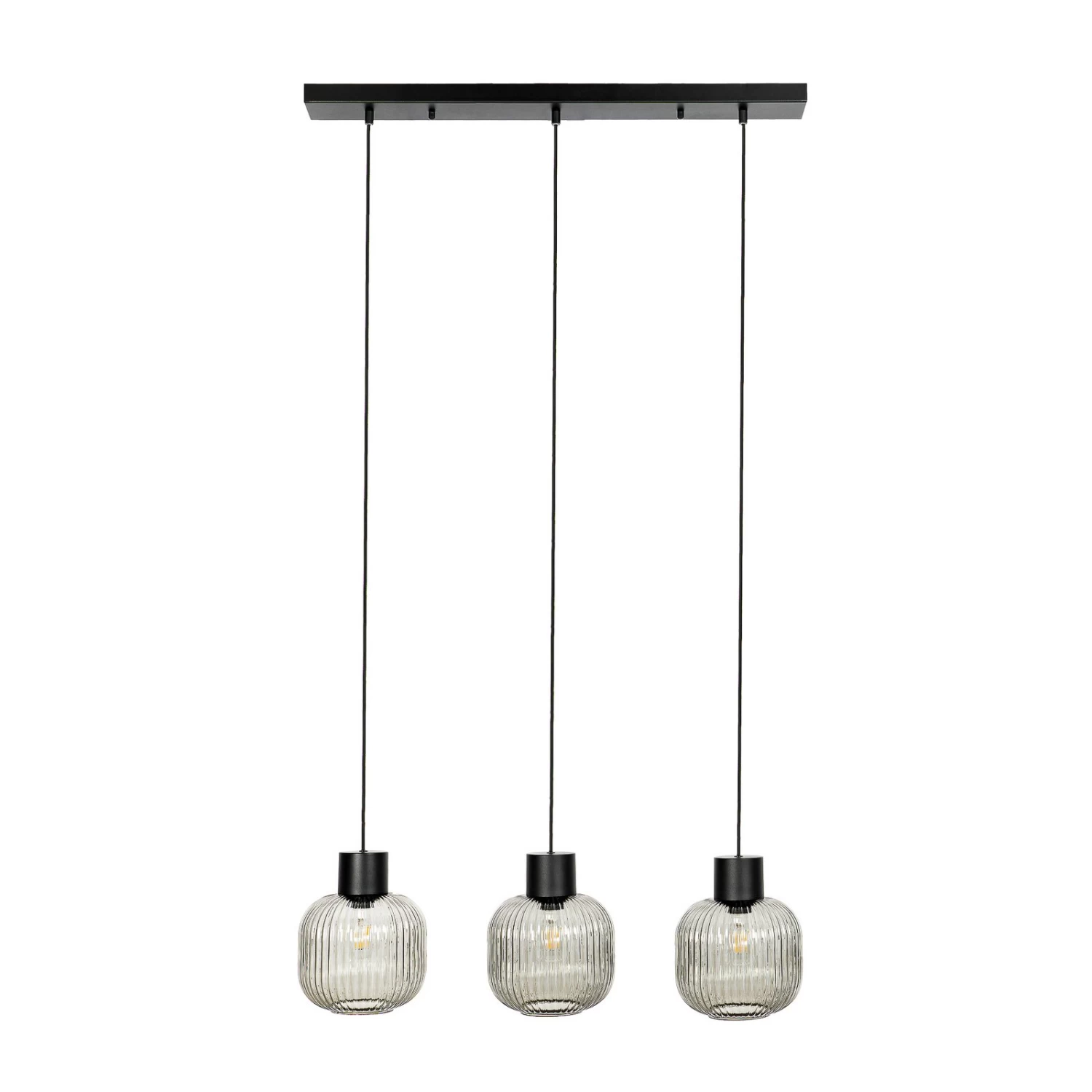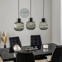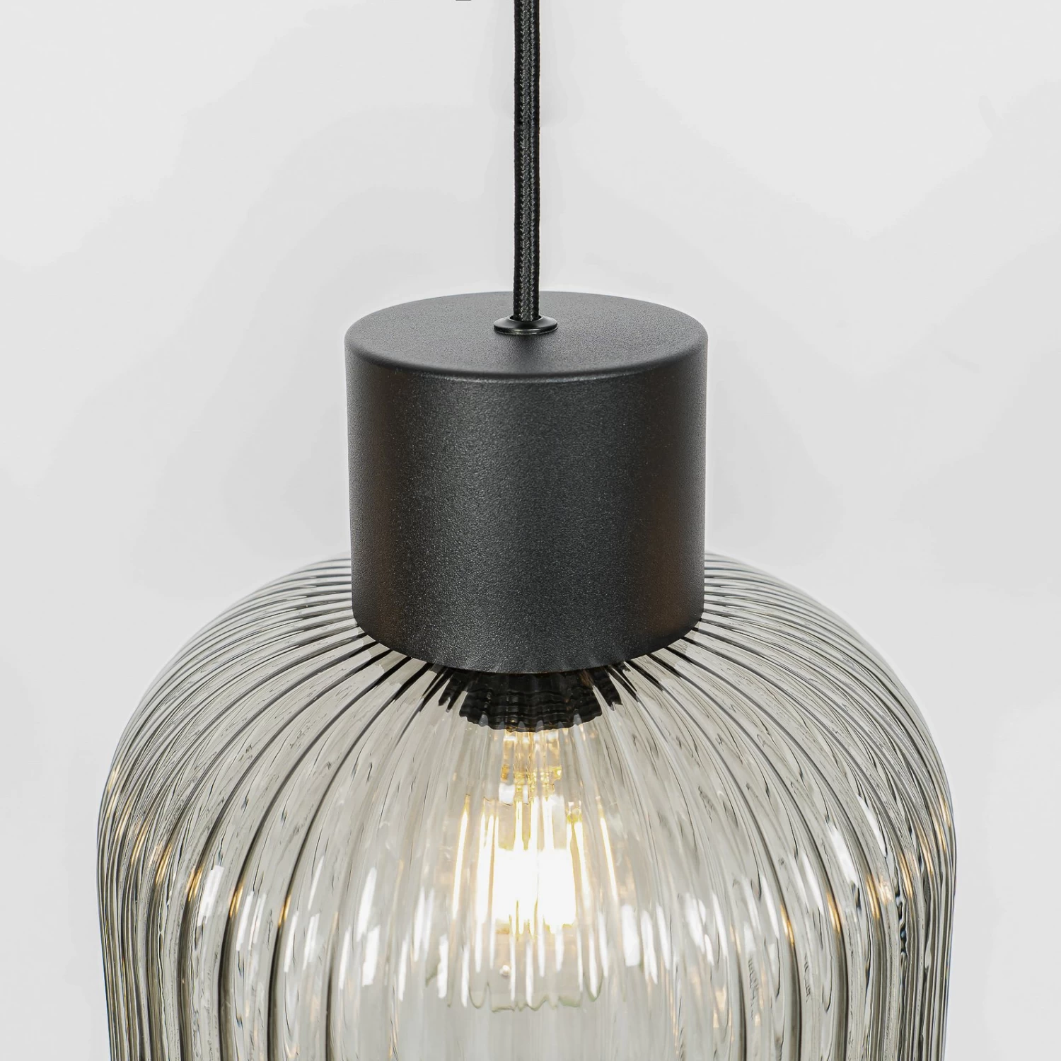 Dreiflammige, rauchgraue Pendelleuchte Lomeris mit geriffelten Glasschirmen – sehr schön fĂŒr den Esstisch