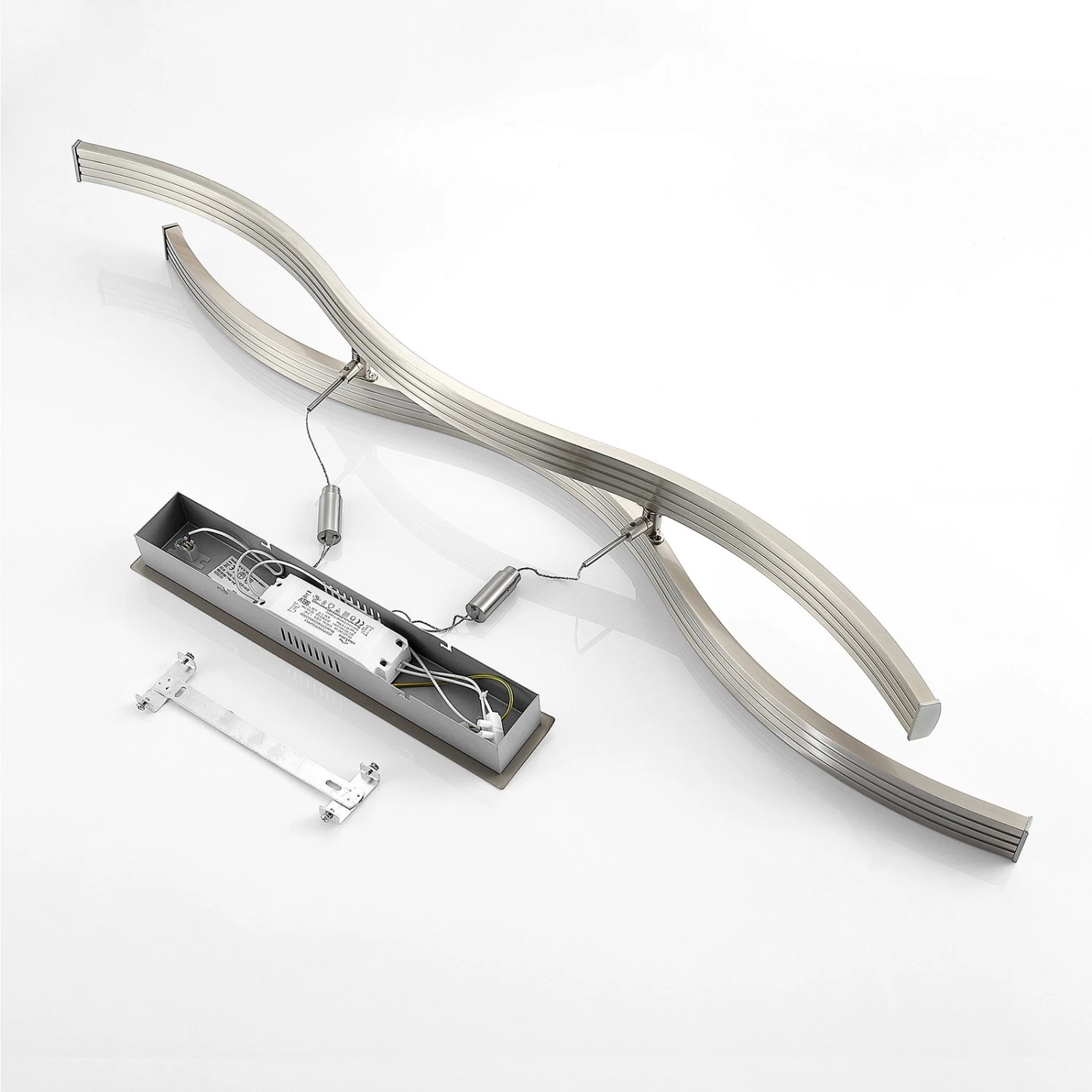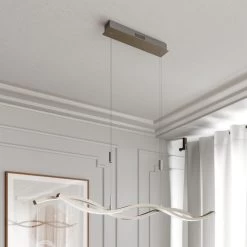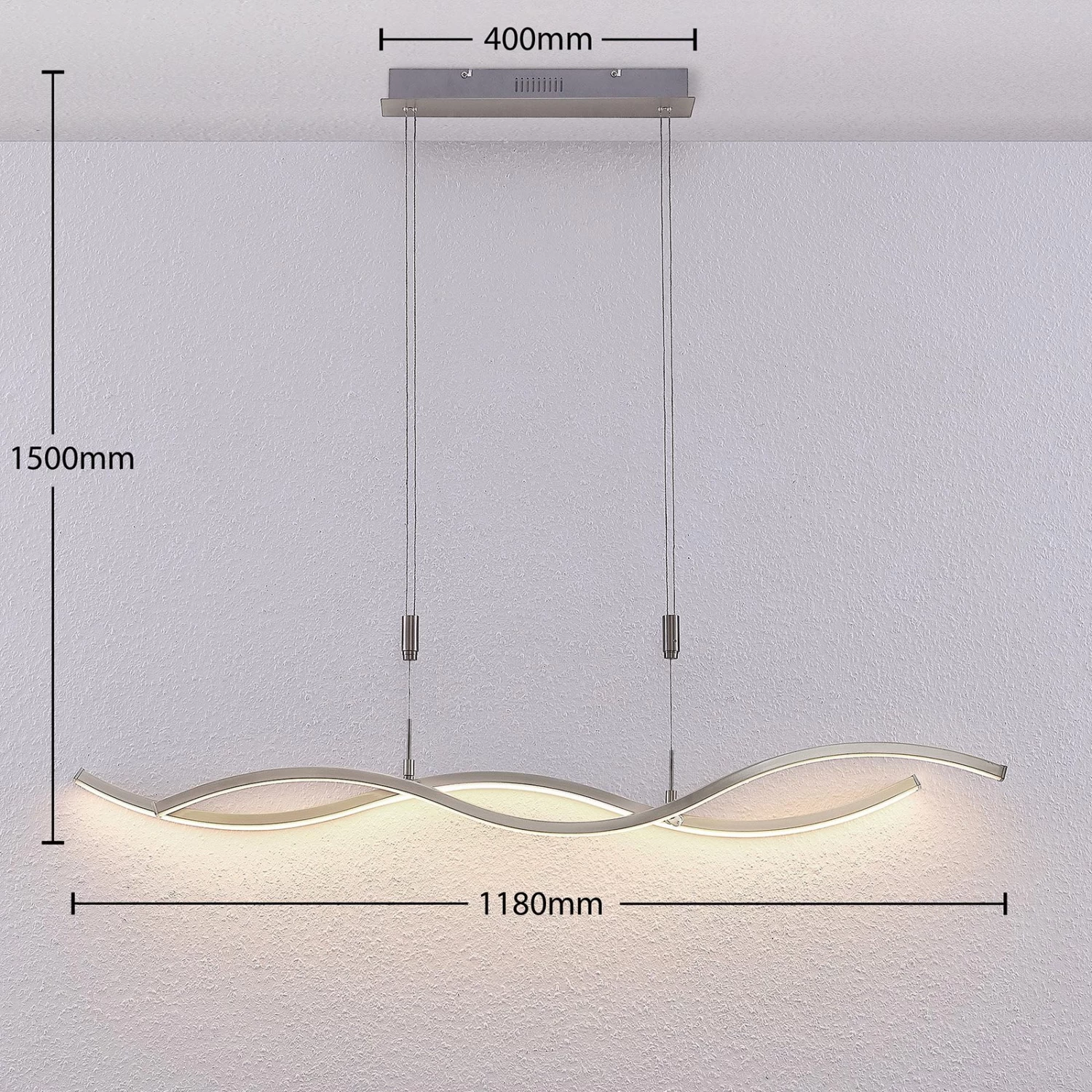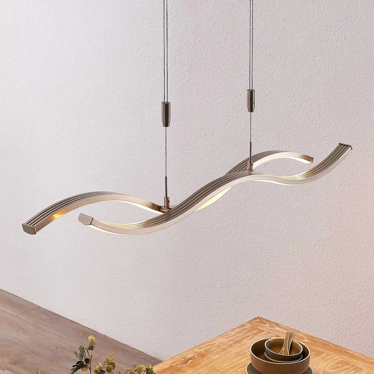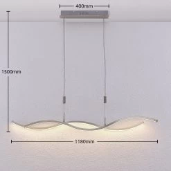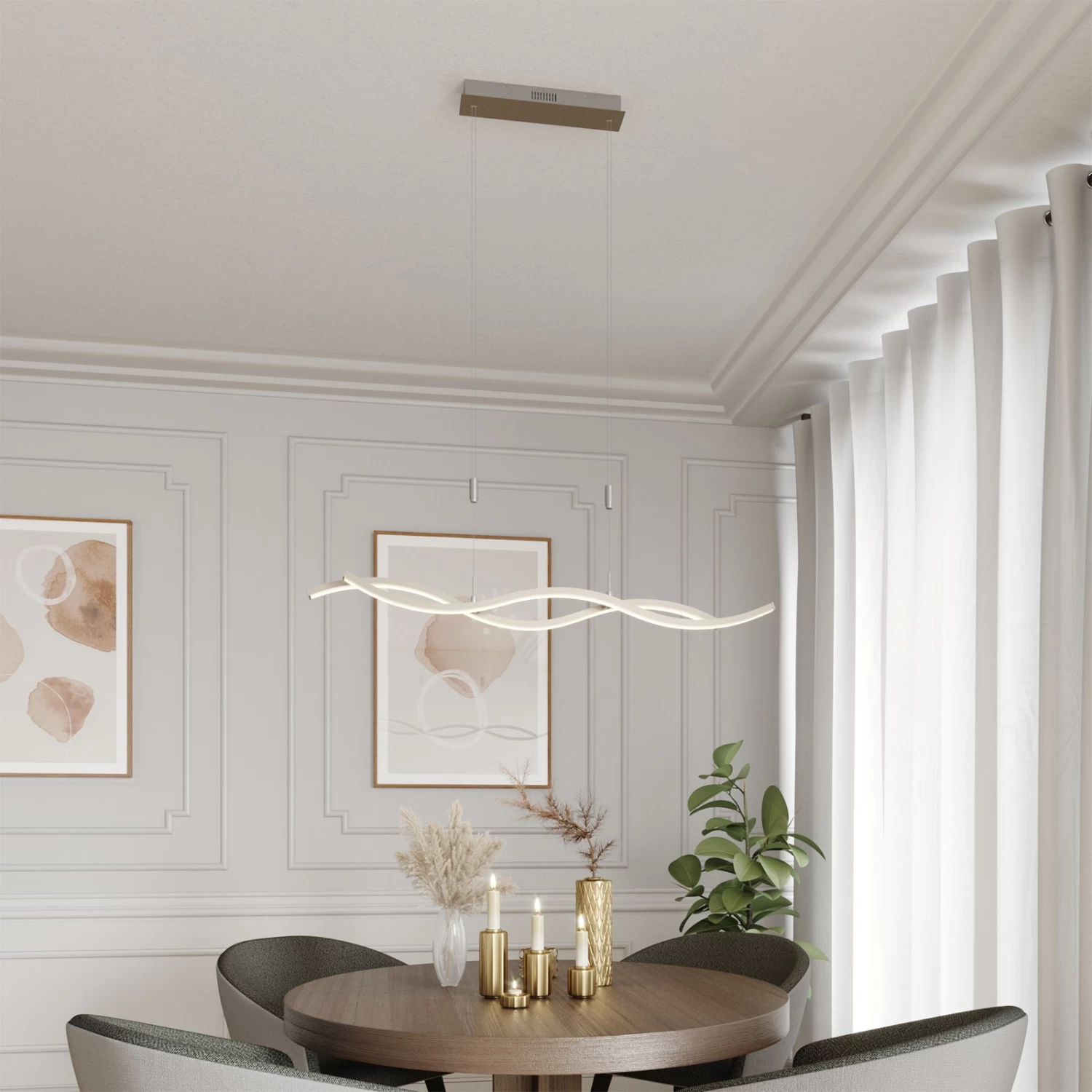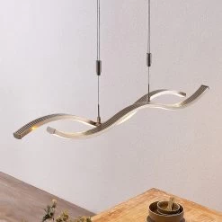 Die puristisch gestaltete LED-Hängeleuchte Mairia bekommt dank der wellenförmigen Elemente ihre besondere Individualität verliehen. Die energiesparenden LEDs wurden an der Unterseite angebracht und sorgen so für eine helle Ausleuchtung mit warmweißem Licht. Die Abhängung ist höhenverstellbar und lässt sich nach Wunsch beliebig anpassen. Dank ihrer länglichen Form eignet sich Mairia perfekt für die Platzierung über einem Esszimmertisch. Über den Wandschalter kann die Lichtintensität in drei Stufen gedimmt werden, sodass sich die Leuchte für ein behagliches Abendessen oder einen spannenden Spieleabend eignet.