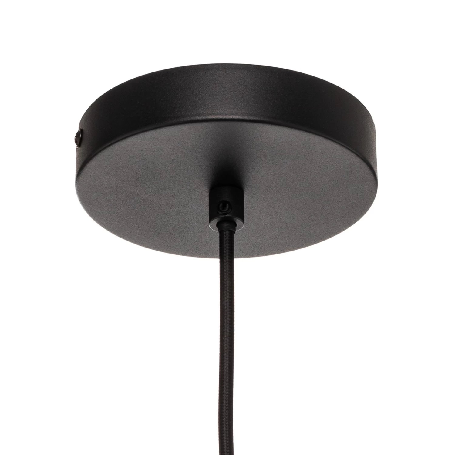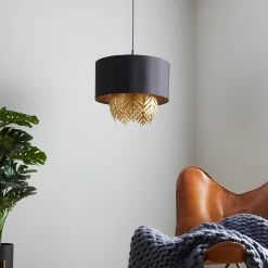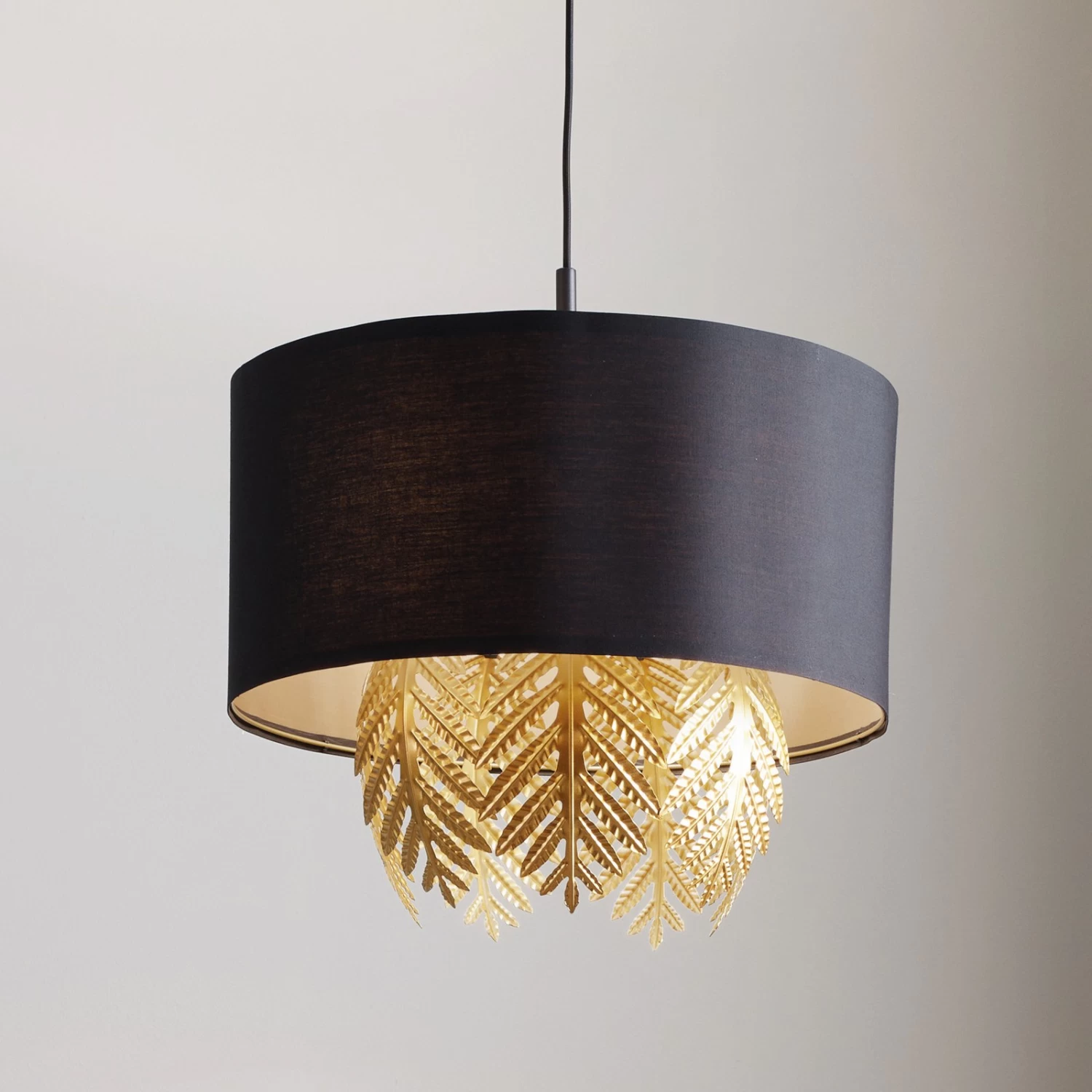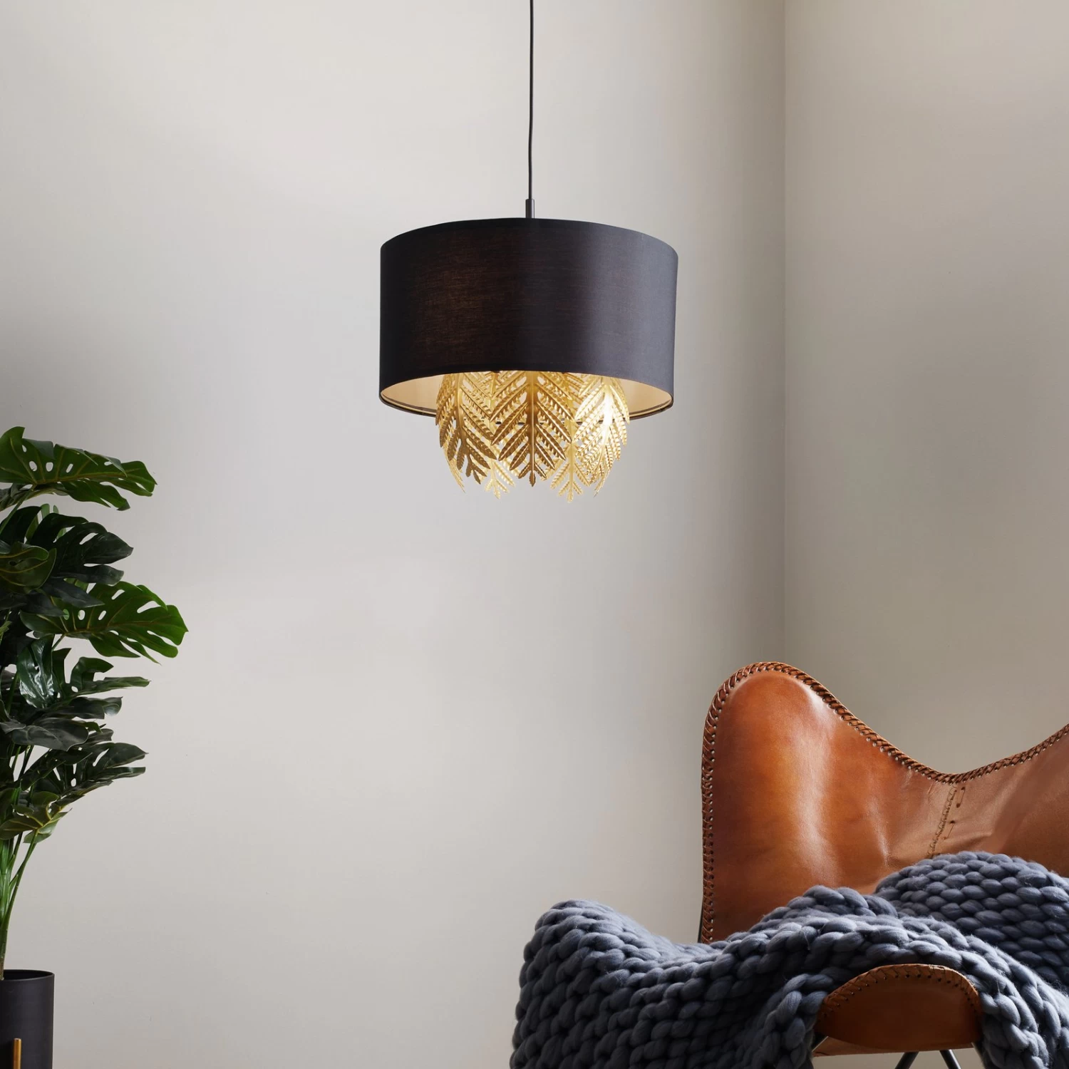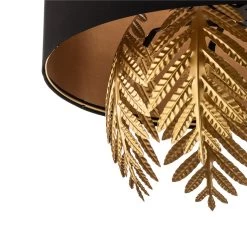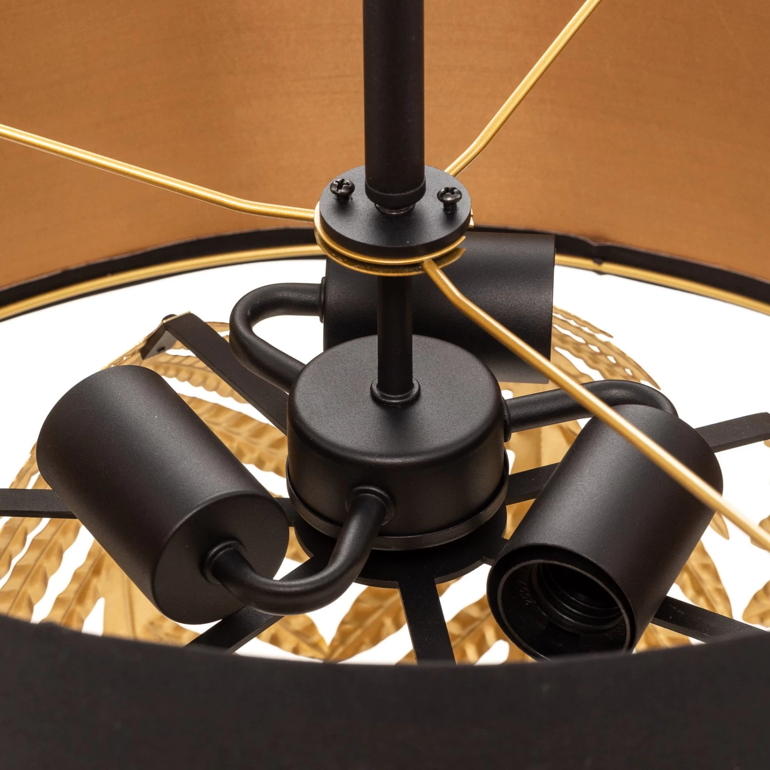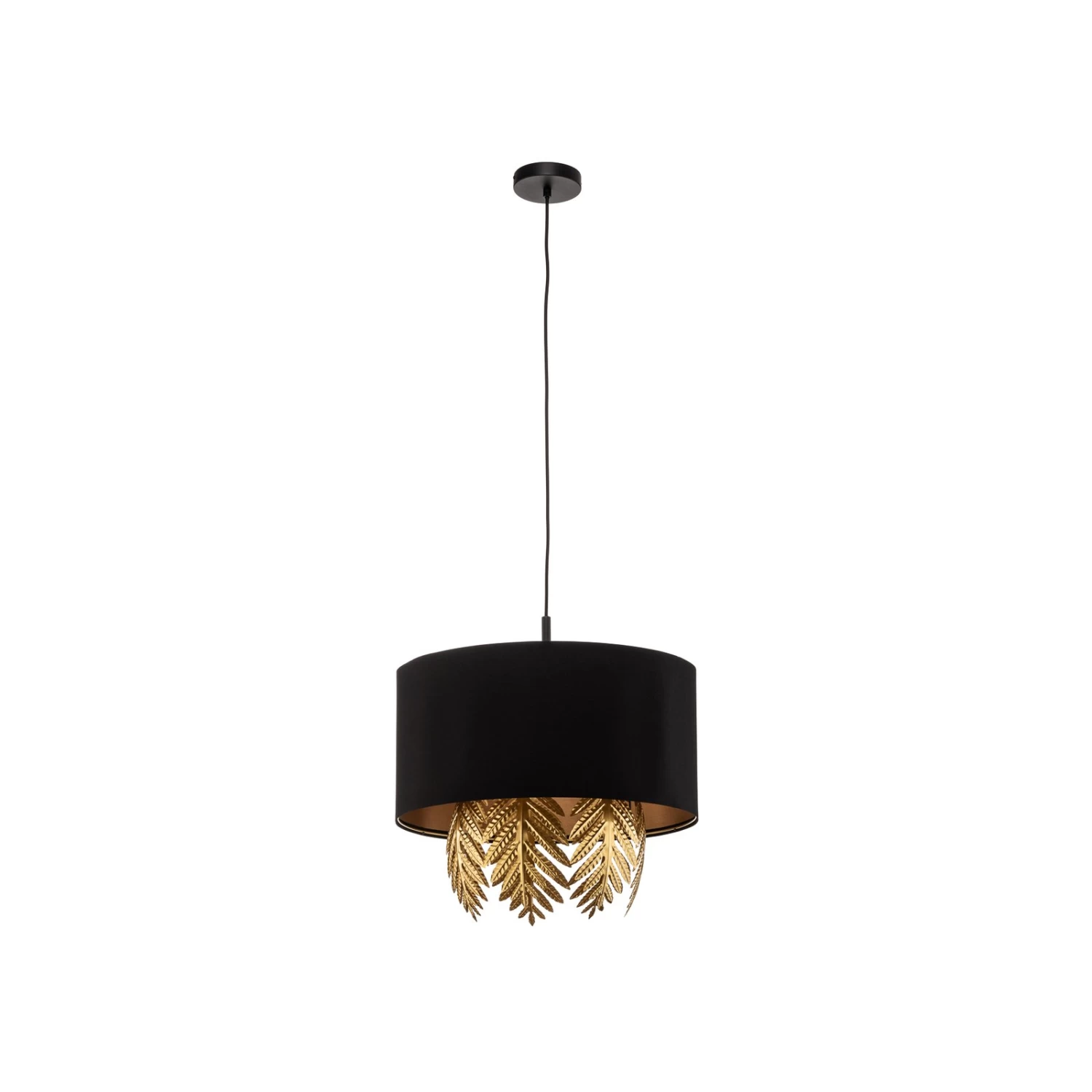 Runde Pendellampe Malviras mit goldenem Metalldekor in Blattoptik und schwarzem Stoffschirm