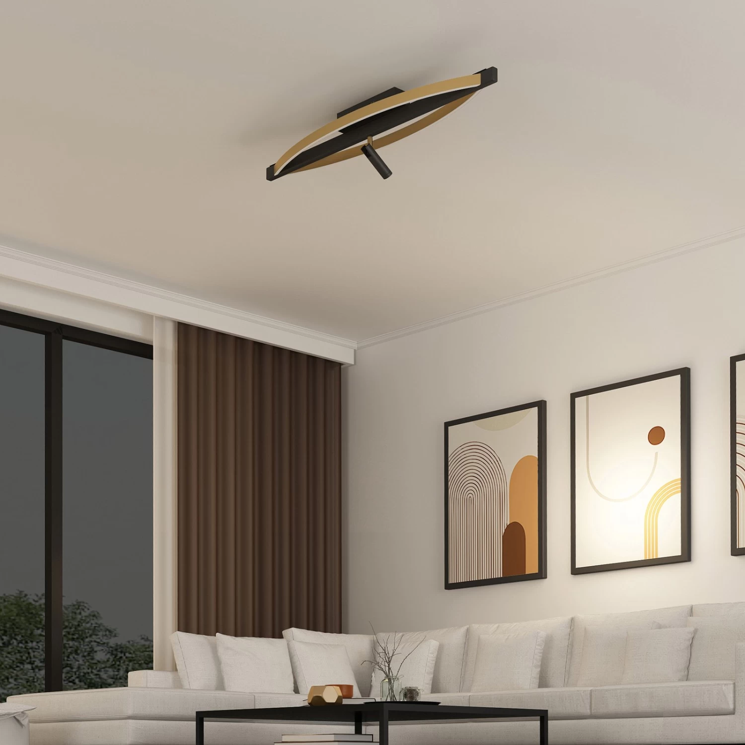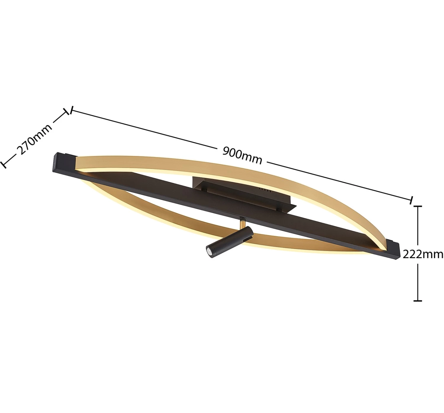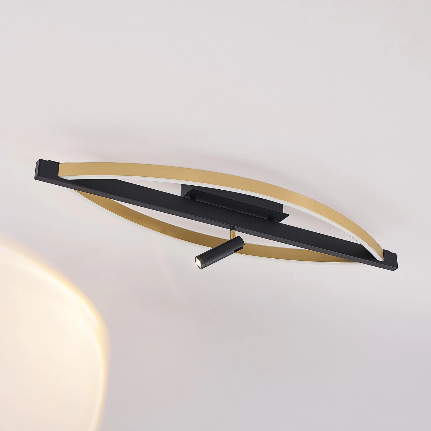 Dreistufig dimmbare LED-Deckenleuchte Matwei mit seitlichen Bögen in Messing und zusÀtzlichem Spot in Schwarz