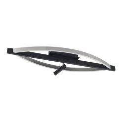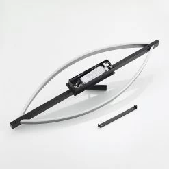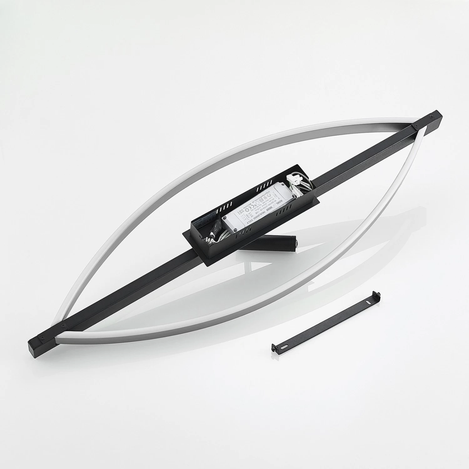 Mittig auf dem Baldachin ist eine schwarze Metallstange platziert, an der zwei elegant gebogene Flanken gespannt sind. Diese sind innen mit LEDs ausgestattet, wĂ€hrend auĂen die OberflĂ€che in Nickel fein verarbeitet wurde. Die LEDs spenden ein warmweiĂes, angenehmes Umgebungslicht, das gleichmĂ€Ăig im Raum verteilt wird.