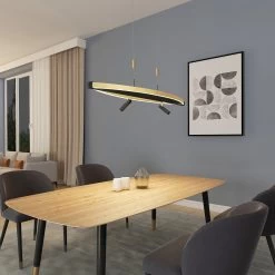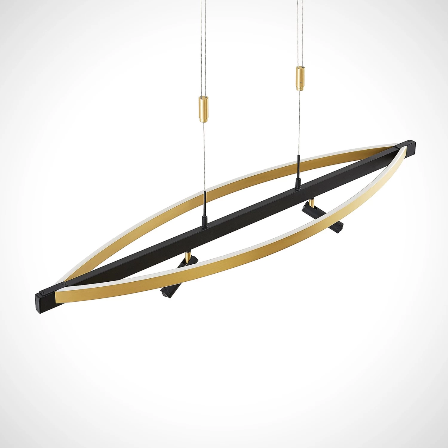 Matwei ist eine Pendellampe, die mithilfe von warmweiĂen LEDs betrieben wird und eine sehr gute Leuchtkraft besitzt. Damit ist die Leuchte hervorragend fĂŒr den Einsatz ĂŒber einem Esstisch geeignet. Die Leuchte setzt sich zusammen aus einem schwarzen Balken sowie zwei seitlich aufgespannten, bogenförmigen Flanken, die ein edles Messingfinish in gebĂŒrsteter Optik besitzen. Das Design der Leuchte ist somit modern und einzigartig und geprĂ€gt von Dynamik und Eleganz, wĂ€hrend der gewĂ€hlte Farbkontrast nicht nur sehr harmonisch erscheint, sondern gemeinsam mit der hochwertigen OberflĂ€chenverarbeitung auch den luxuriösen Ausdruck der Pendelleuchte hervorragend unterstreicht.