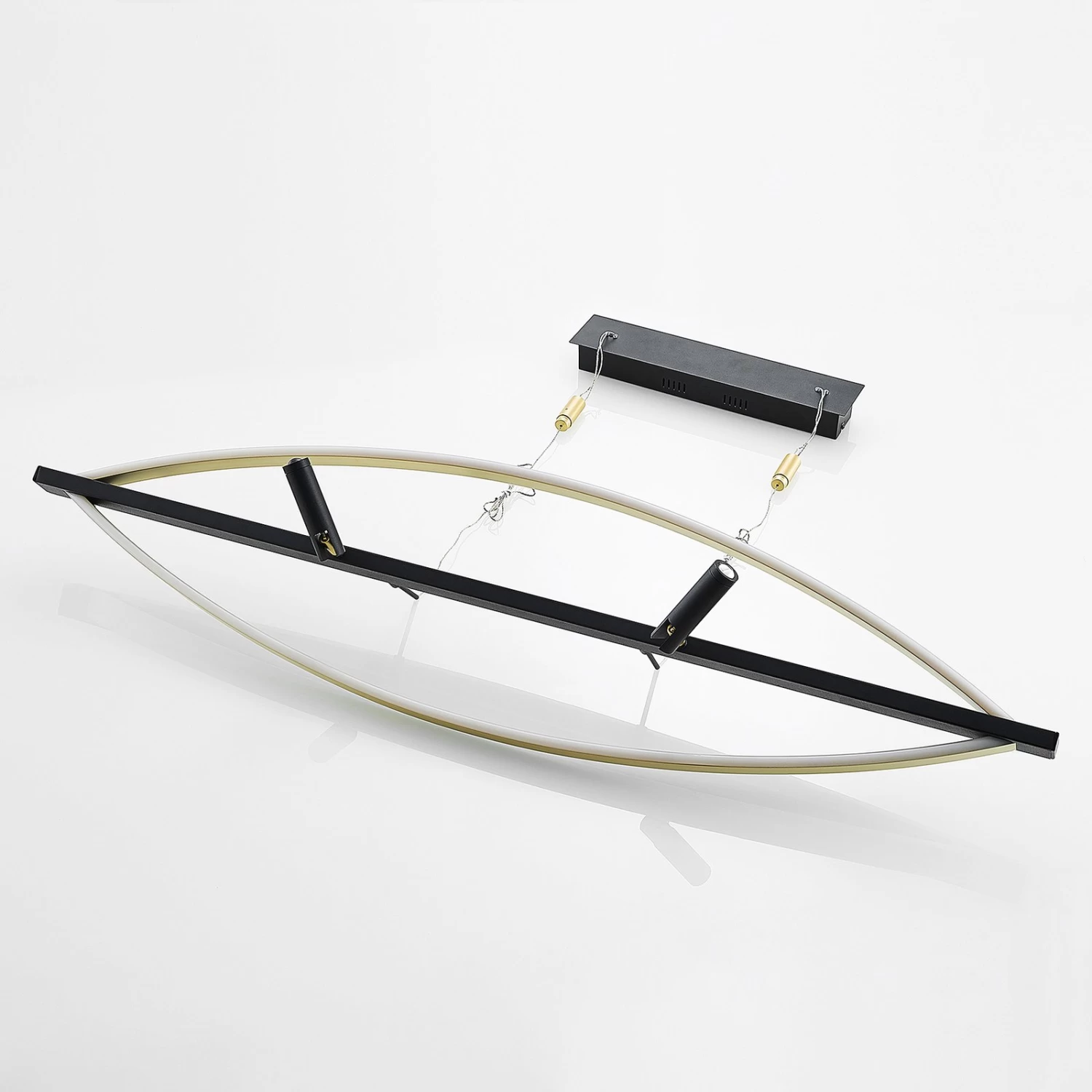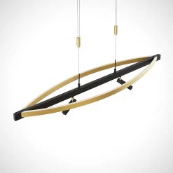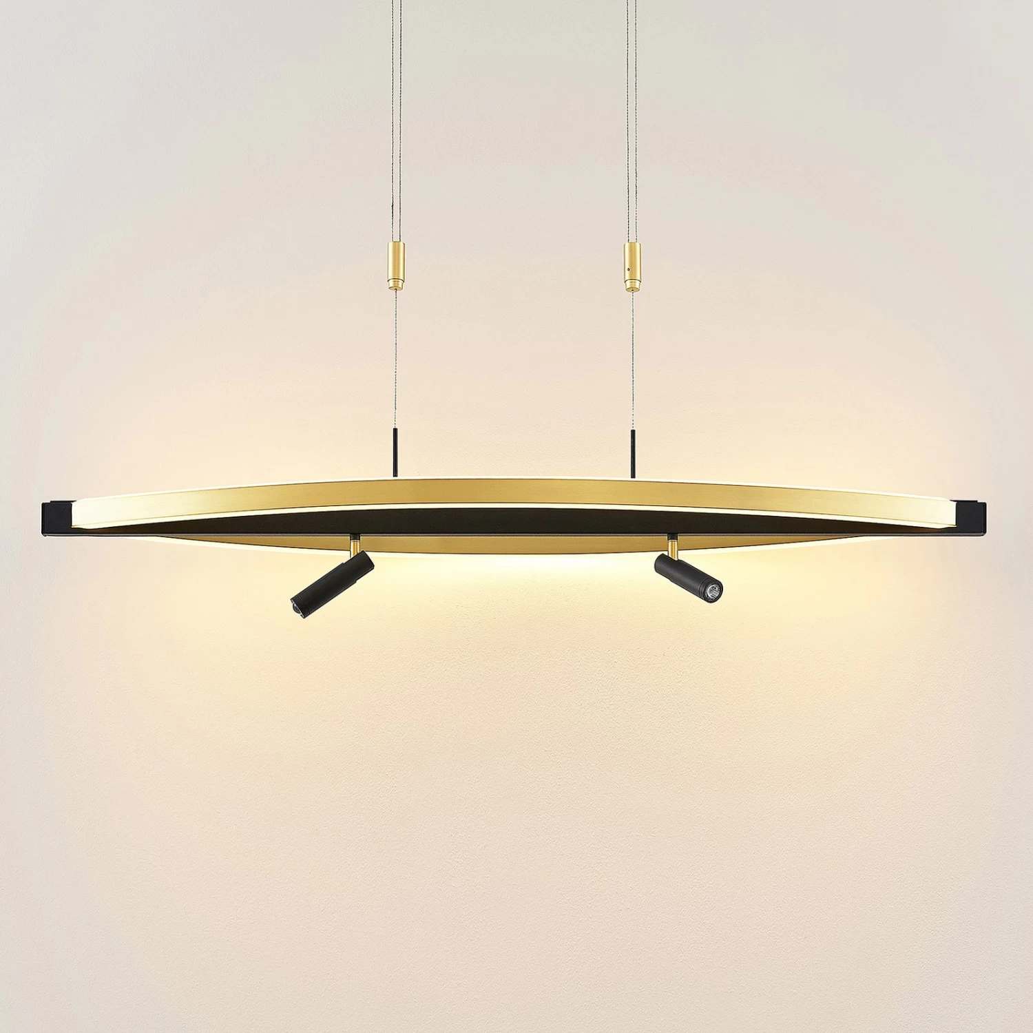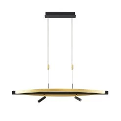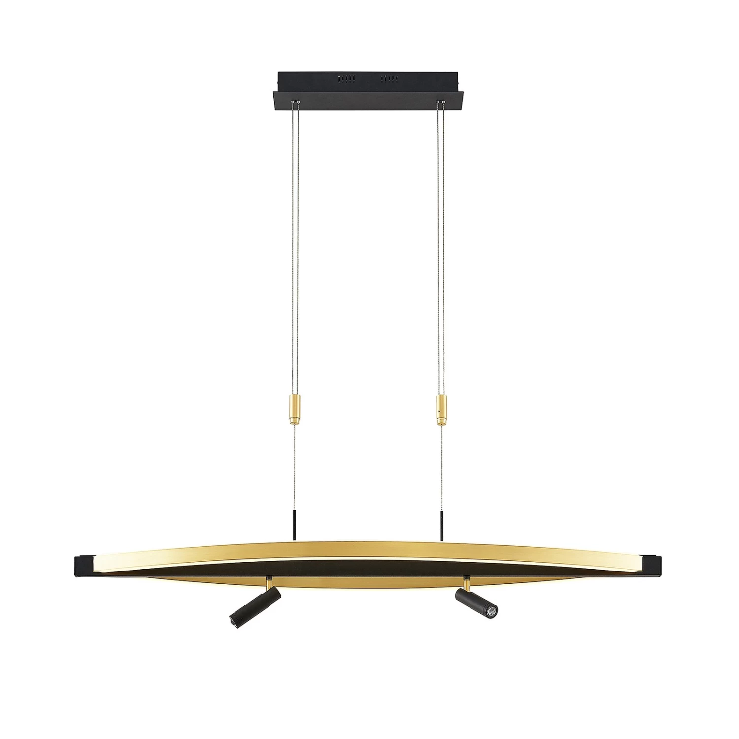 Trendiges Design in gebĂŒrstetem Messing und Schwarz: die lĂ€ngliche, höhenvestellbare LED-Pendellampe Matwei mit dreistufig dimmbarem Licht und zwei separaten Strahlern