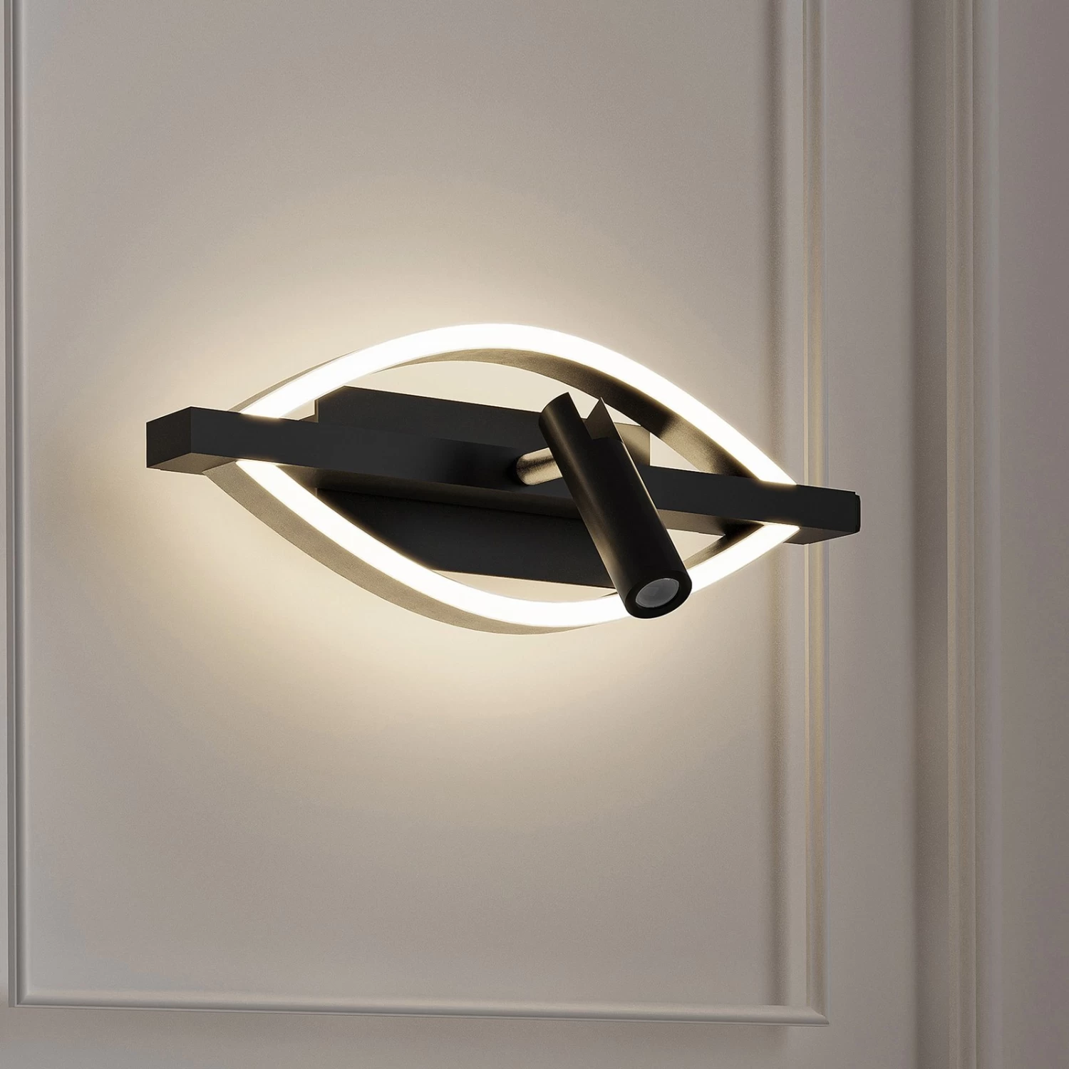 Diese schöne Lichtquelle stammt aus der Leuchtenserie Matwei, die mit ihrer hochwertigen Verarbeitung und einem ansprechenden Design hervorsticht. Das Konzept ist geprĂ€gt von Dynamik und Eleganz, die sich harmonisch zu einem stilvollen Gesamteindruck verbinden. Das Gestell der LED-Wandlampe Matwei wurde in einem klassischen Schwarz gehalten und besteht aus einer rechteckigen Montageplatte, an der ein Metallbalken befestigt ist. Am Balken sind zwei bogenförmige Flanken aufgespannt, die mit einem edlen Nickel-Finish versehen wurden. Diese beherbergen zahlreiche LEDs in warmweiĂer Lichtfarbe, die eine wohlige Gesamtbeleuchtung erschaffen.