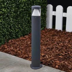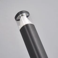 Die Sockelleuchte Milou ist aus Aluminium-Druckguss gefertigt und prĂ€sentiert sich in zeitgemĂ€Ăer Optik. Die OberflĂ€che des dreikantigen Aluminium-Korpus ist anthrazitfarben lackiert, im oberen Teil befindet sich ein Einsatz aus Polycarbonat, hinter dem das leuchtstarke LED-Leuchtmittel von Osram sitzt.