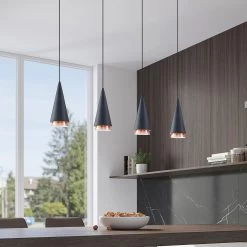 Naoh ĂŒberzeugt mit einem sehr modernen Design und macht sich hervorragend als Beleuchtung ĂŒber einem Esstisch. Die lĂ€ngliche Form und das nach unten gerichtete Licht sorgen fĂŒr eine angemessene Tischausleuchtung, ohne dass es zu lĂ€stigen Blendungen kommt. Stattdessen ist das Licht sanft und gleichmĂ€Ăig, da es vom Betrachter nur indirekt wahrgenommen wird, ohne dass man die Lichtquelle direkt sieht. Die schwarze OberflĂ€chengestaltung passt zu modernem Interieur und die kupferfarbenen Details der zweilagigen Kegelschirme beeinflussen nicht nur die Optik mit einer individuellen Note, sondern tragen auch zu einer wĂ€rmeren Lichtwirkung bei. Sehr schön fĂŒr moderne, stilvolle Einrichtungen!