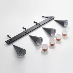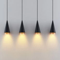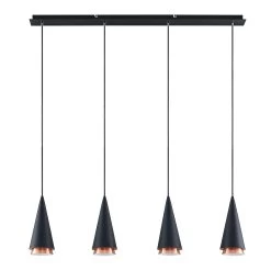 Vierflammige Pendelleuchte Naoh mit kegelförmigen Schirmen in Schwarz mit Kupferdetails