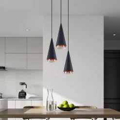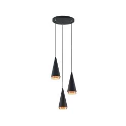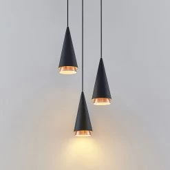 Dreiflammige Pendelleuchte Naoh mit schwarzen Kegelschirmen und kupferfarbenen Details